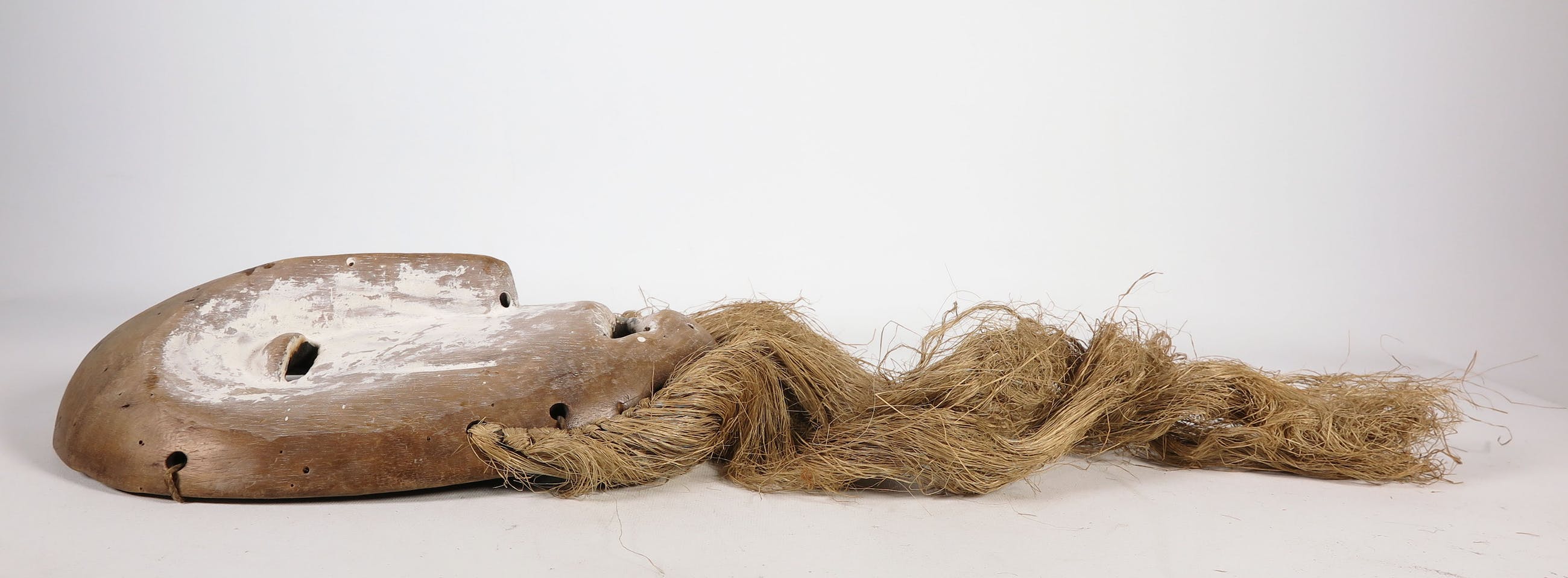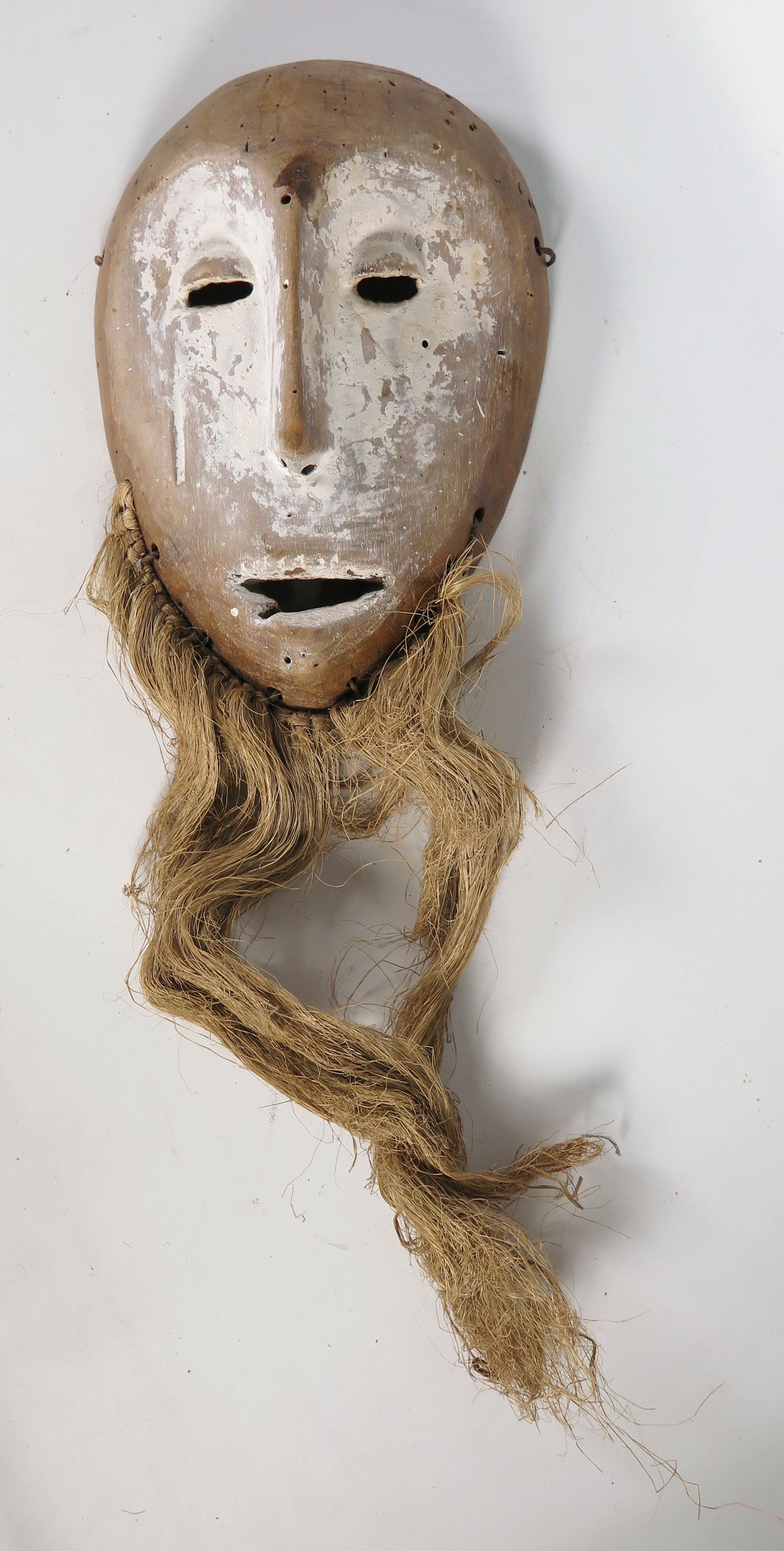 Deels wit geschilderd en gestoken houten Lega (stam) masker, met open ogen en mond, voorzien van plantenresten.