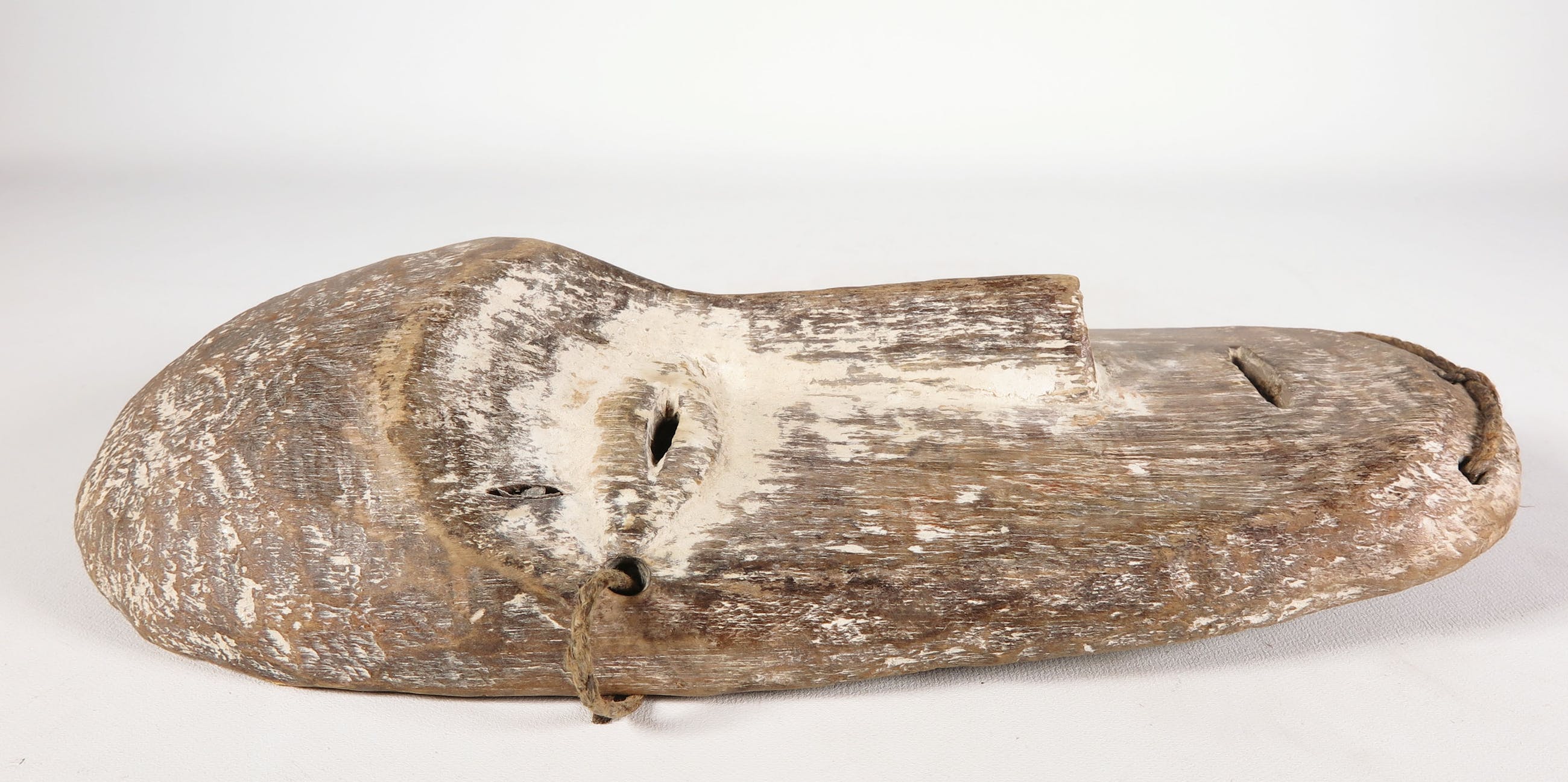 Deels wit geschilderd en gestoken houten Lega (stam) masker, met spleetogen en open mond. Herkomst: Democratische Republiek Congo.