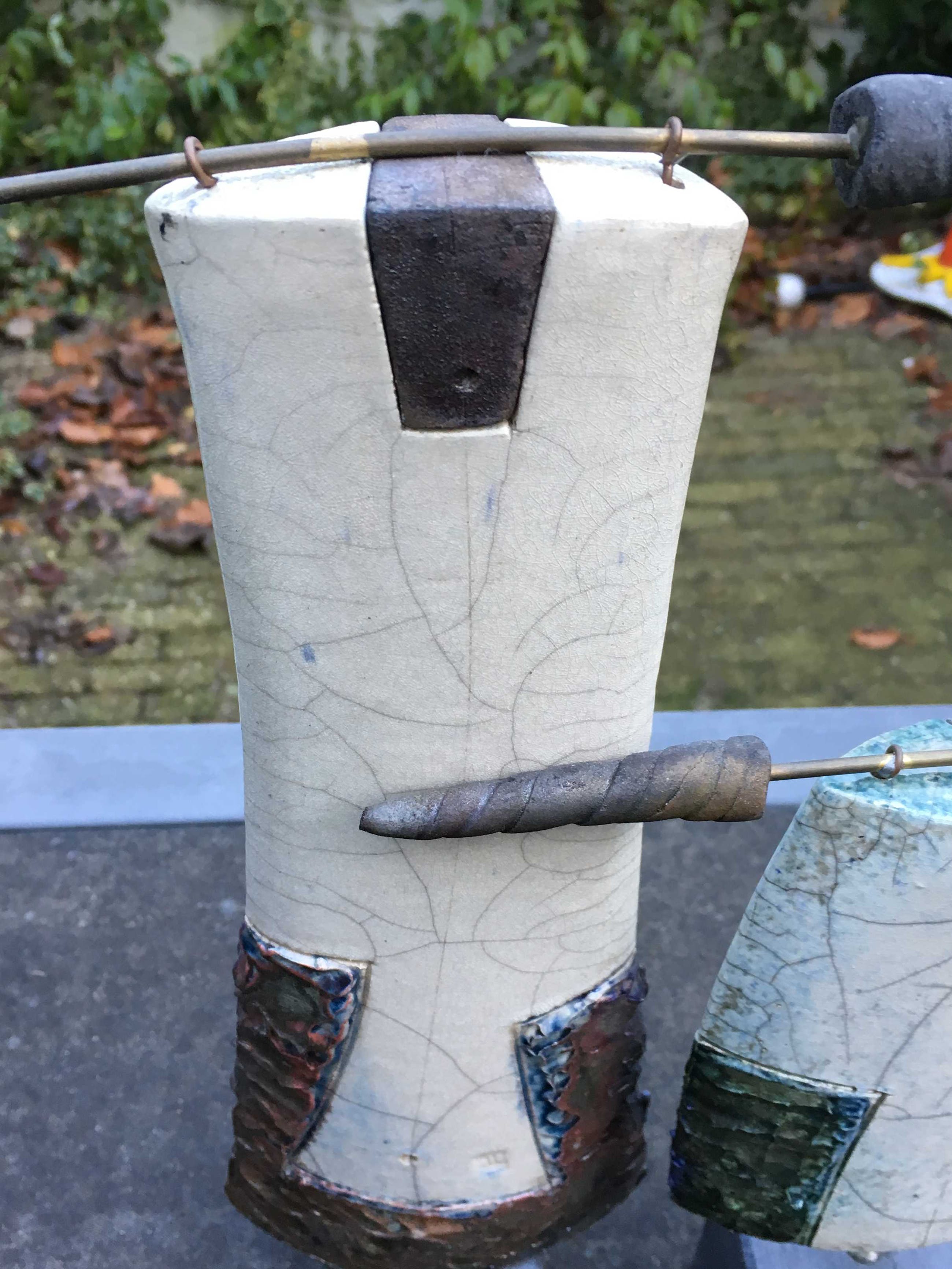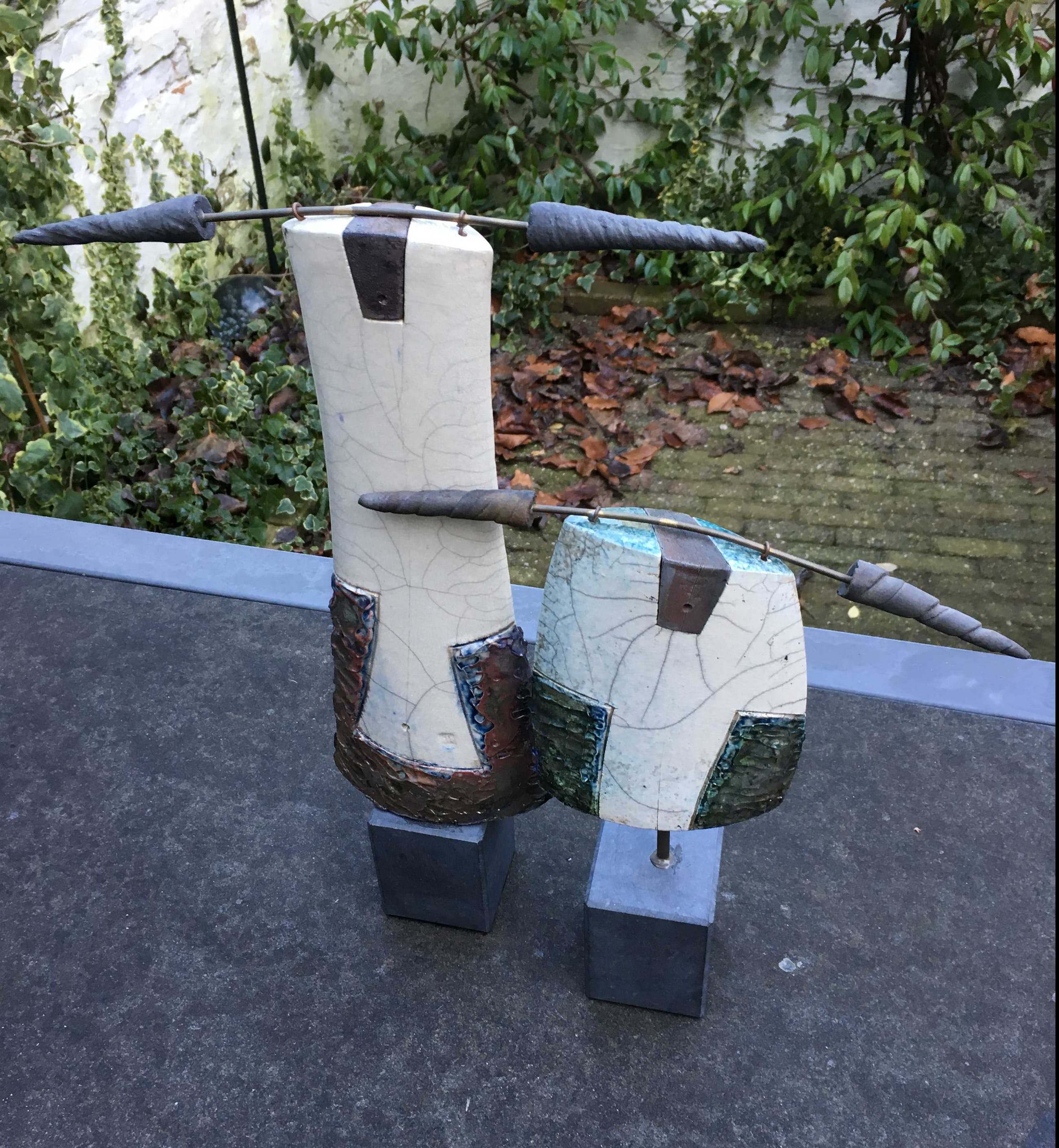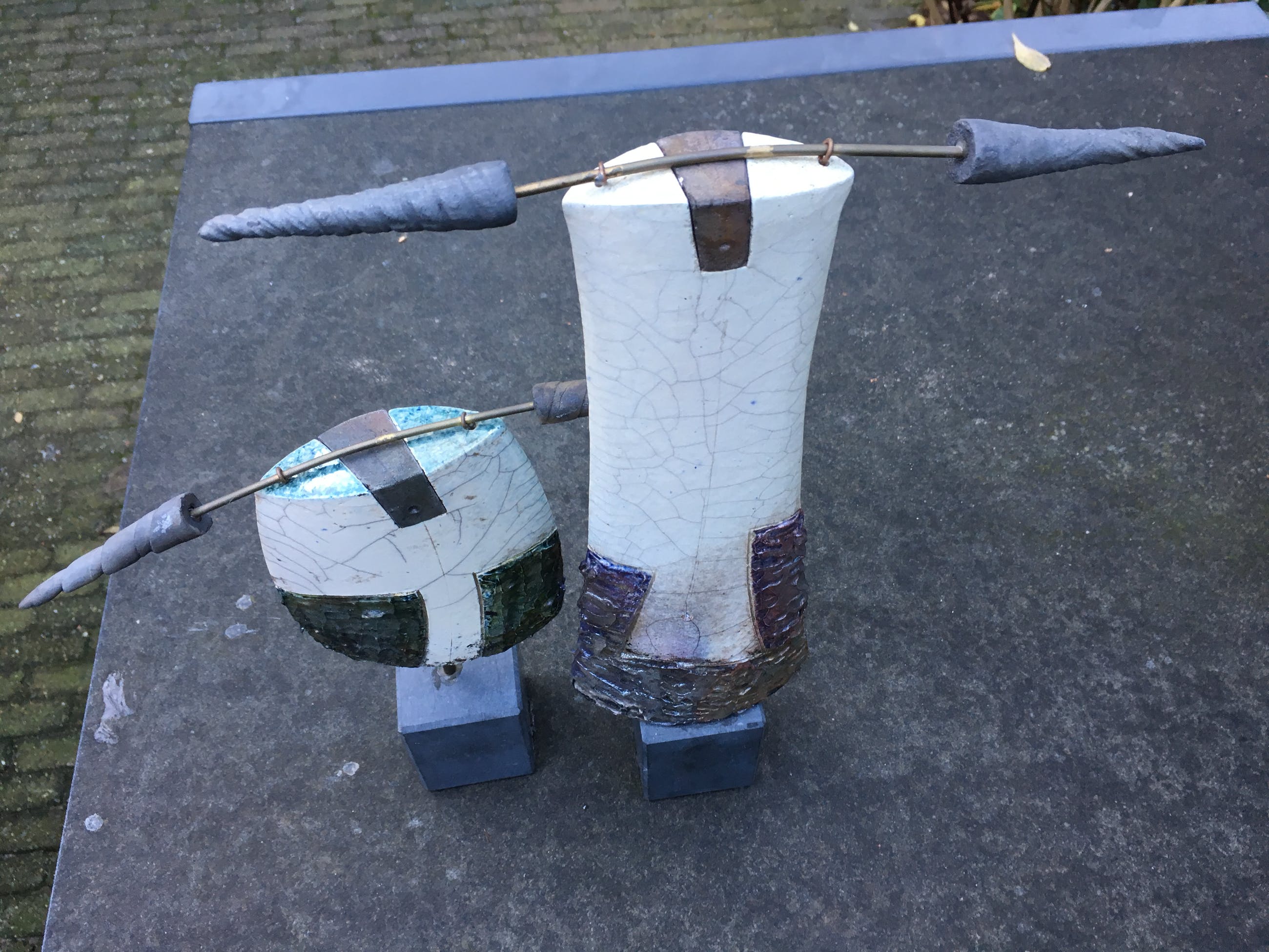 De producten van Lei Hannen vind je in de gehele wereld terug dankzij de talrijke exposties in Europa en daarbuiten. De website van Lei Hannen vertelt daar meer over. De aangeboden objecten worden als duo verkocht. De hoogte bedraagt voor de grootste 40 cm en voor de kleine 30 cm. De breedte is voor beide gelijk t.w. 12 cm. De sokkels meten 6x8cm. De ontwerpen hebben altijd binnen gestaan. In de donkere stukken vind je dikgeglazuurde kleurschakeringen.