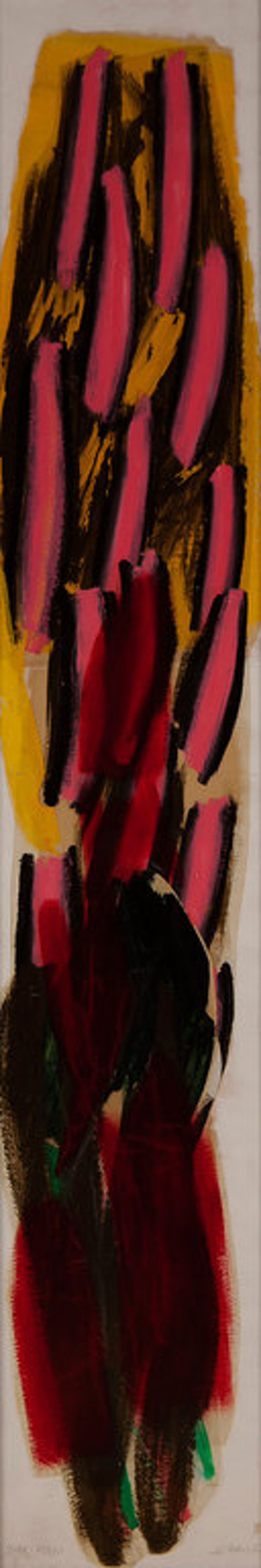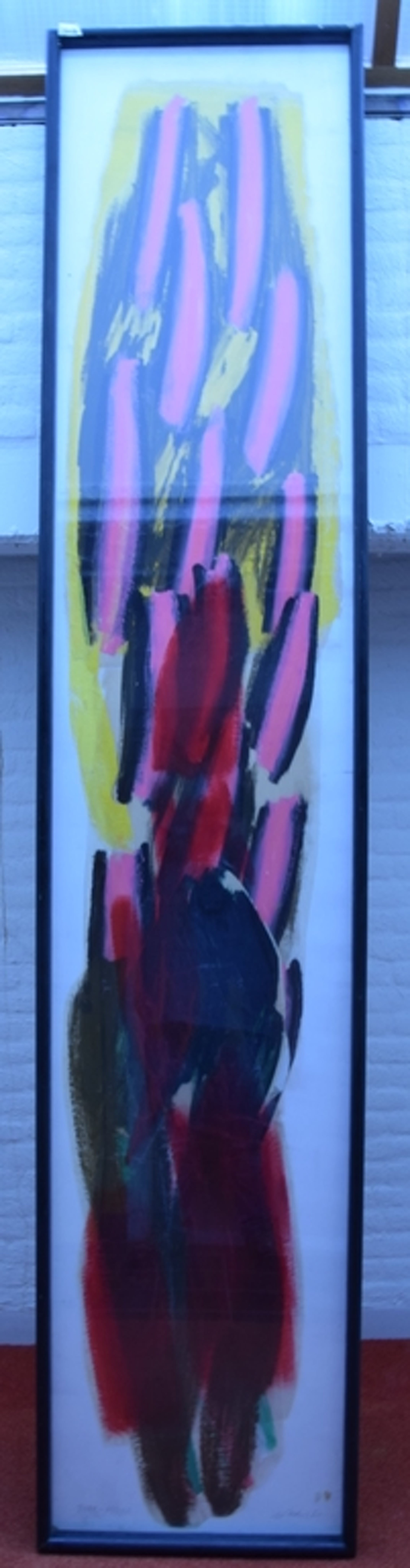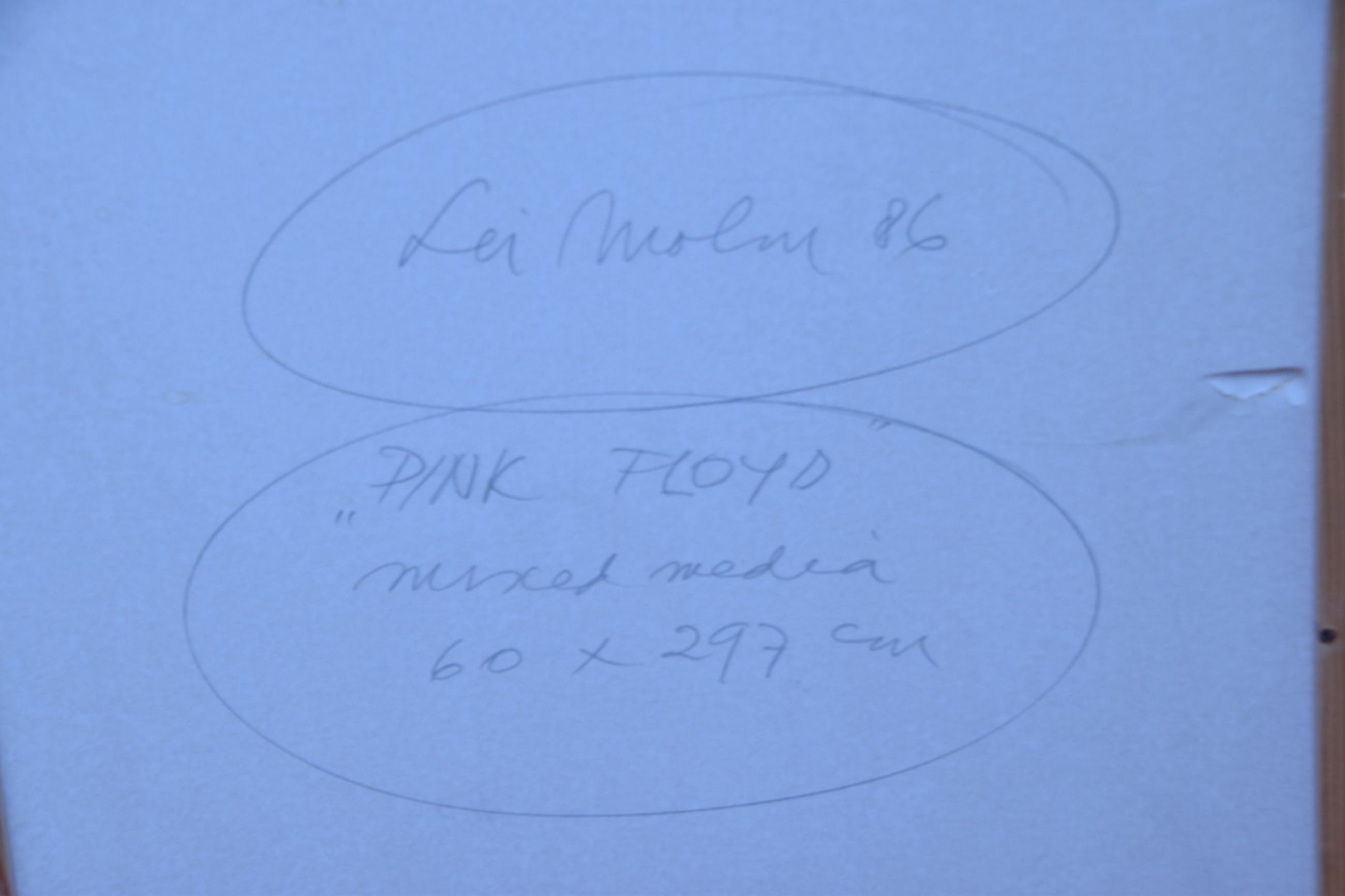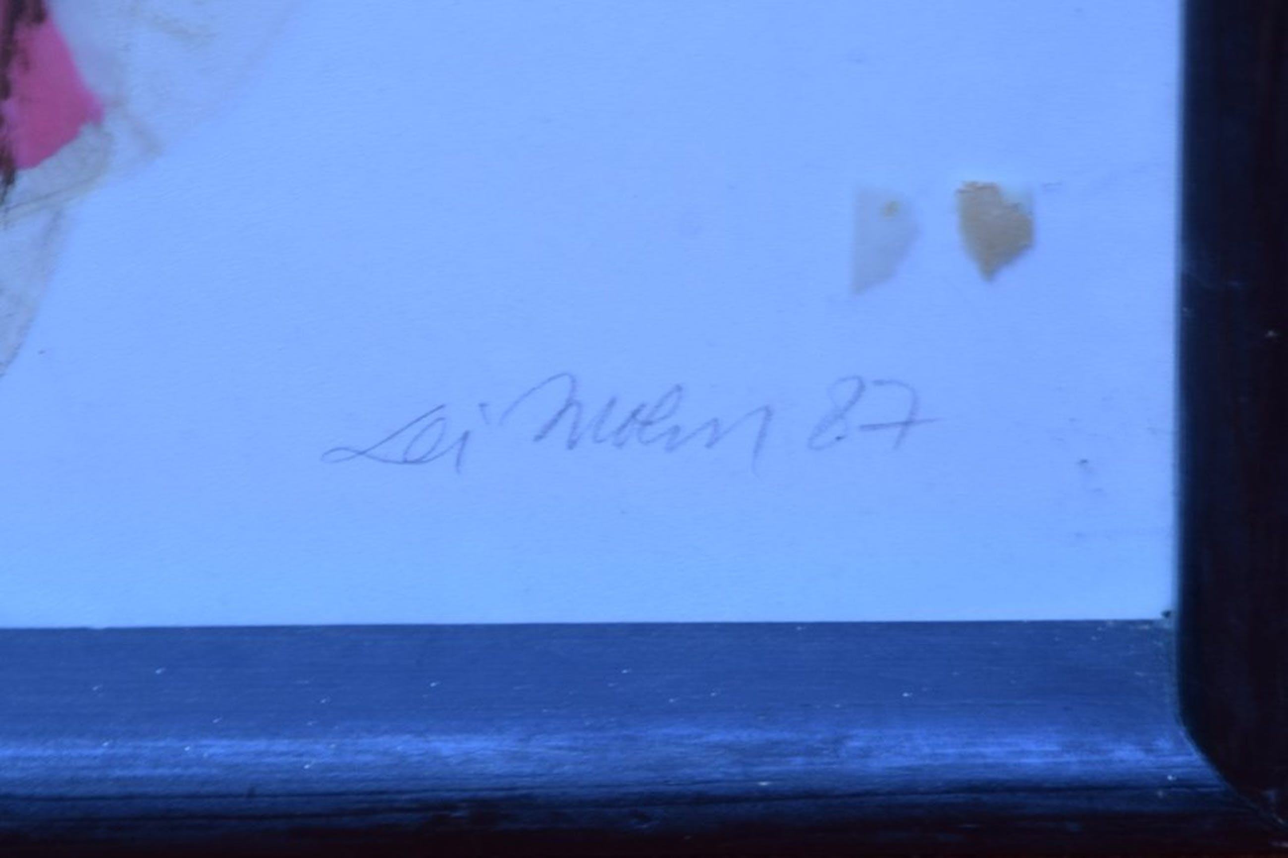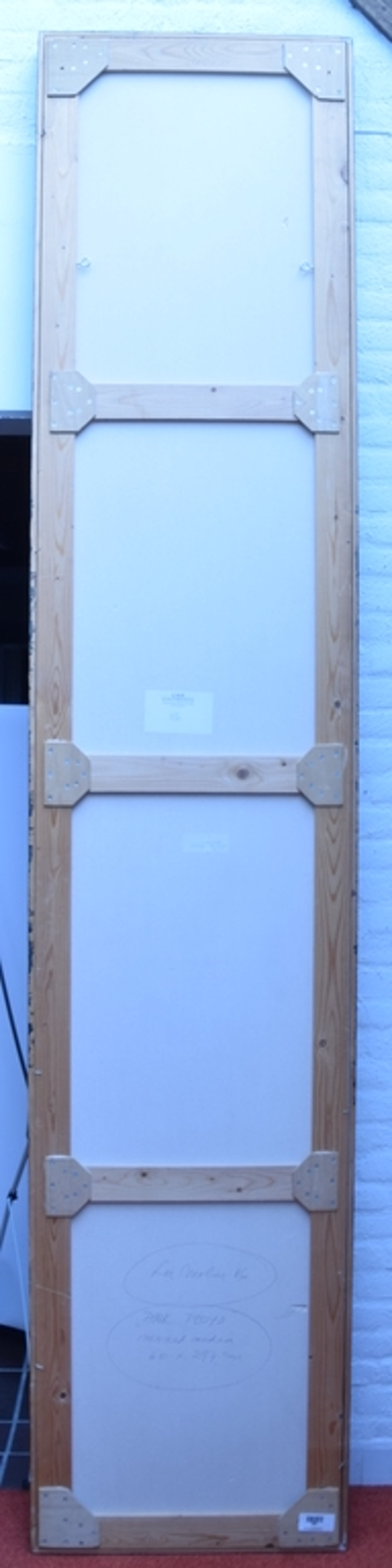 Zeer groot werk van Lei Molin. Het werk is in goede staat, met slechts enkele sporen van ouderdom. Gemaakt aan het einde van de jaren '80. De signatuur op de voorzijde leest '87', terwijl een tweede signatuur op de achterzijde als '86' staat aangemerkt. Op de achterzijde is tevens een label aanwezig van Kunstpromotie Den Haag, welke de oorspronkelijke prijs van fl. 16000,- vermeld.