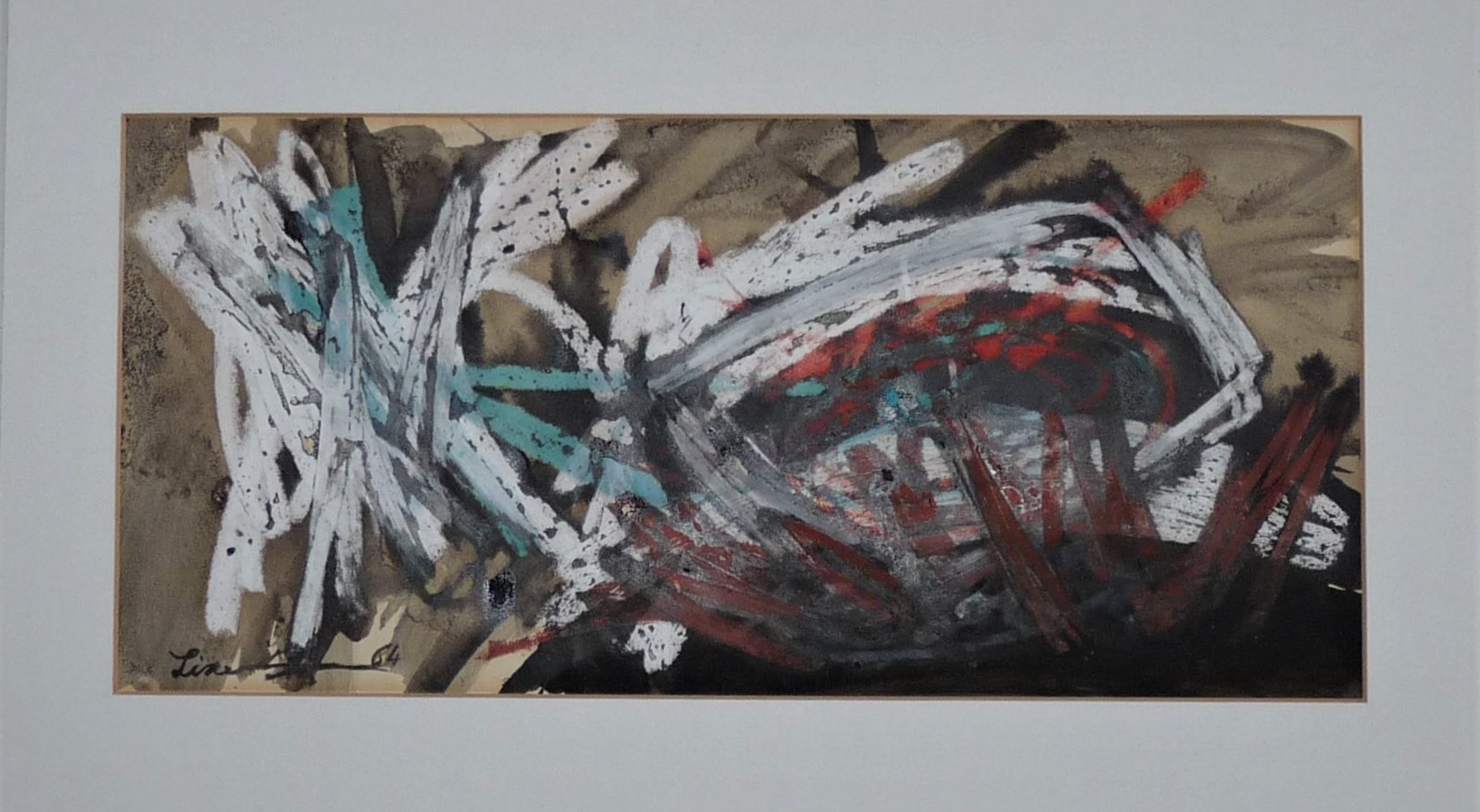*Fraai abstract werk in gemengde techniek op papier. Komt uit een interessante collectie met werk uit de jaren 60 van o.a. Lei Molin. Het zou kunnen dat dit ook van hem is, maar weet dat niet zeker. Signatuur kan ik niet direct herleiden tot die van Lei Molin. In ieder geval een goed werk met een lage inzet als limiet. *L.o. gesigneerd en gedateerd (zie foto)