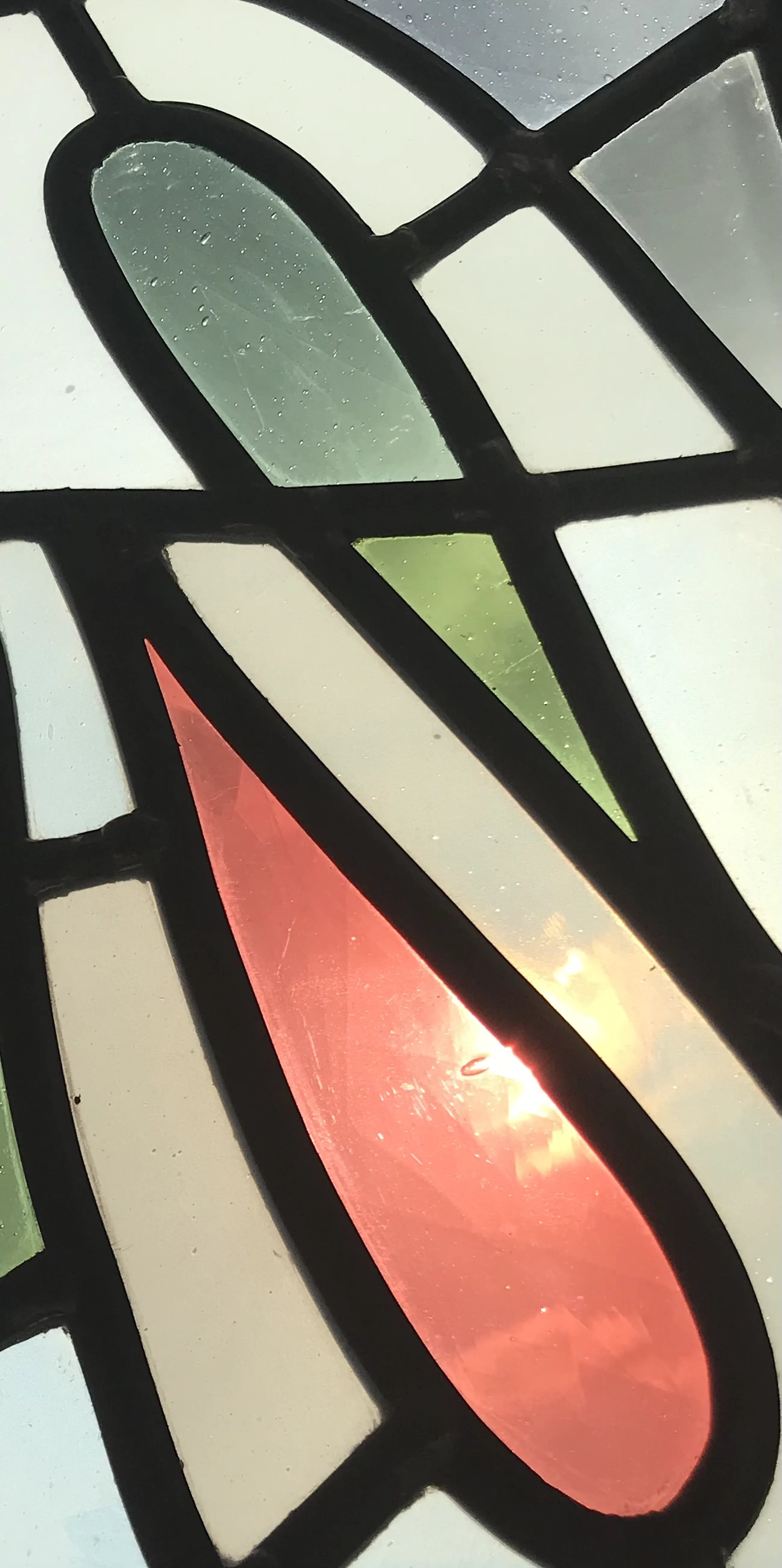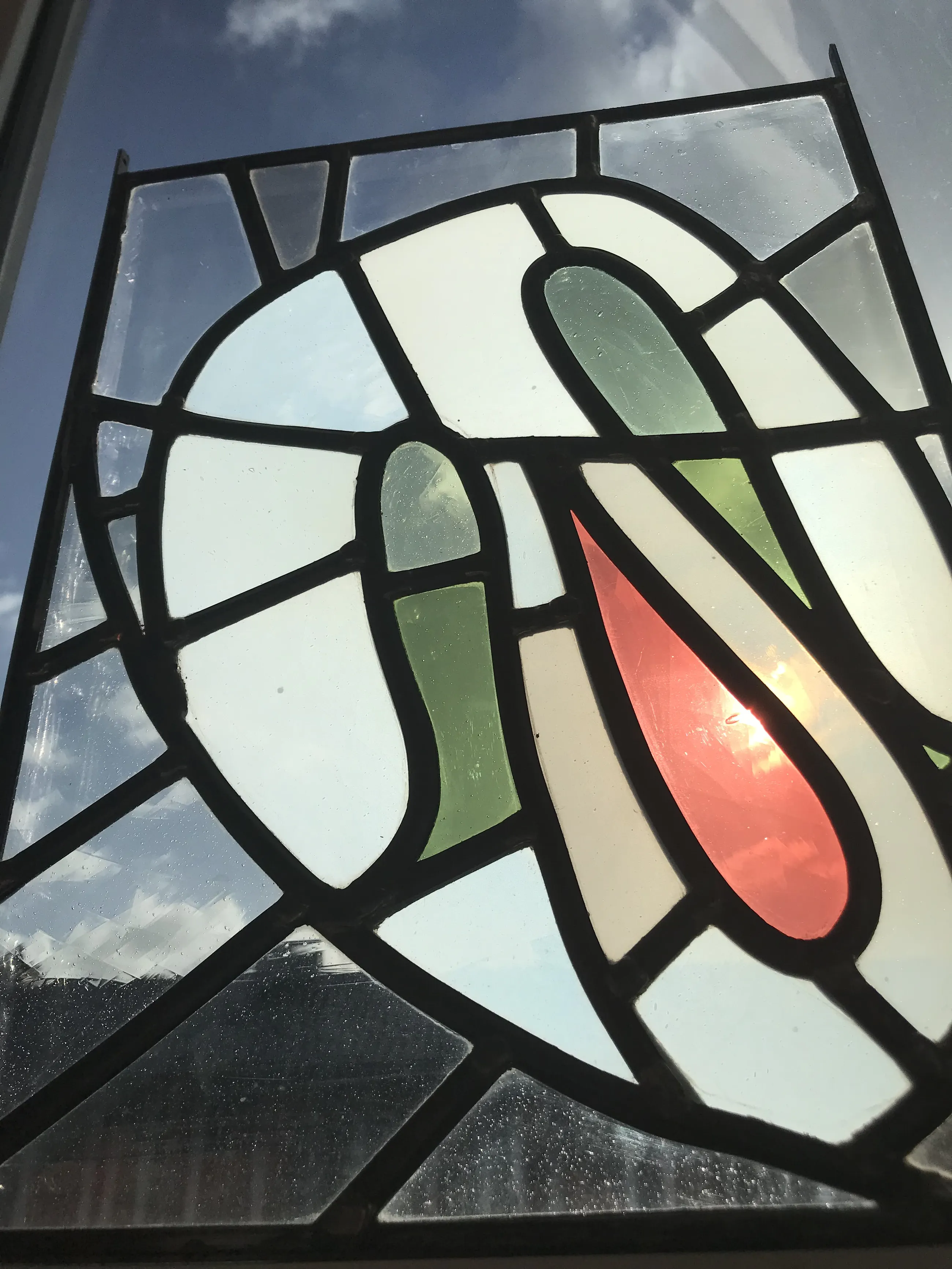Raamhanger in glas-in-lood, vervaardigd door Glaskunstatelier Flos te Steyl (L.) naar een ontwerp van kunstenaar Lei Reihs. Afmetingen, inclusief de 2 ophang-ogen, 46 x 34 cm. In nieuwstaat.