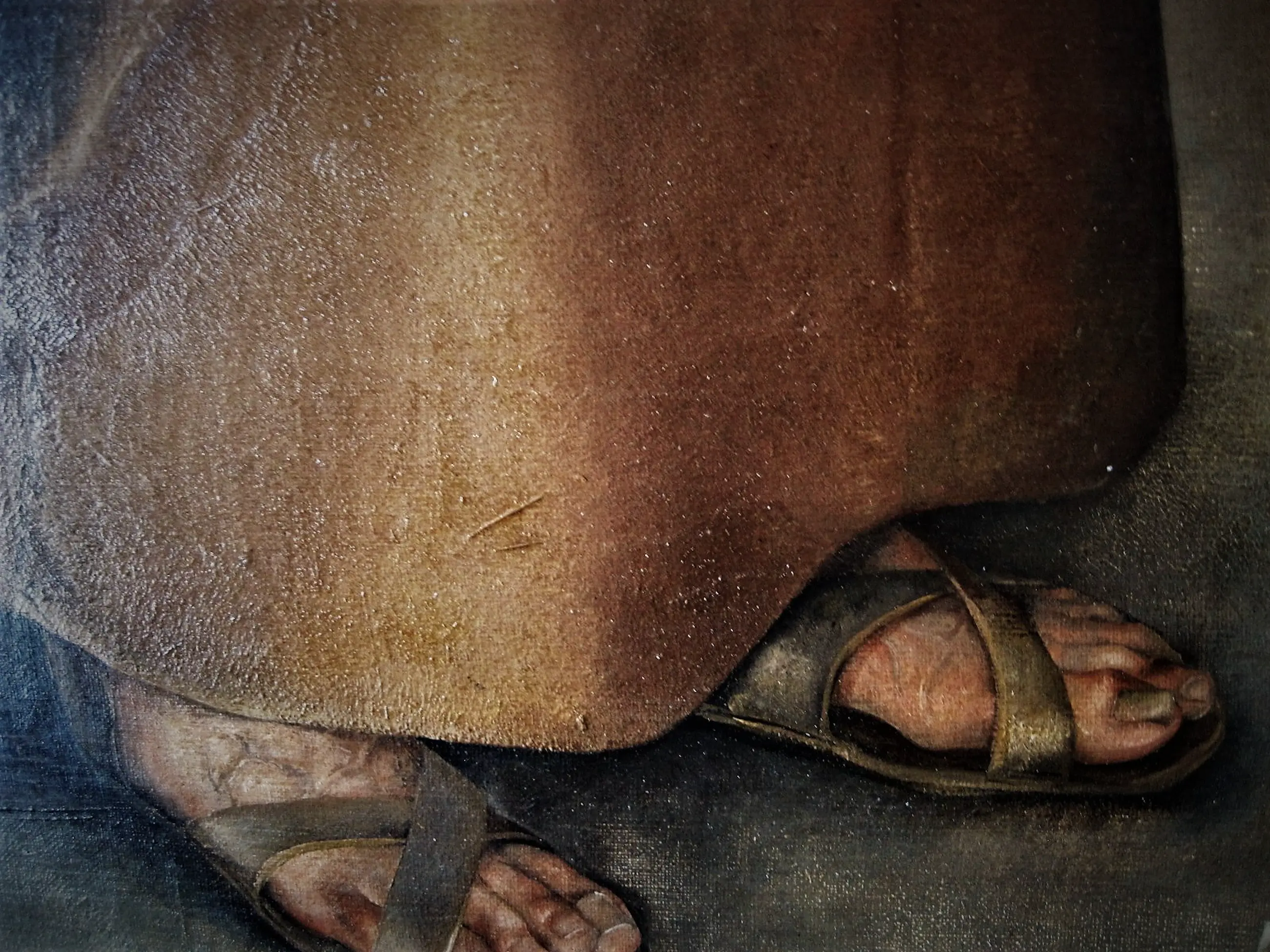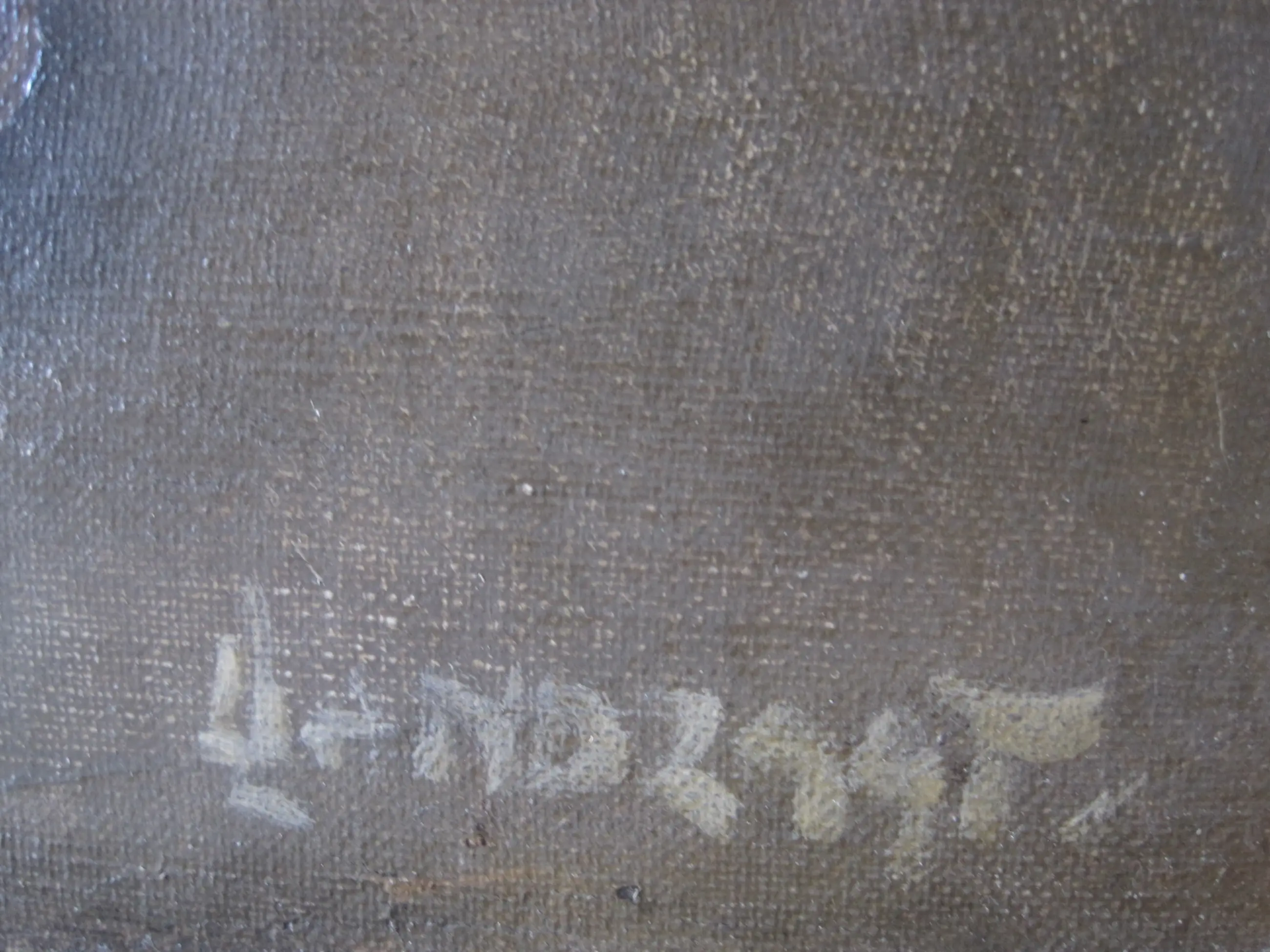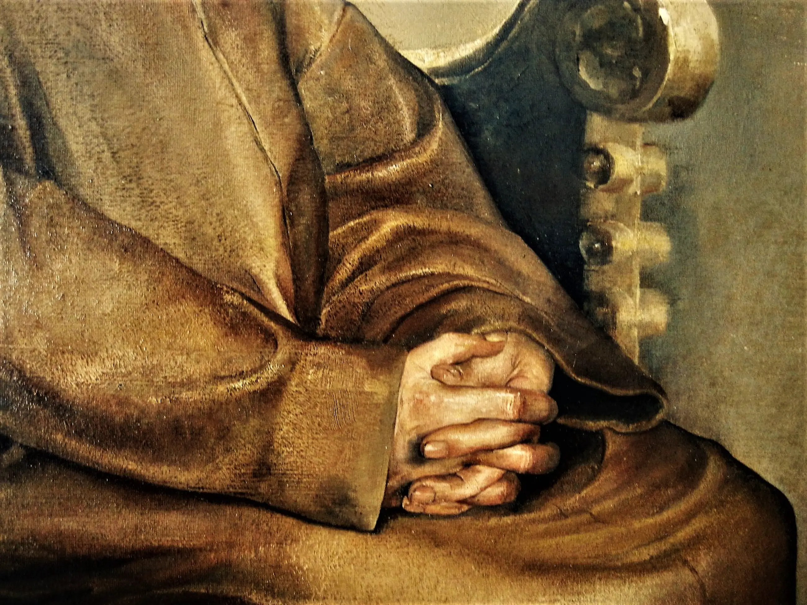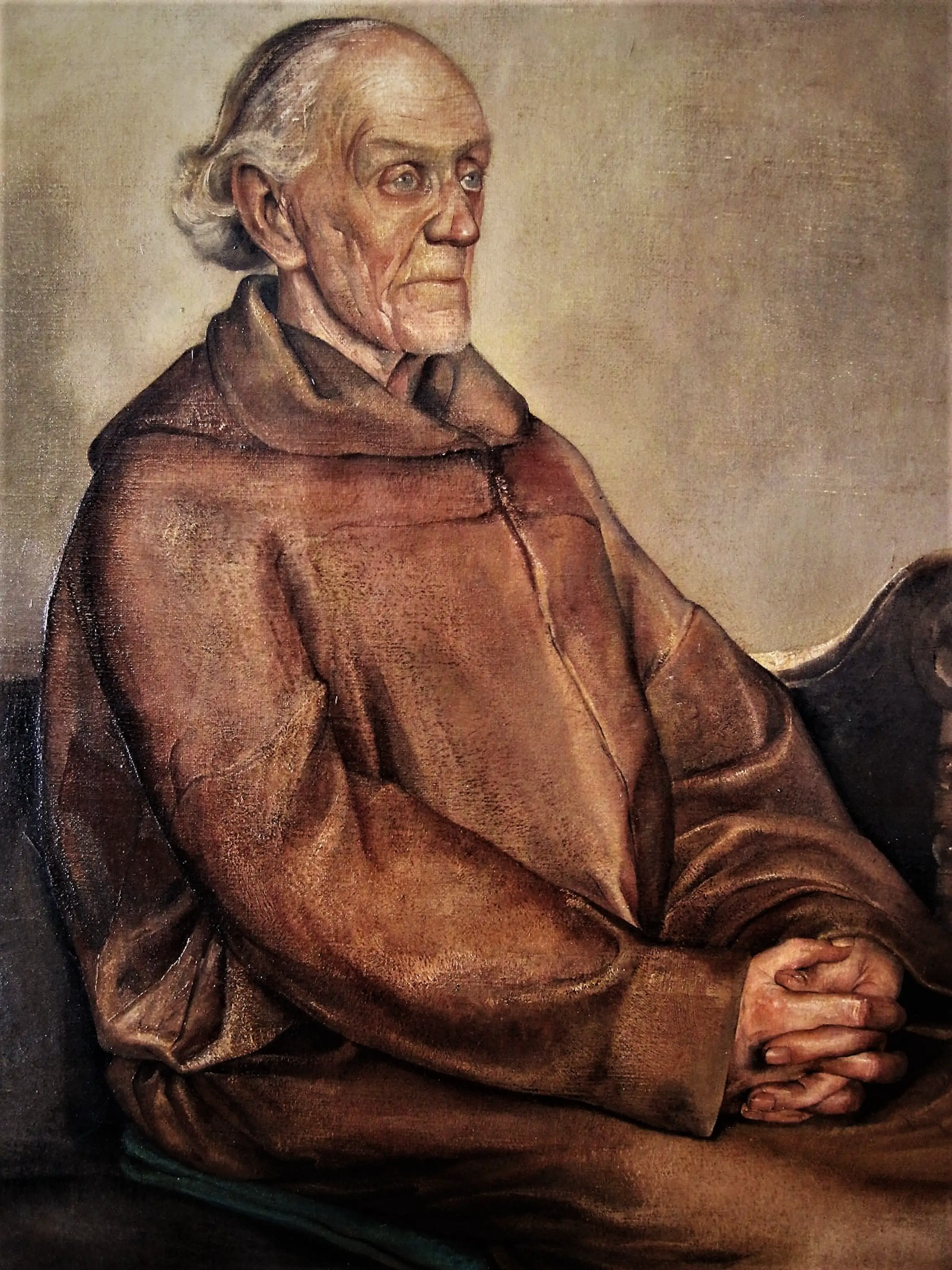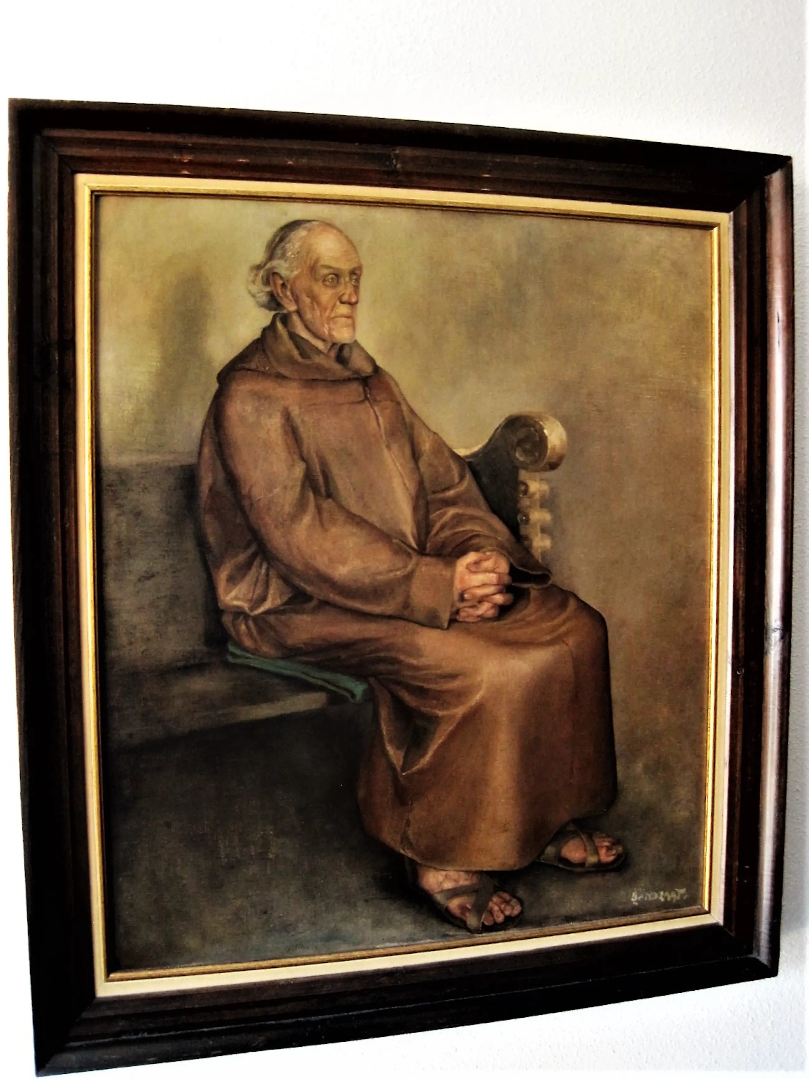 Door Helena Maria Bombeeck-Landzaat in 1940 tijdens haar studietijd aan de Rijksakademie voor beeldende Kunsten den Haag gemaakt portret van een monnik. In (magisch) realistische stijl geschilderd toen Helena artistiek zwaar onder invloed van haar leraar Willem vd Berg (1886-1970) stond. Het jaren 40 doek is recentelijk aan de achterzijde opnieuw bedoekt en het schilderij verkeert nu dus weer in zeer goede conditie. Rechtsonder gesigneerd.