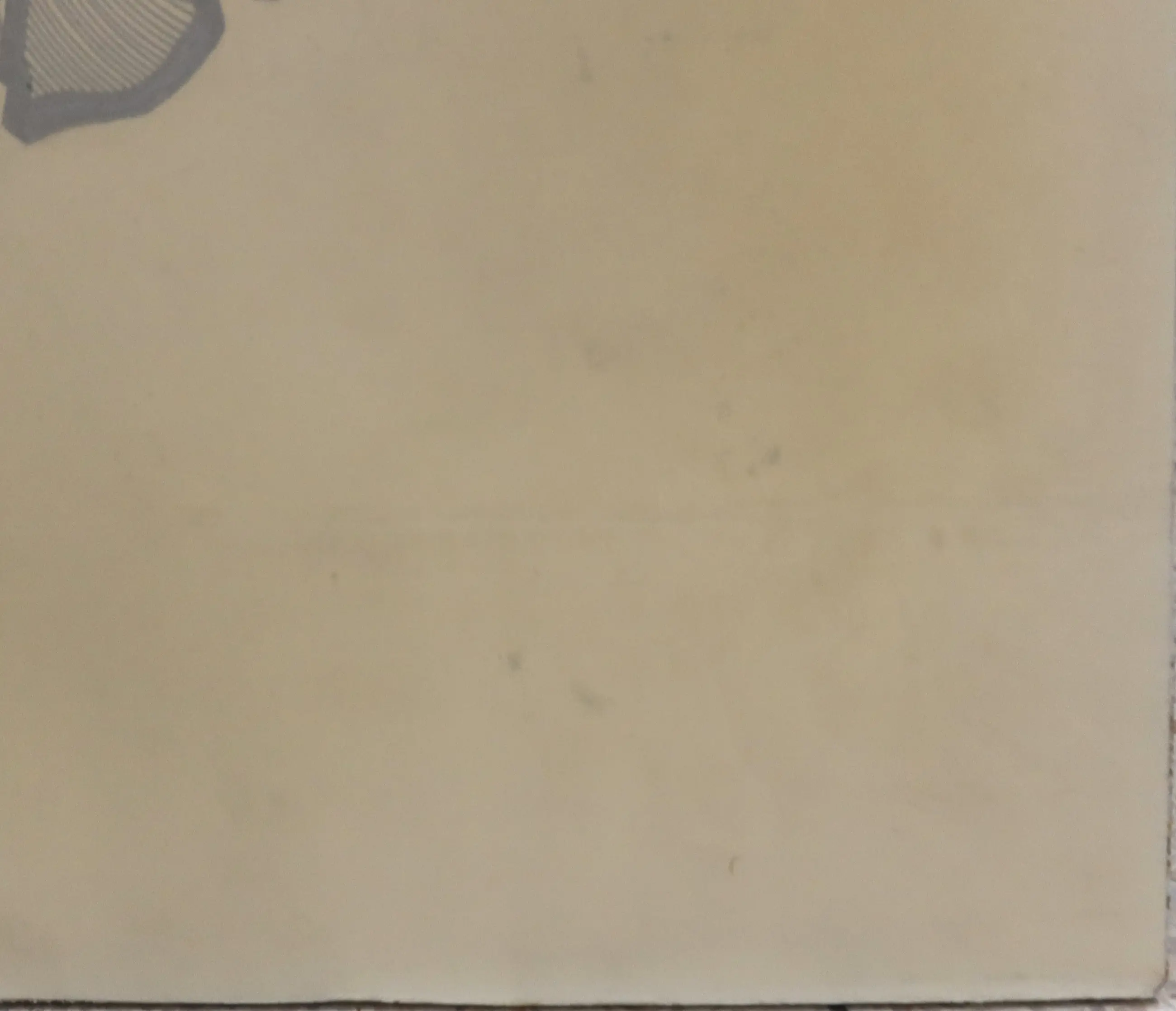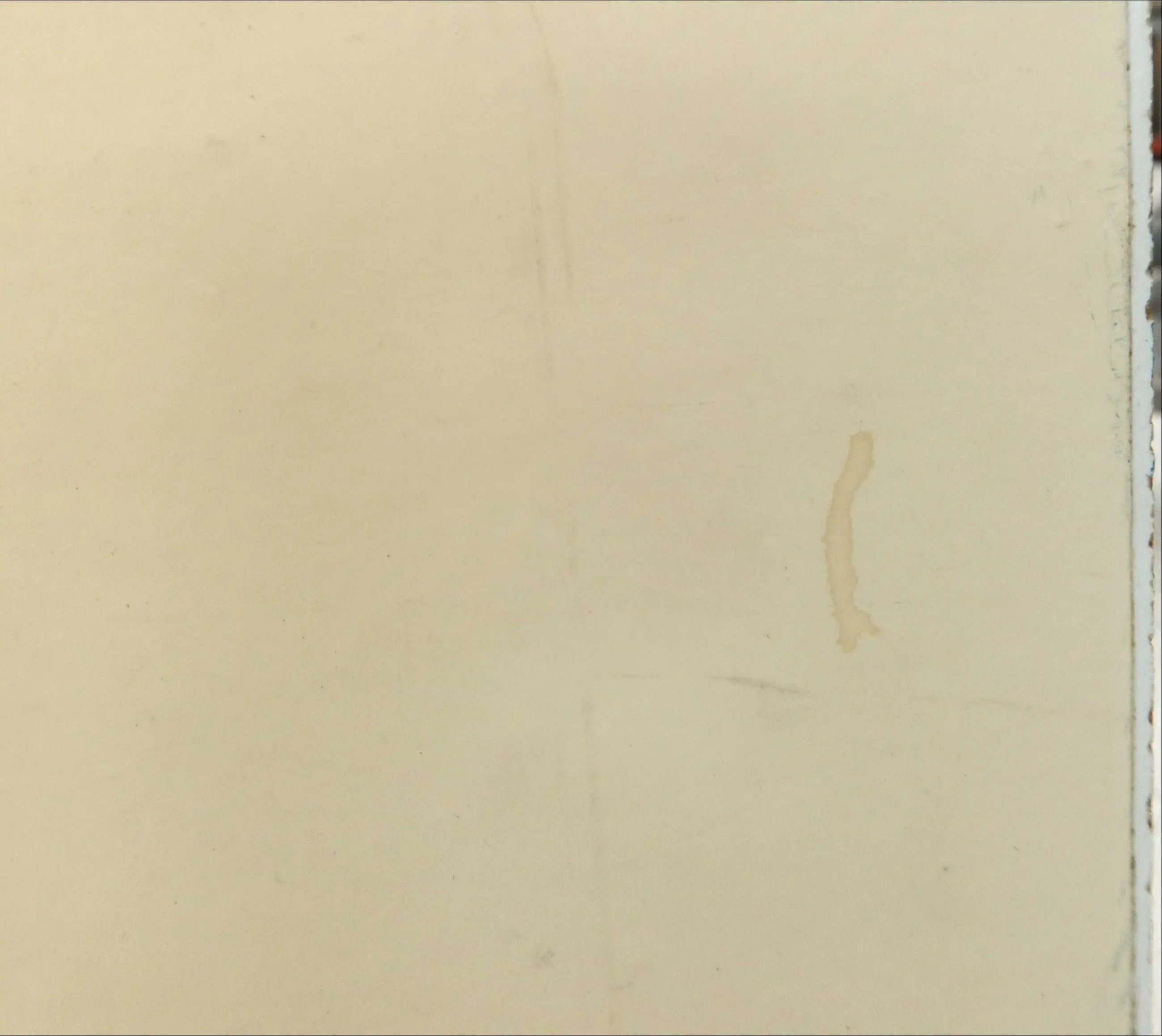 | Wat vuil, krasjes en papierschade aanwezig. Linksonder komt het papier wat los van het paneel. | |