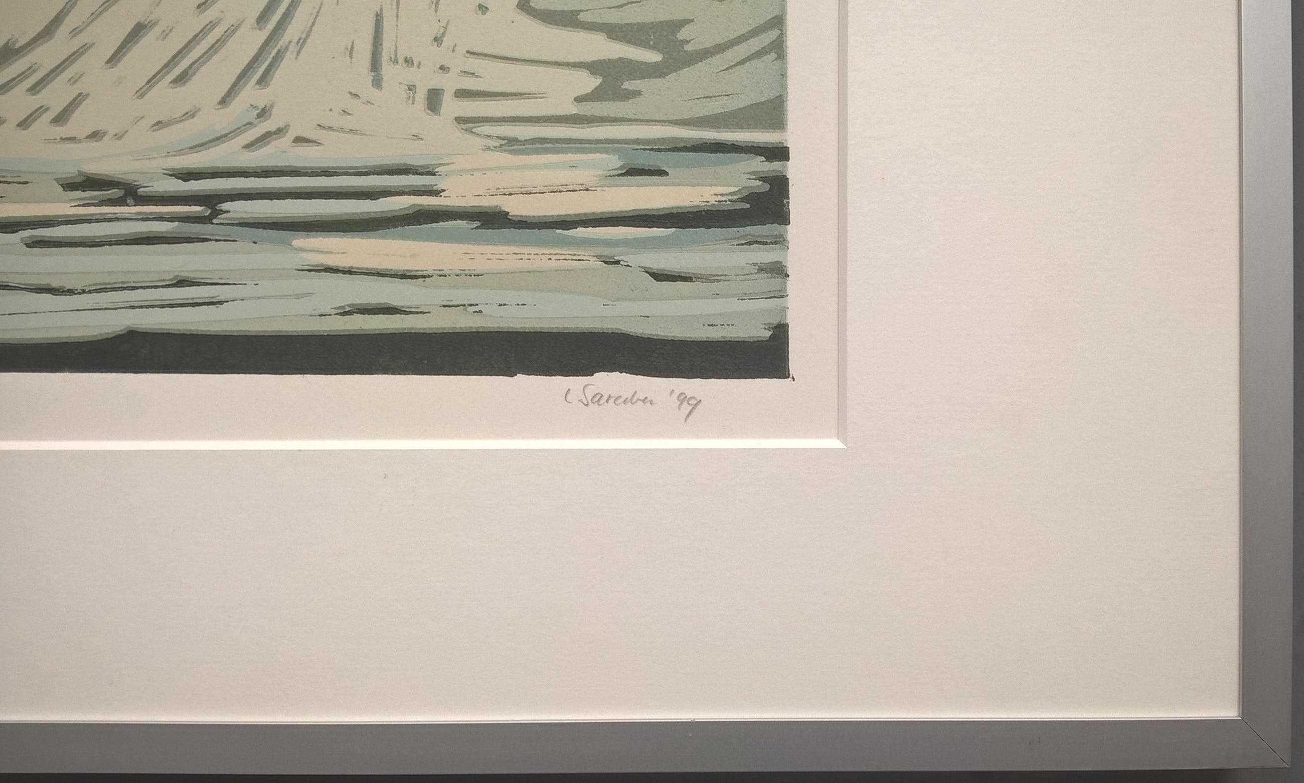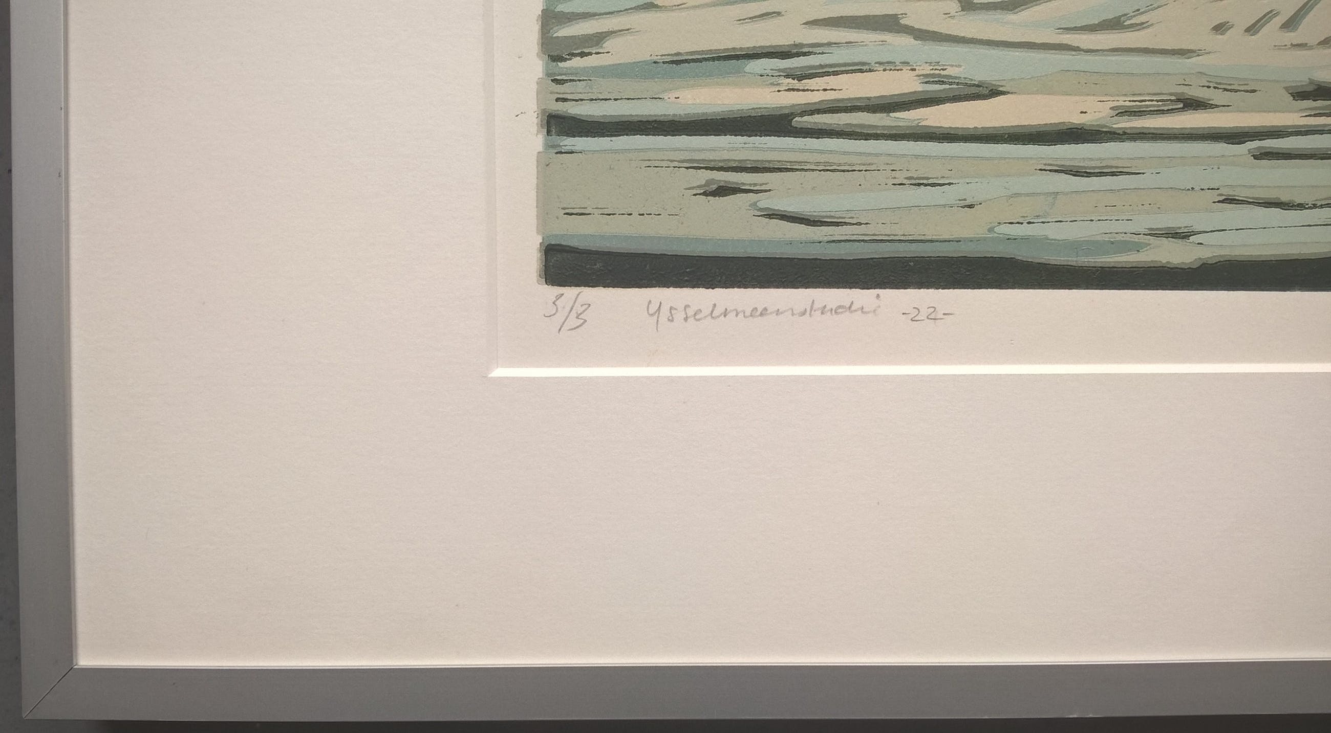 Gesigneerde linosnede van de kunstenaar Lenneke Saraber (1967). Rechtsonder is het werk gesigneerd en 99, linksonder met 3/3 en IJsselmeerstudie -22-. Afmeting werk 25 x 30 cm (hxb) Afmeting aluminium lijst: 41.5 x 51.5 cm (hxb). Het werk en lijst zijn in goede staat. Kan zo aan de muur.