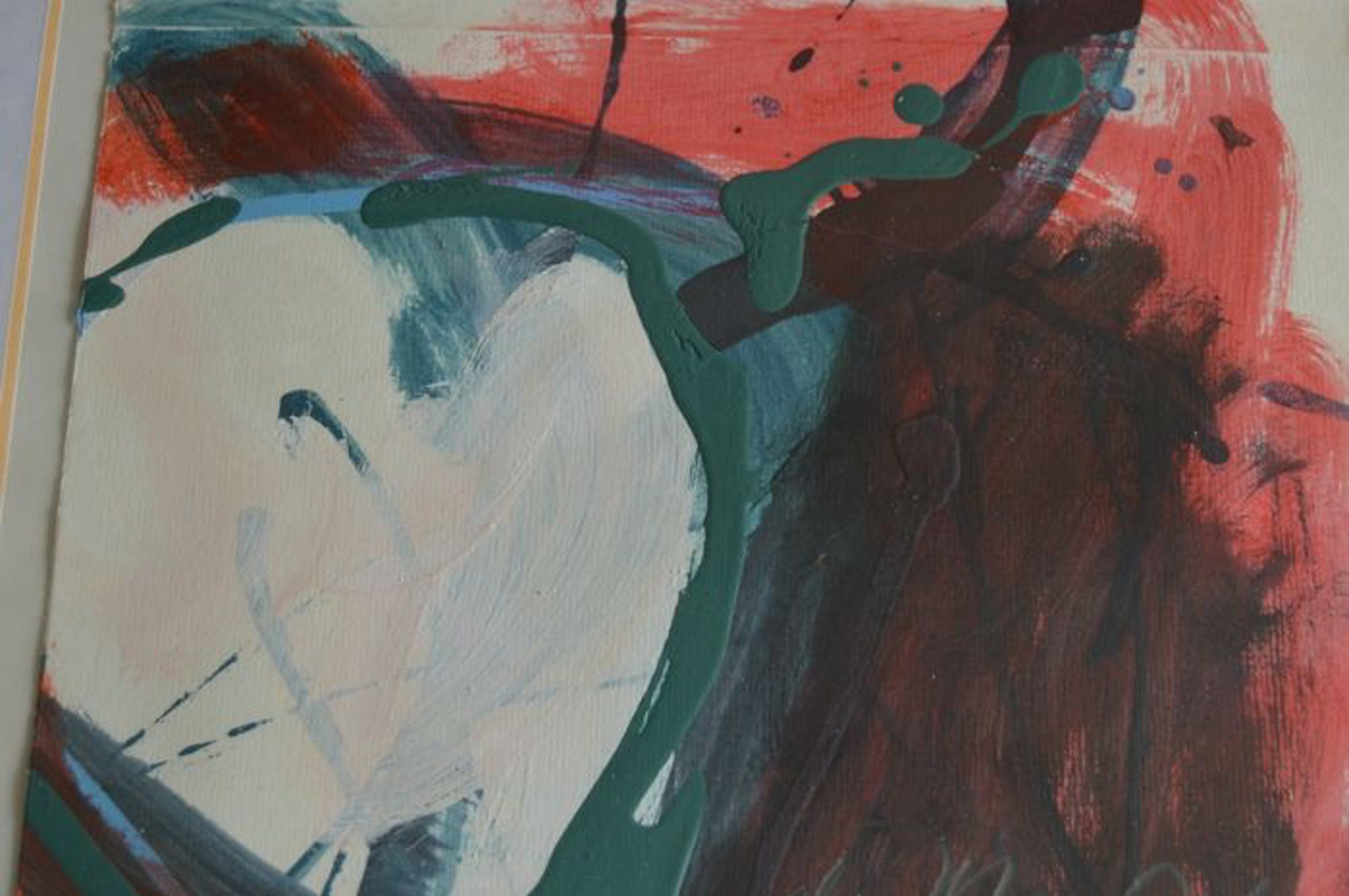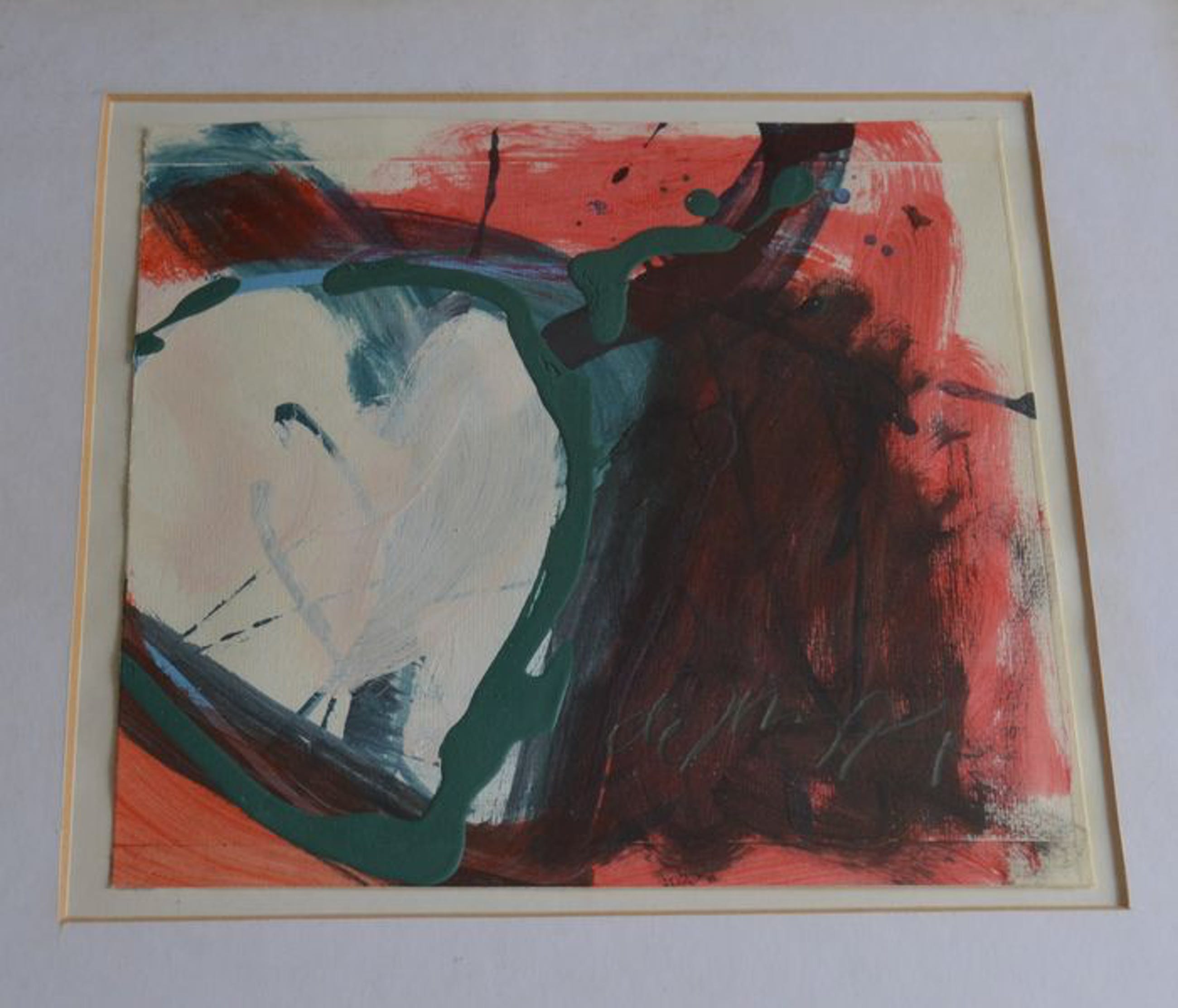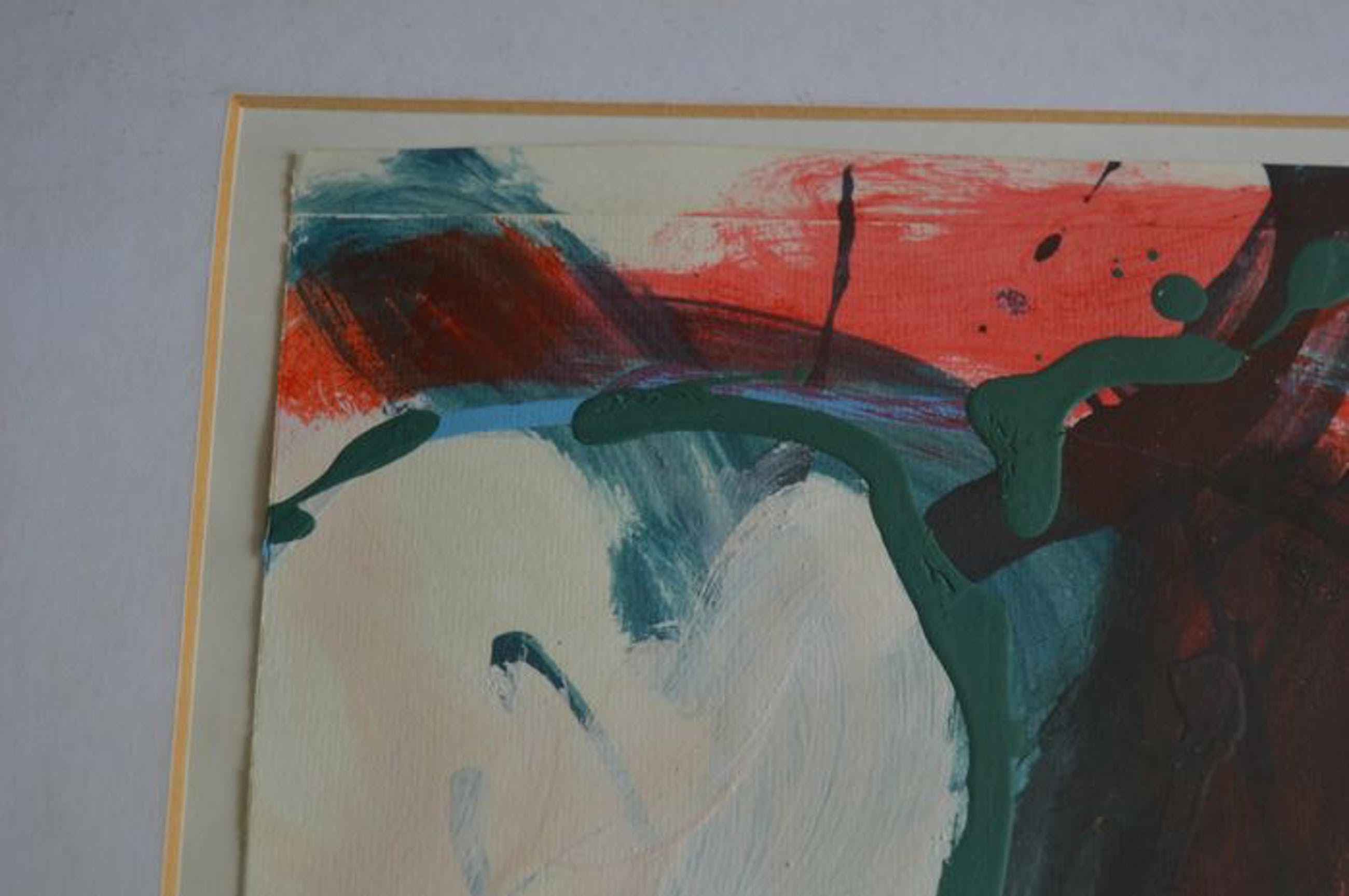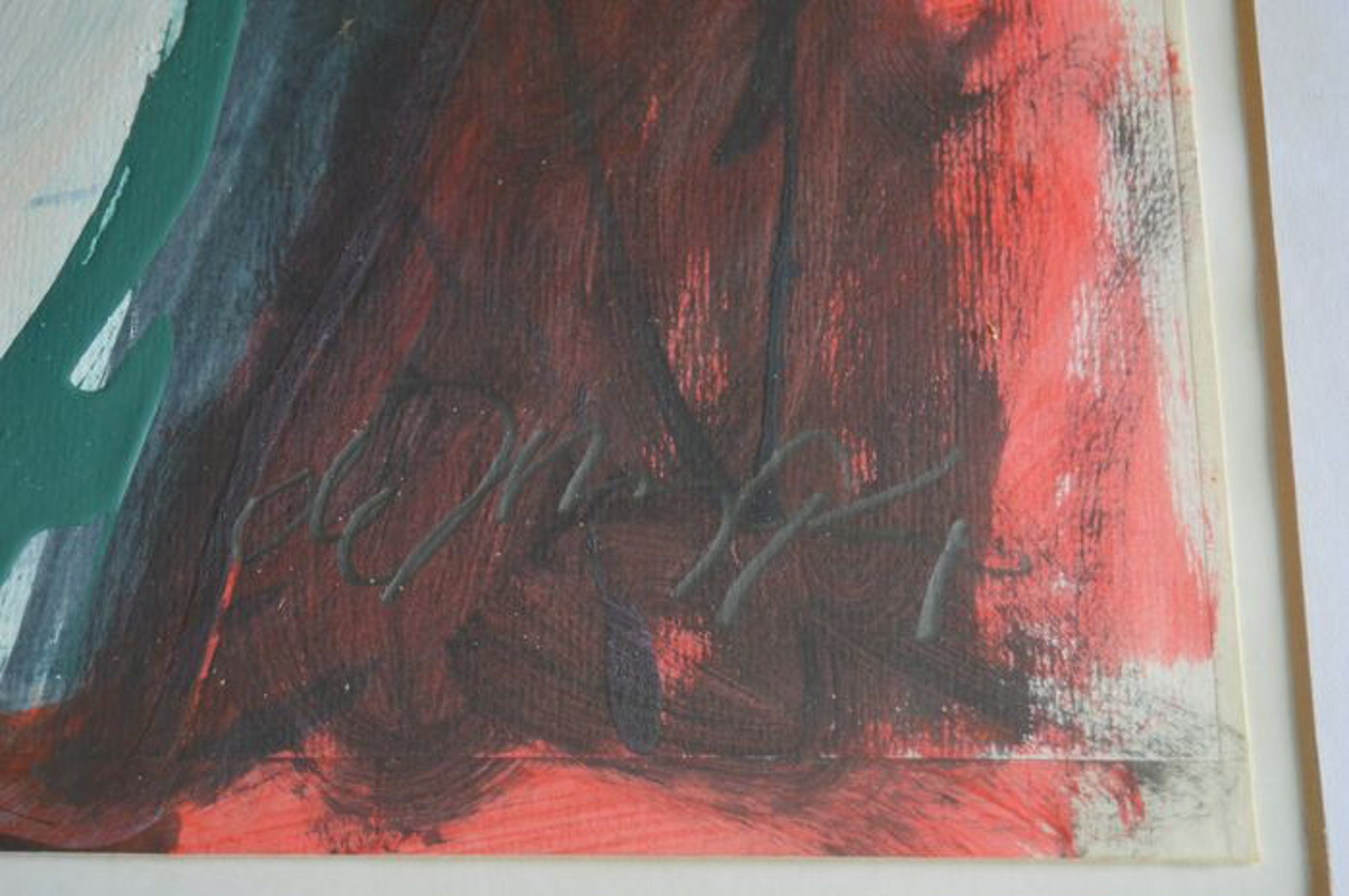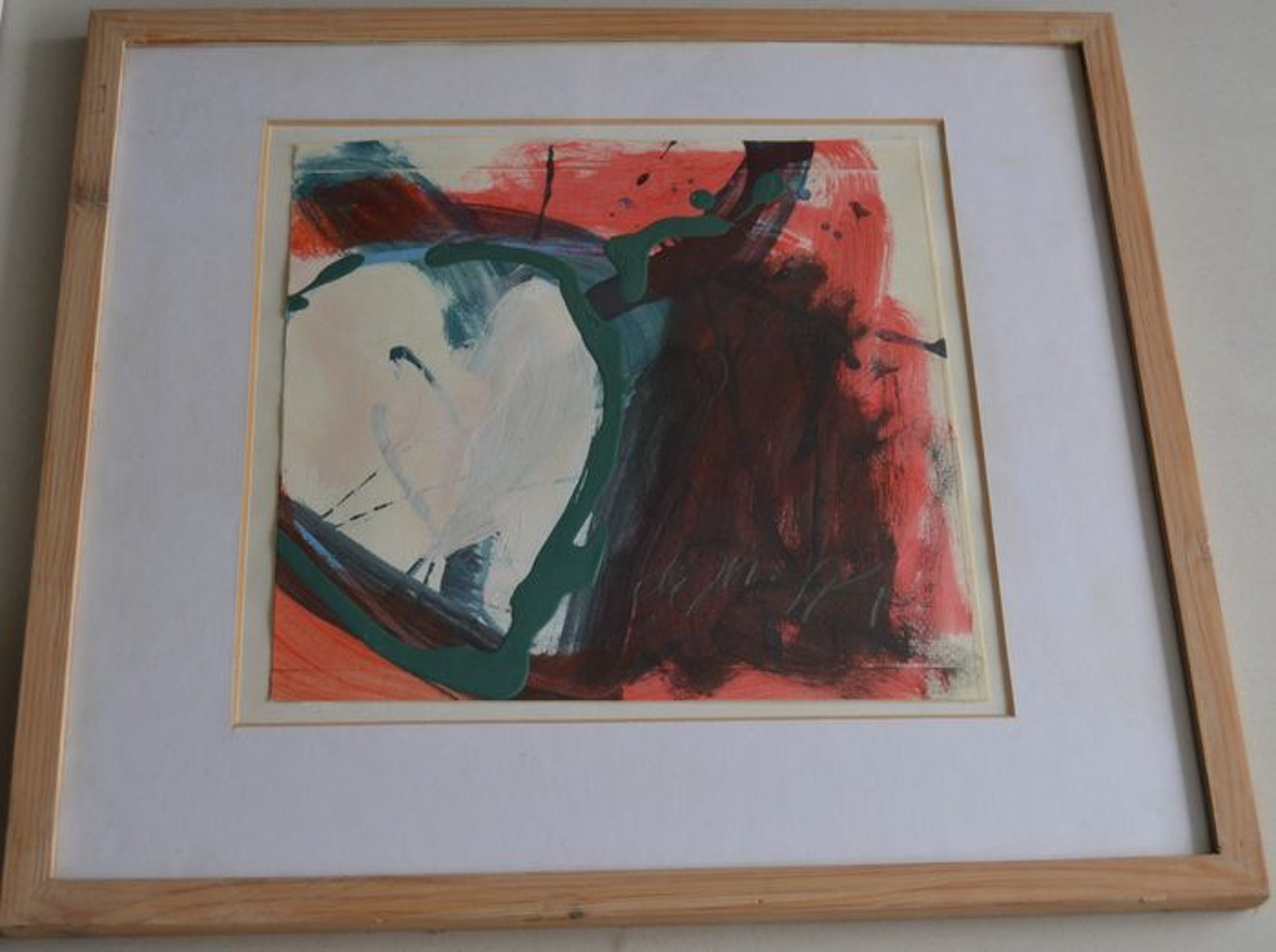 Mooi abstract schilderij door Leo de Jong. Gemaakt in 1994. Acrylverf op papier. Gesigneerd in het werk. rechtsonder. Ingelijst achter glas. Afmetingen werk; 25 x 24 cm. In houten lijst.