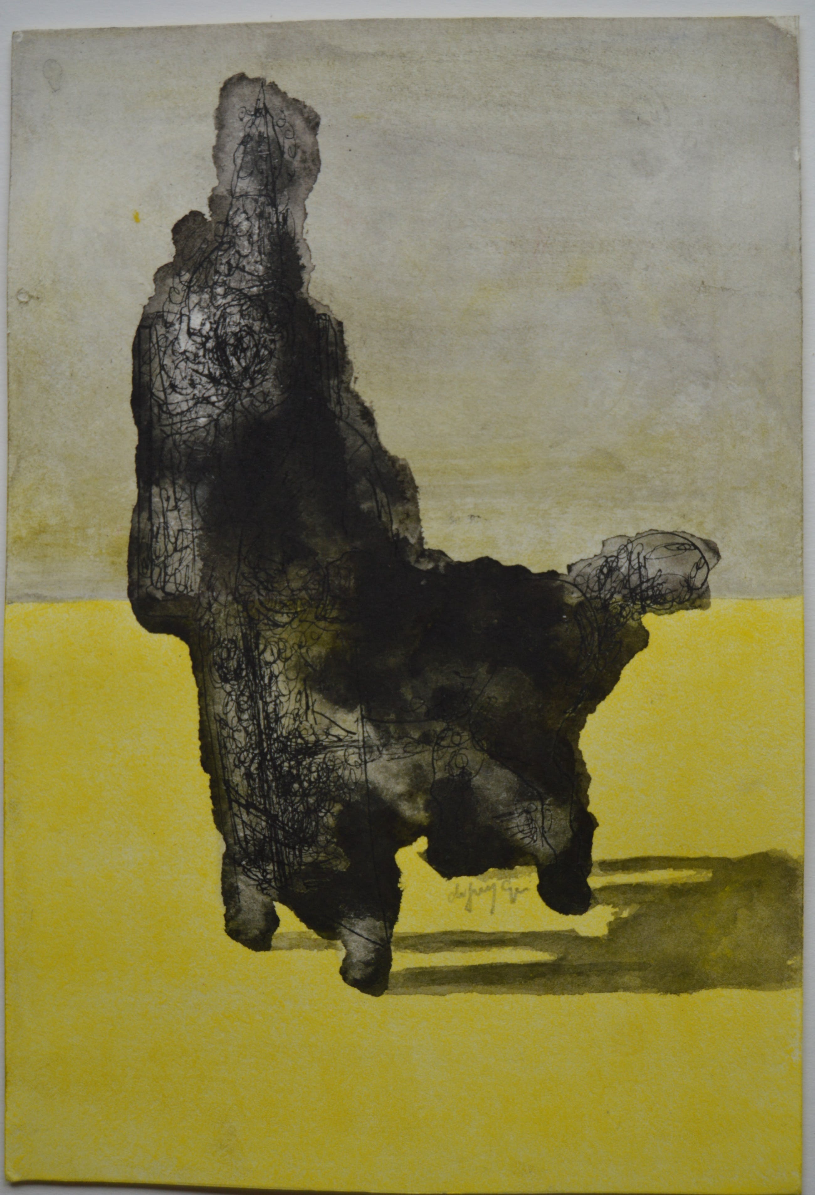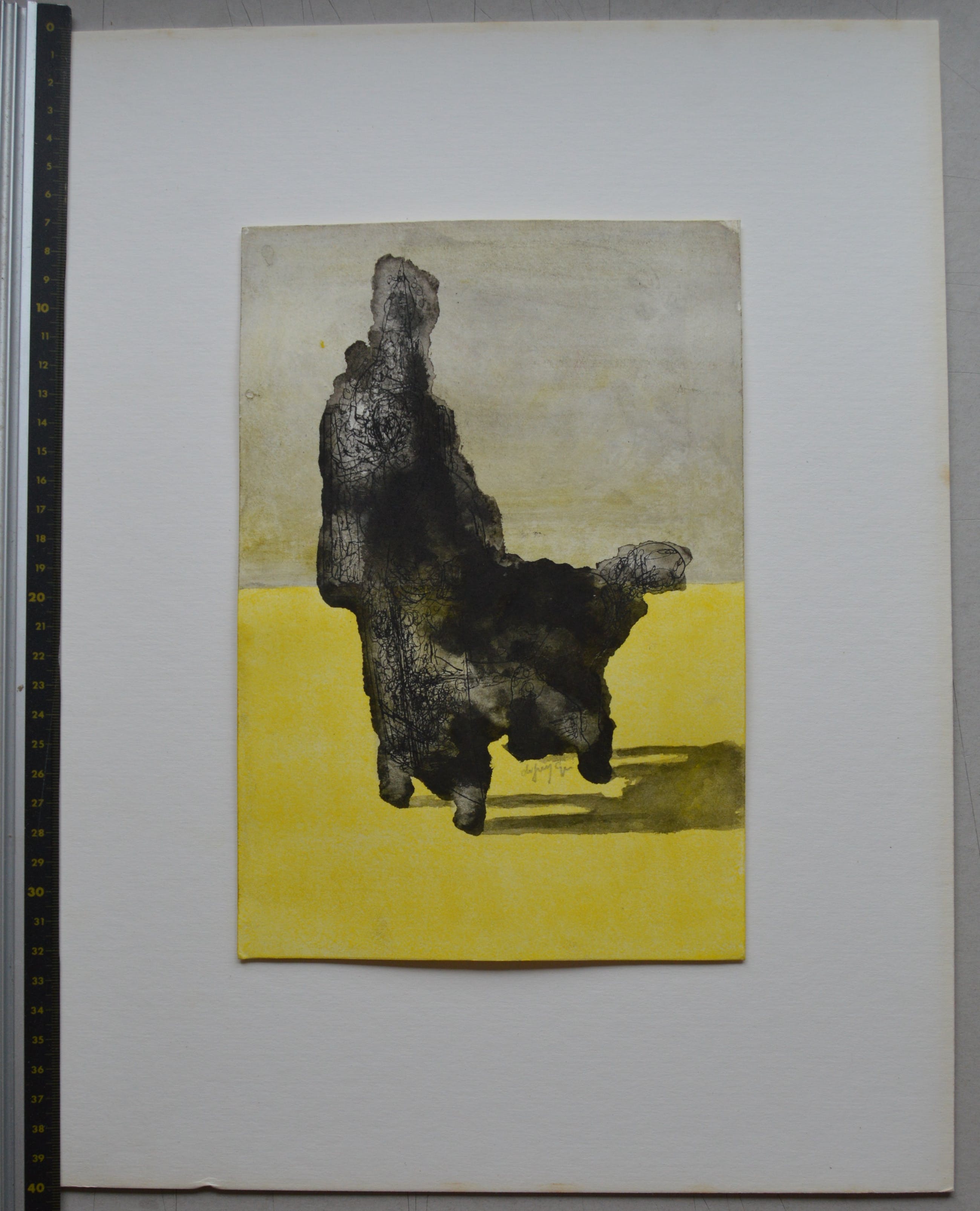 Gemengde techniek op dik papier. Opgehoogd ingelijst geweest. Totale afmetingen 40 x 31 cm. Verzending aangetekend.