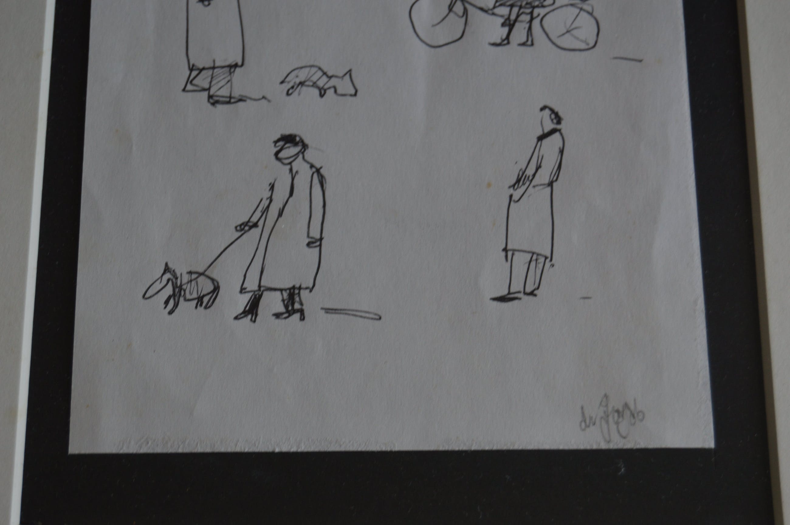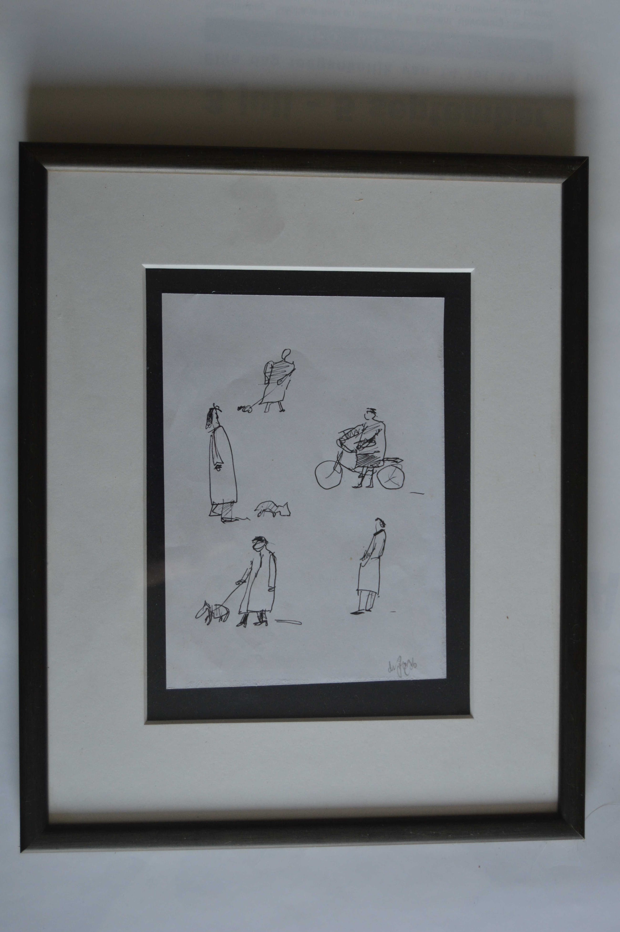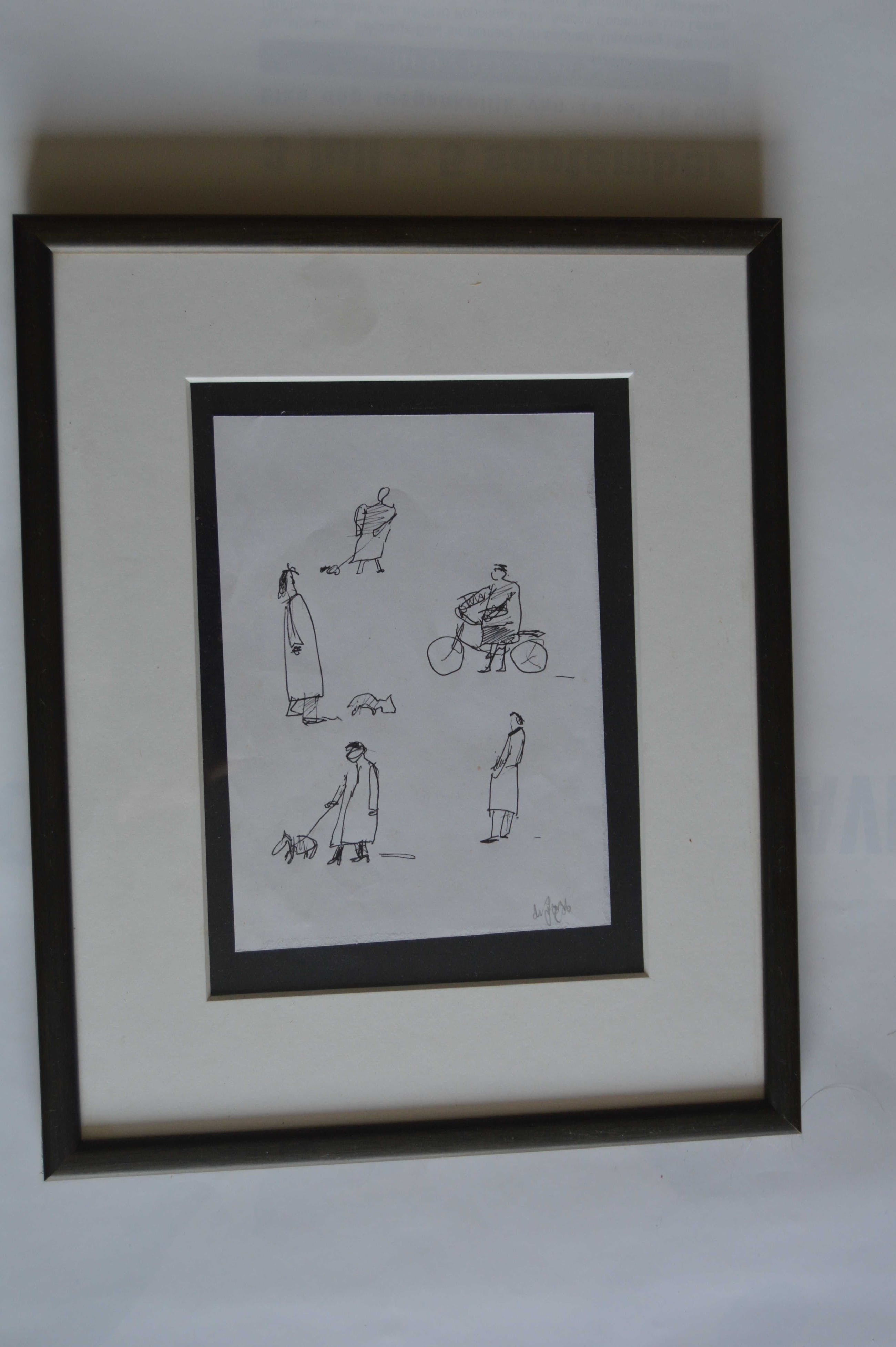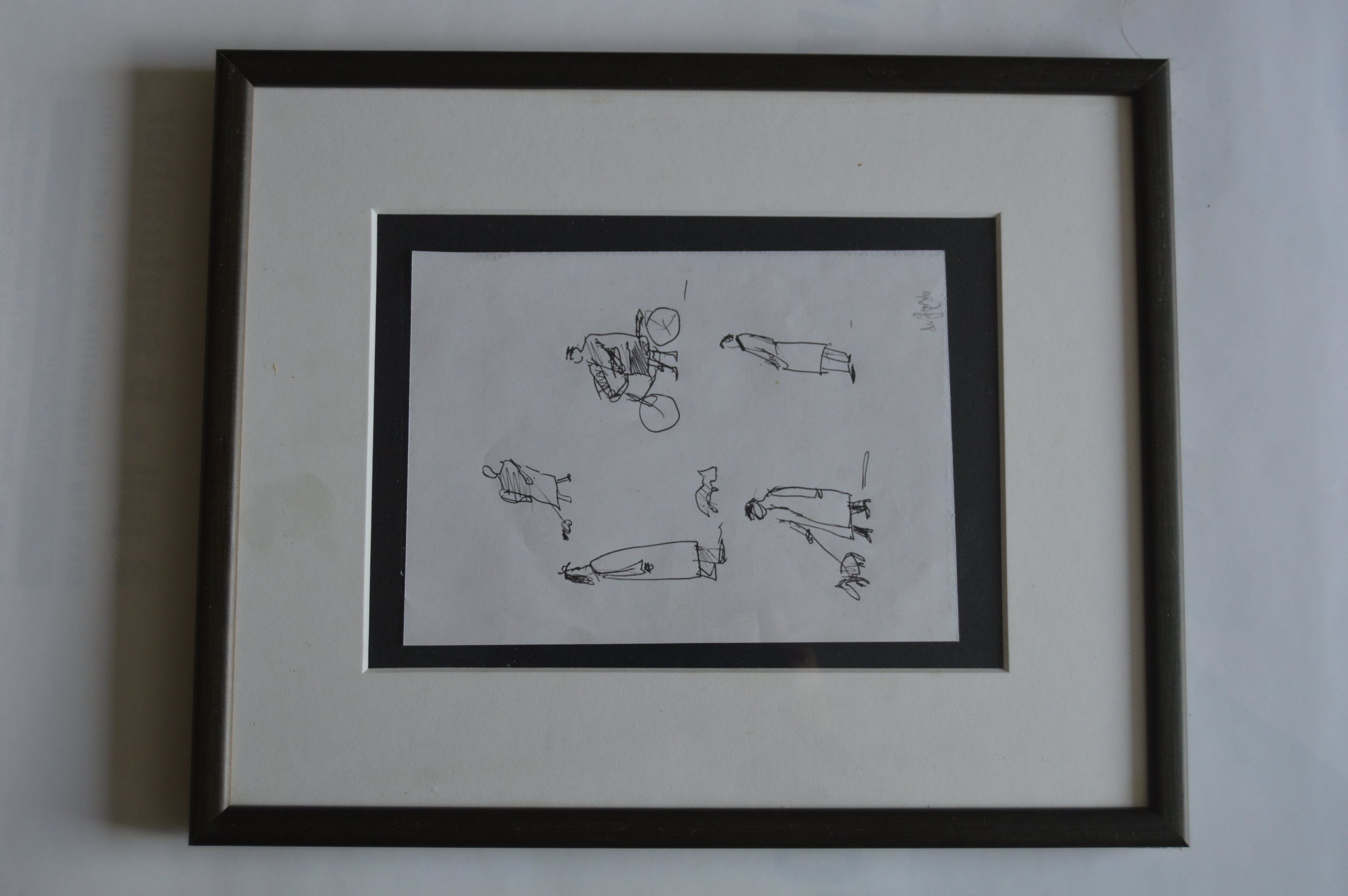 Leuke pentekening van diverse figuren. Ingelijst achter glas. Verzending aangetekend.