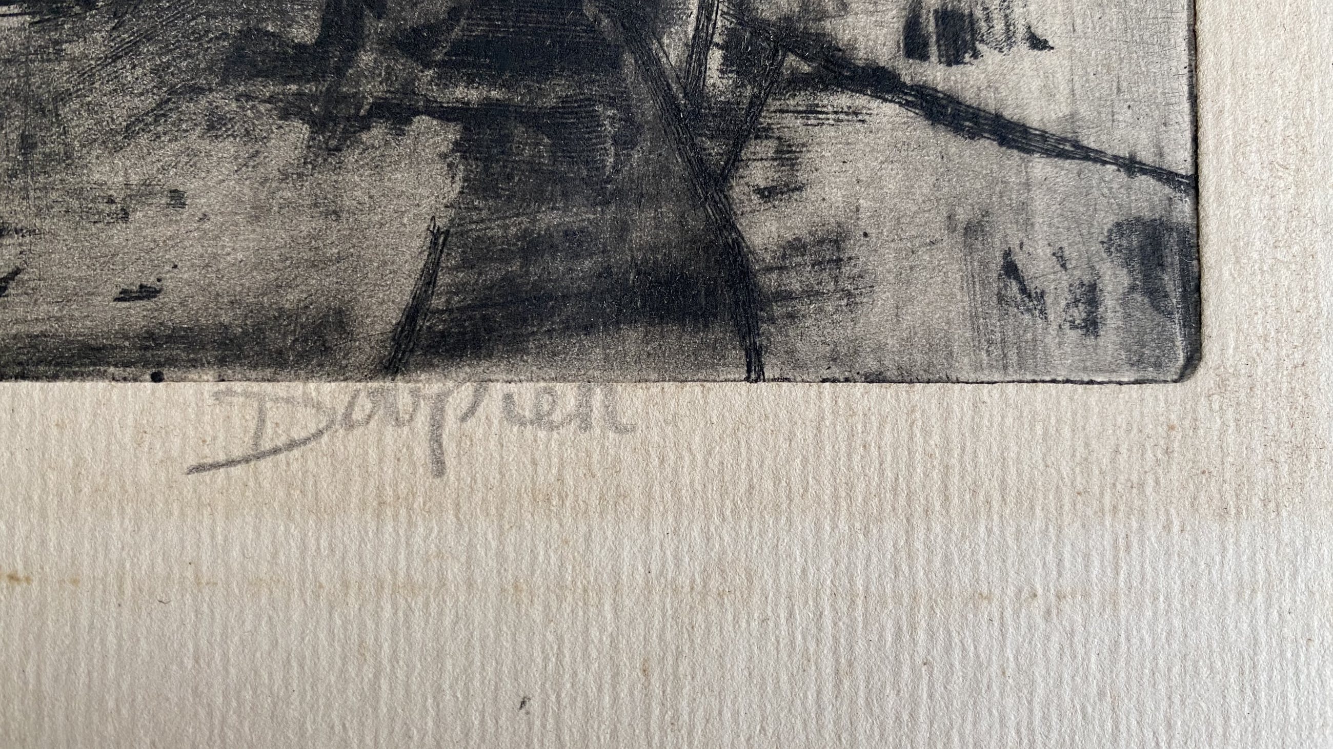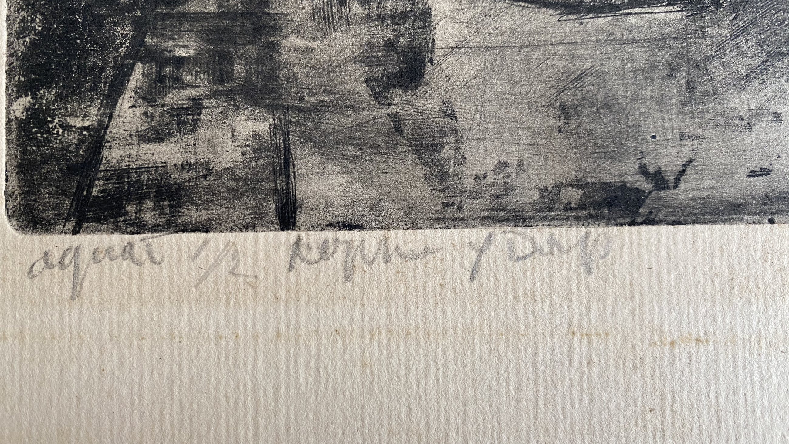 Uit nalatenschap verkregen werk van Leo Dooper. Handgesigneerd en linksonder staat geschreven aquat 1/2. De titel kan ik niet lezen. De passe partout is aan vervanging toe, maar de prent is in goede conditie gezien de leeftijd. Het zal uit de jaren 60 dateren. Het is een prachtig werk. Voor een liefhebber.