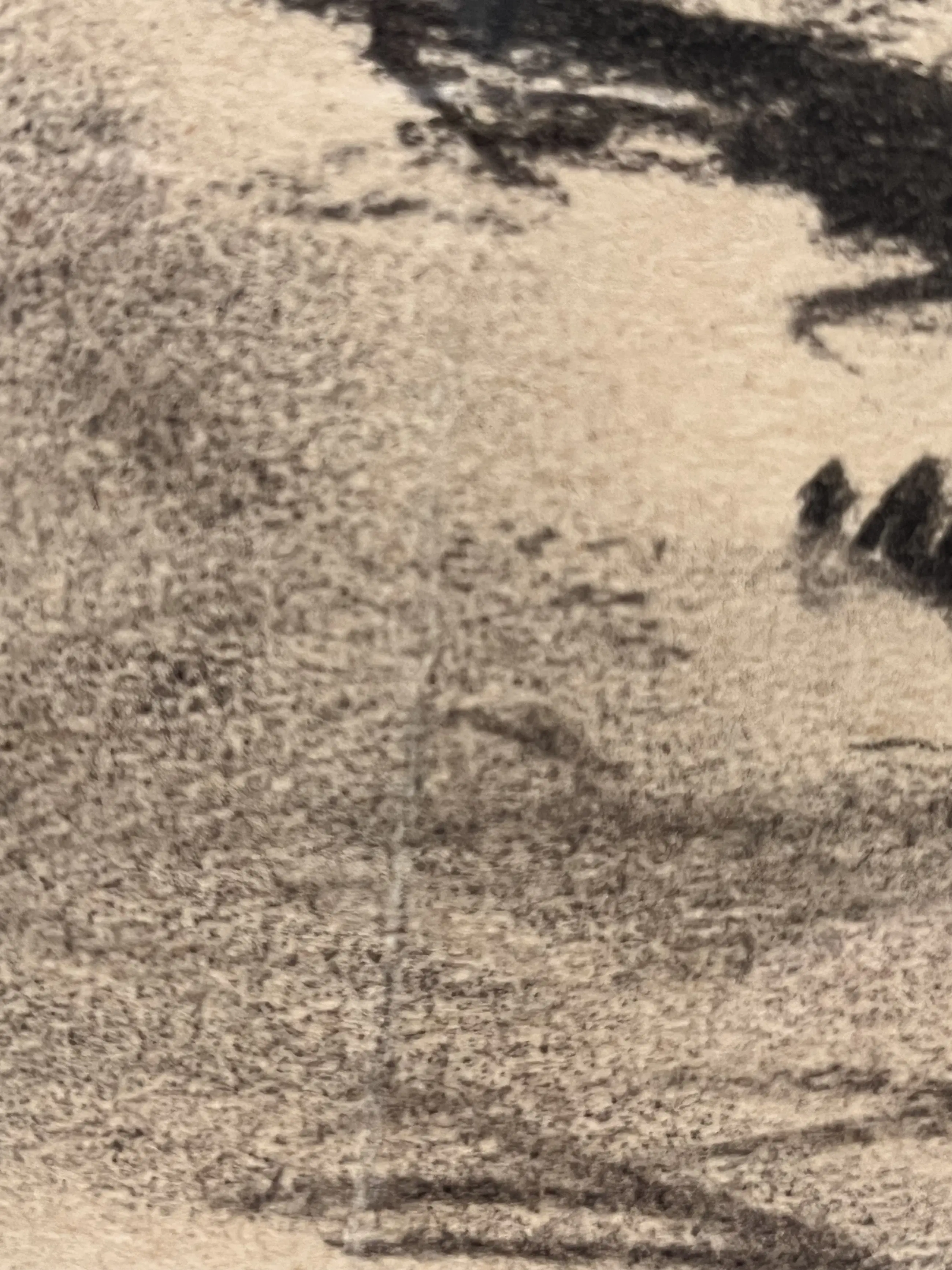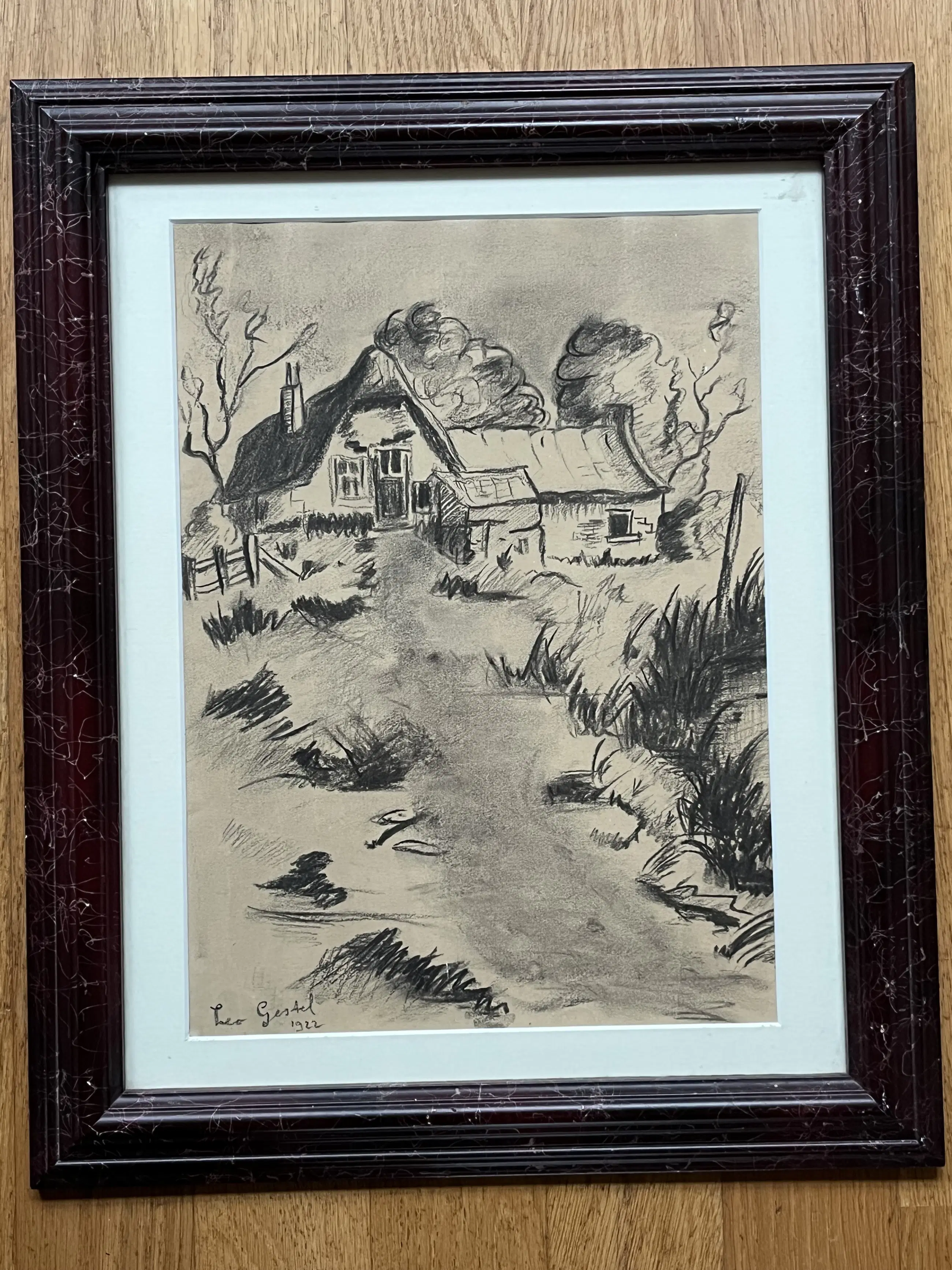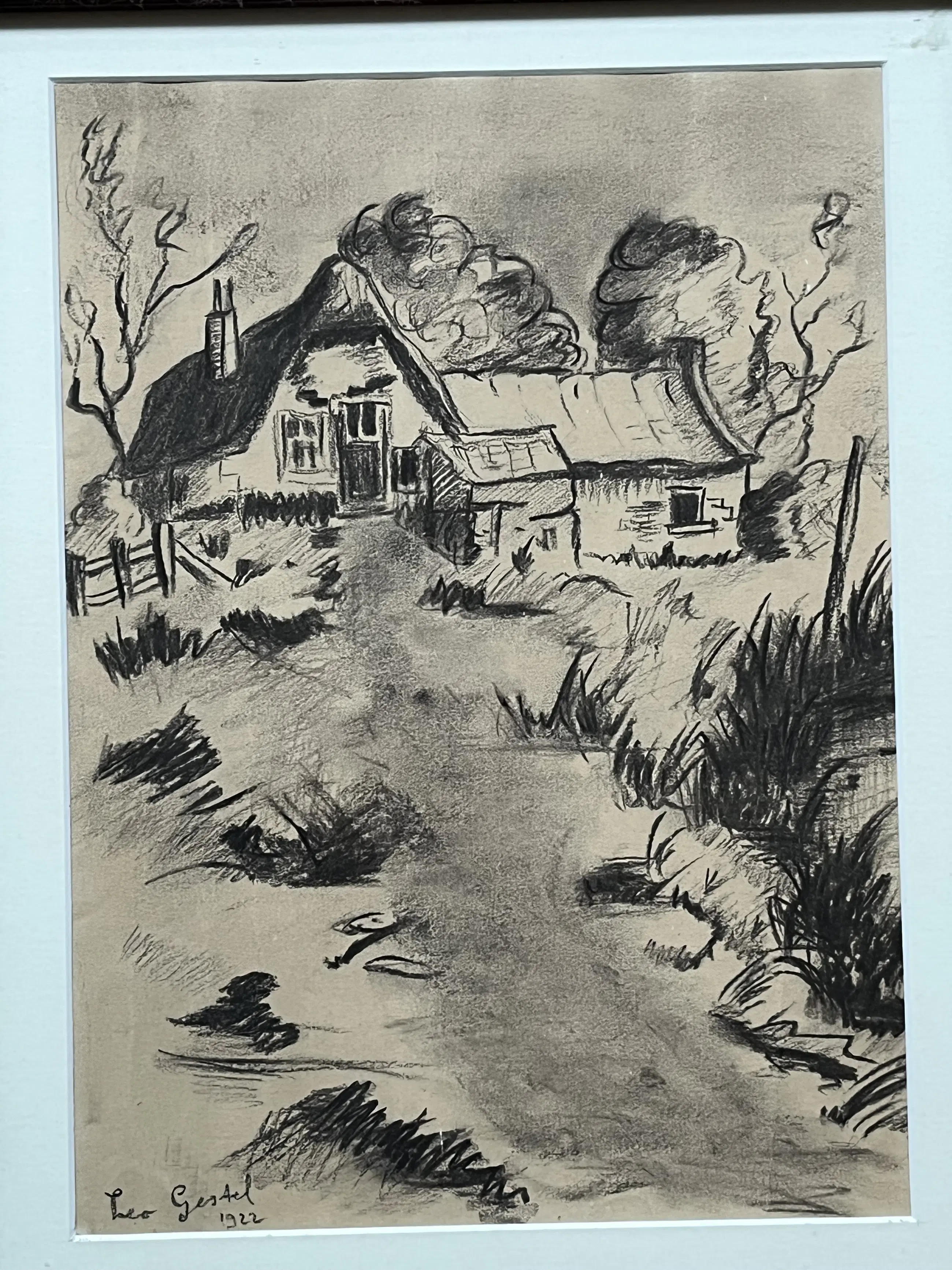 Fraaie tekening uit 1922. Gelijst in marmerkleurige houten lijst. (Lichte gebruikssporen) Aan onderzijde rechts (waar het pad naar de boerderij begint) zit een verticale vouw. (Zie detailfoto) Afmeting afbeelding 41,5 x 30 cm. Inclusief lijst 57 x 46,5 cm.