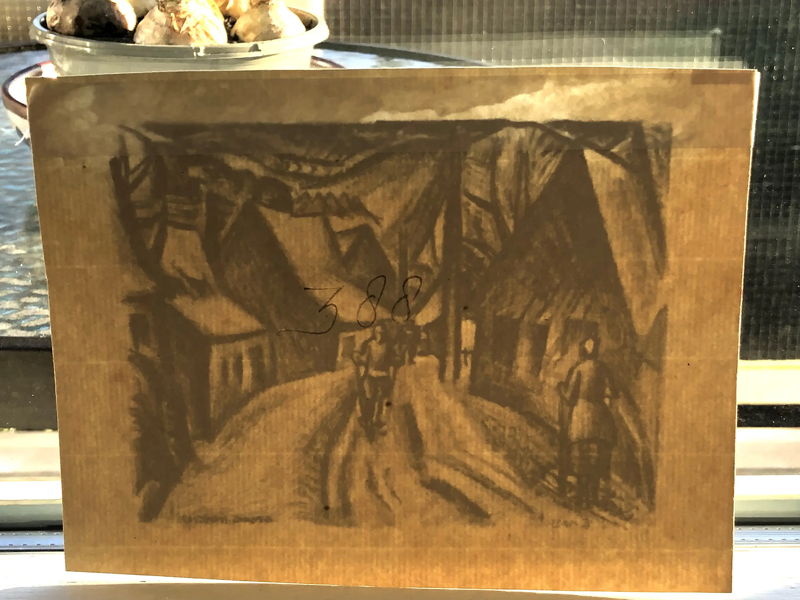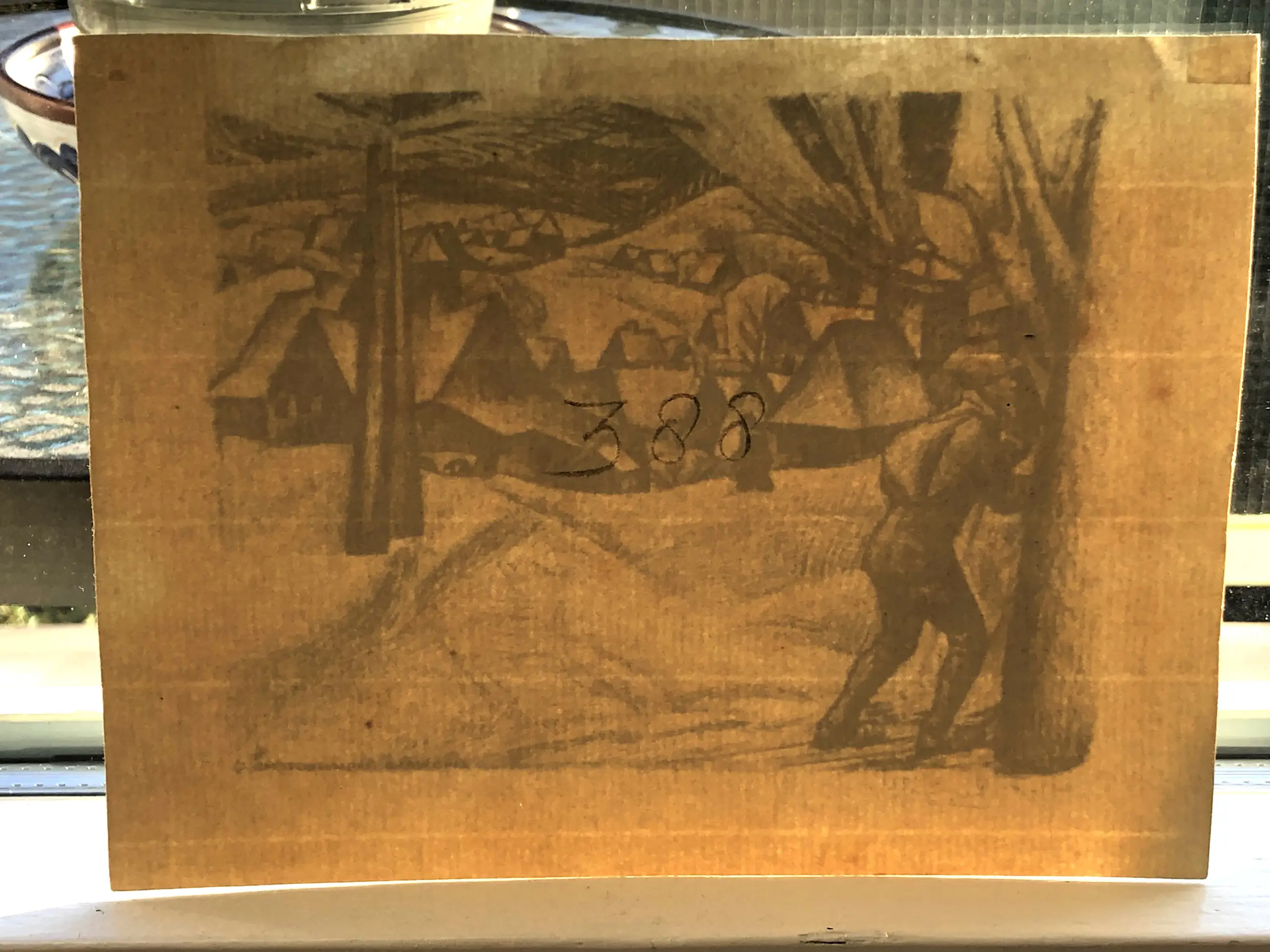 2. “Zinnwald (ertsgebergte)”. Formaat litho 11 x 14,6 cm, papier 14 x 19 cm. Voorzijde in redelijk goede staat, ongelijke kleur namelijk bovenste rand iets lichter dan de rest van de litho. Aan de achterzijde kleine taperest in de bovenhoek, gevolgen van verwijderen tape langs de bovenrand zichtbaar. Ook bij deze in potlood het nummer 388.