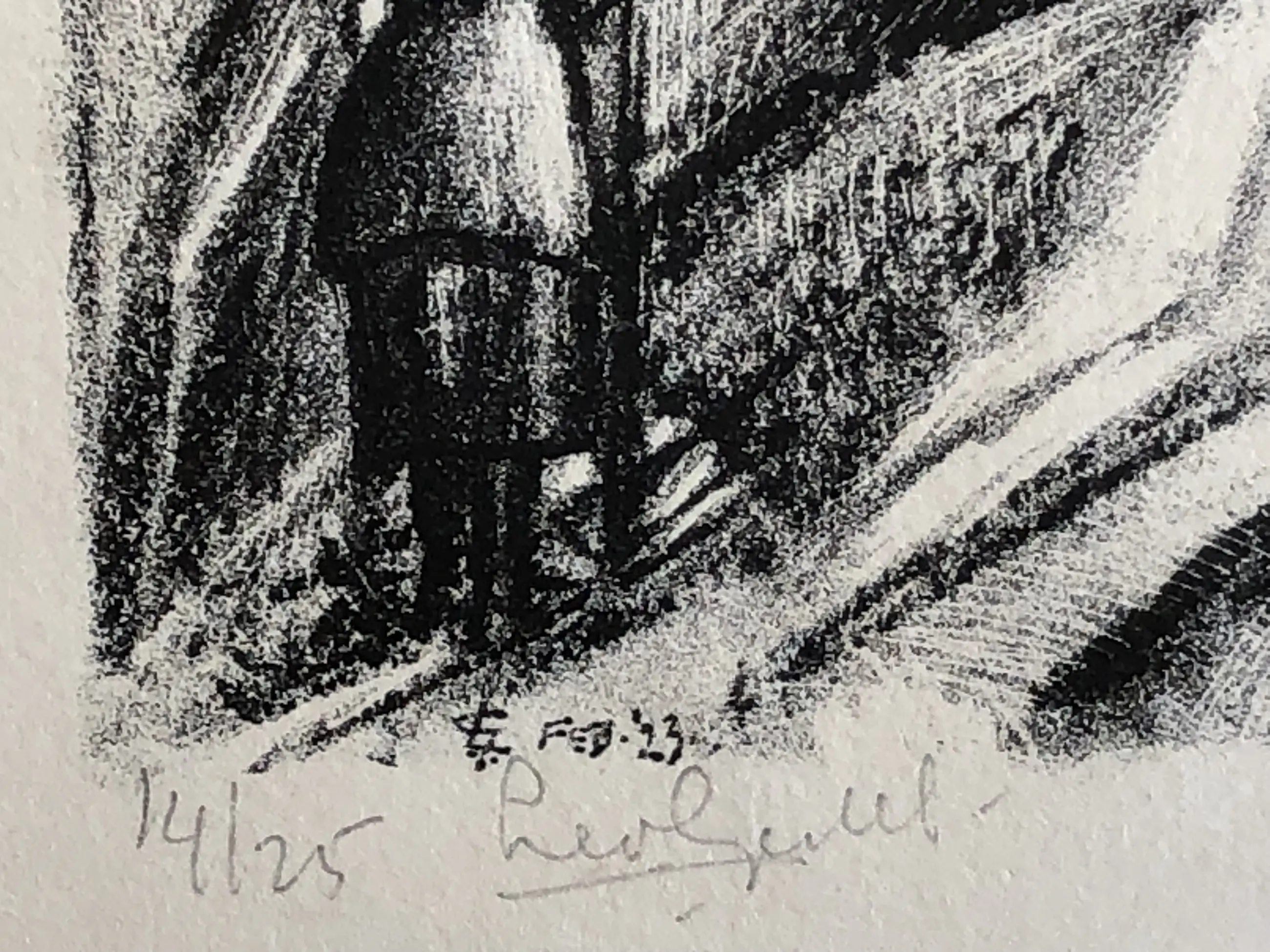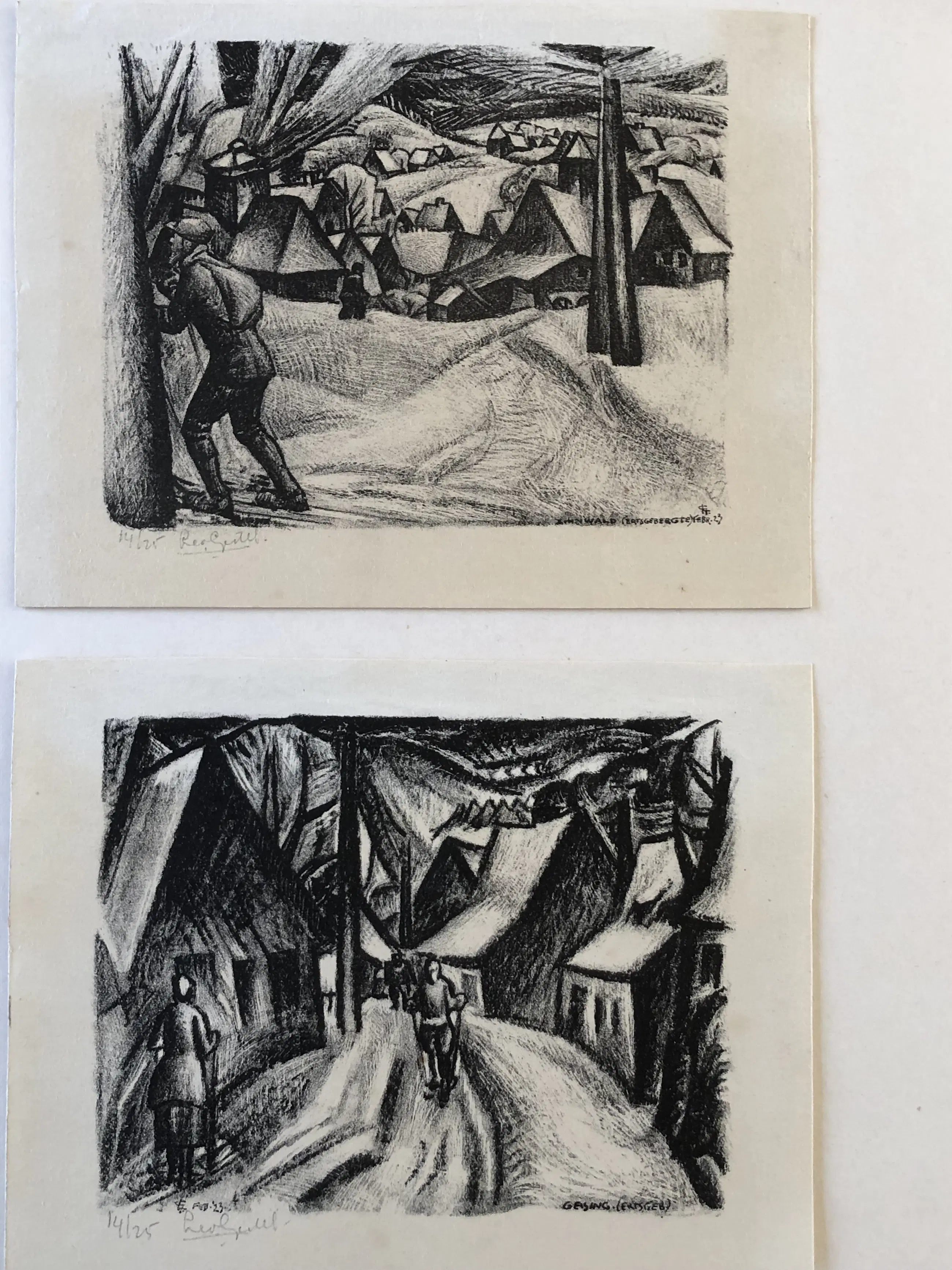Twee litho’s uit de zeer zeldzame serie met wintervoorstellingen in het Ertsgebergte. De oplage is slechts 25 exx en de serie is nooit herdrukt. Beide litho’s zijn gesigneerd en genummerd met potlood in de onderste marge en tevens in de druk onderin monogram, gedateerd feb. ’23 en met titel (plaats). Op de achterzijde in potlood het nummer 388, mogelijk een catalogusnummer van een eerdere verzamelaar.