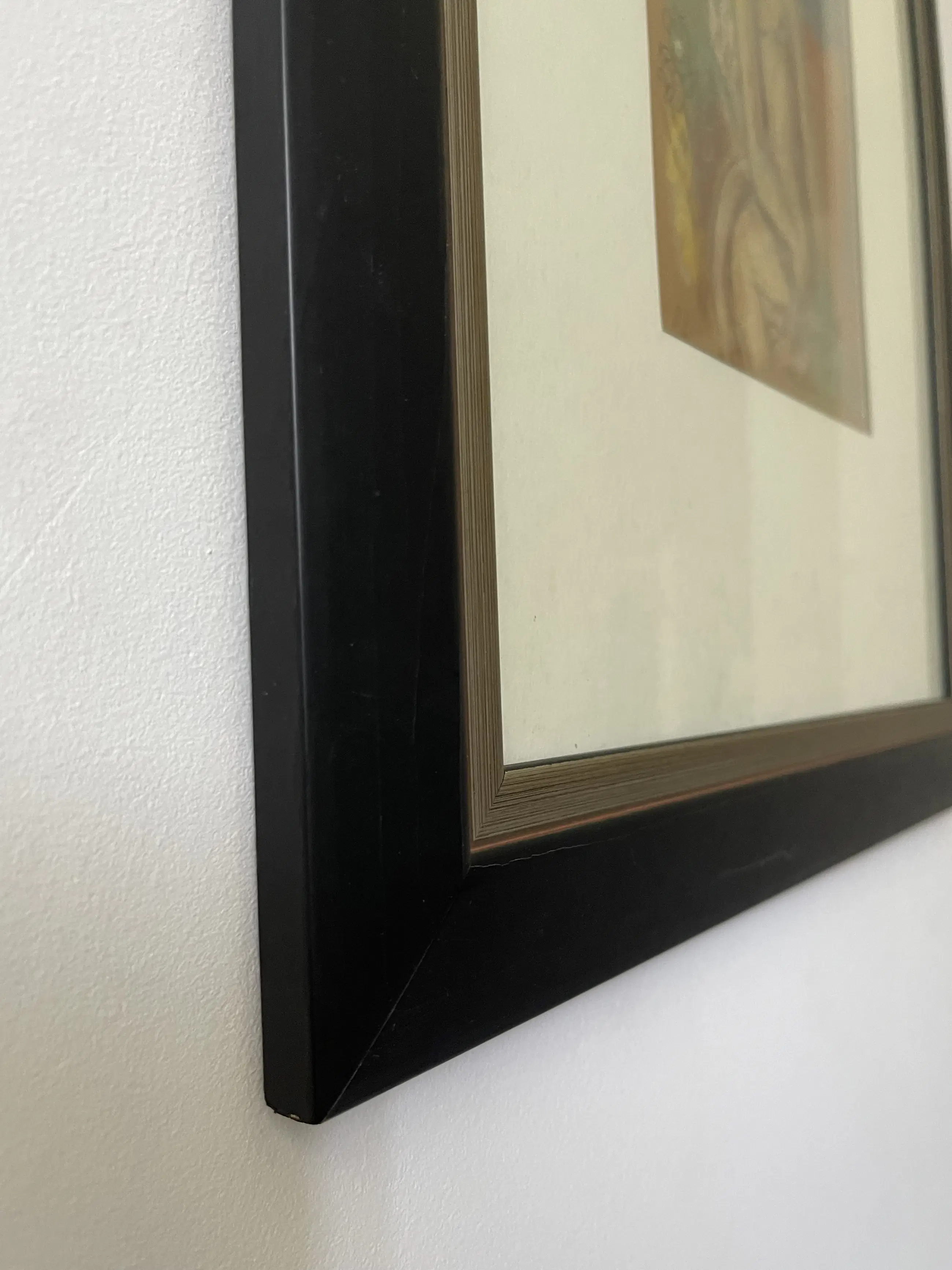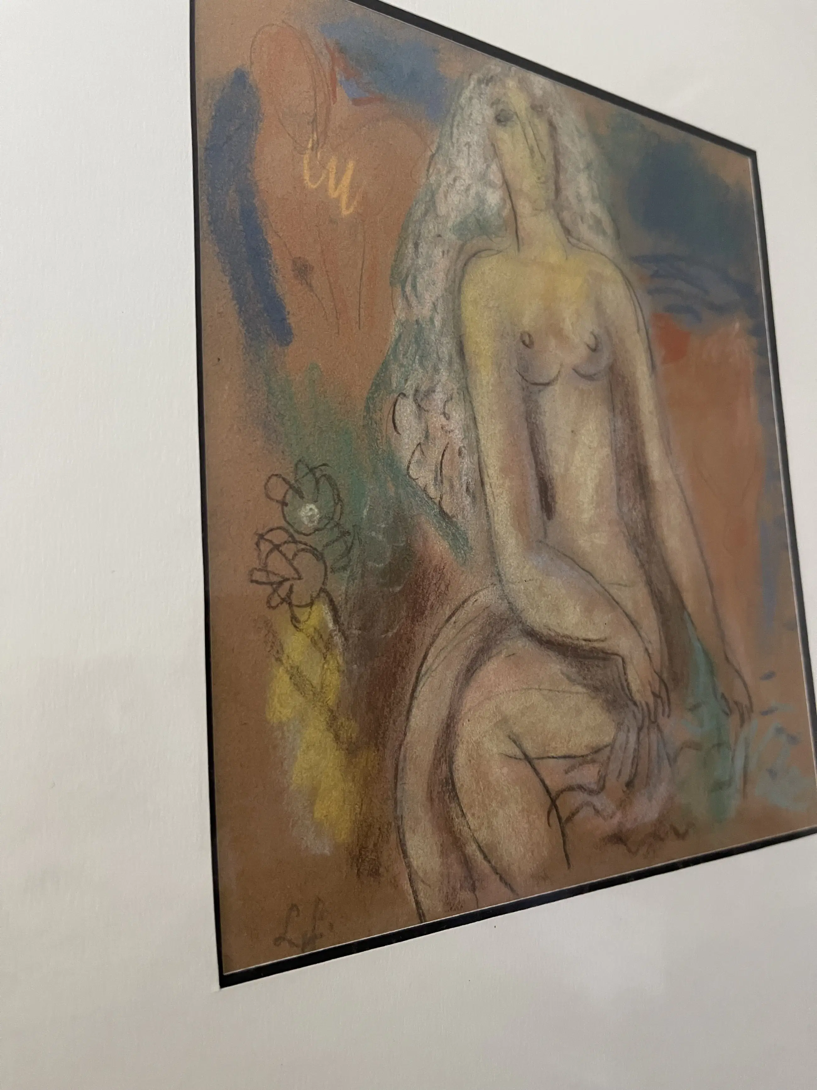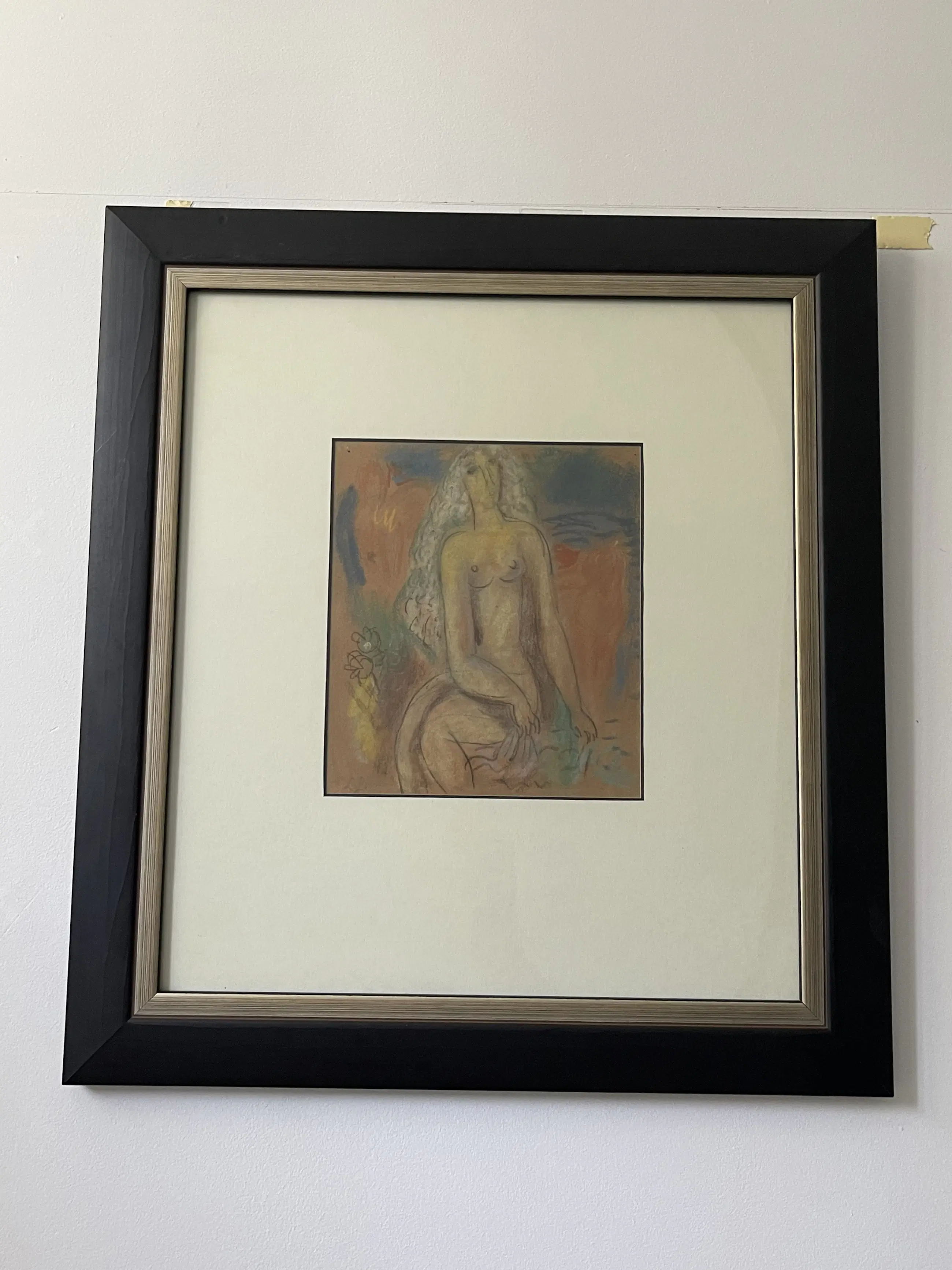 Een prachtig werk van Leo Gestel in een zwarte lijst met zilveren rand. Afgebeeld een naakte, zittende dame op een gekleurde achtergrond. Zowel de lijst als het werk verkeren in zeer goede staat.
