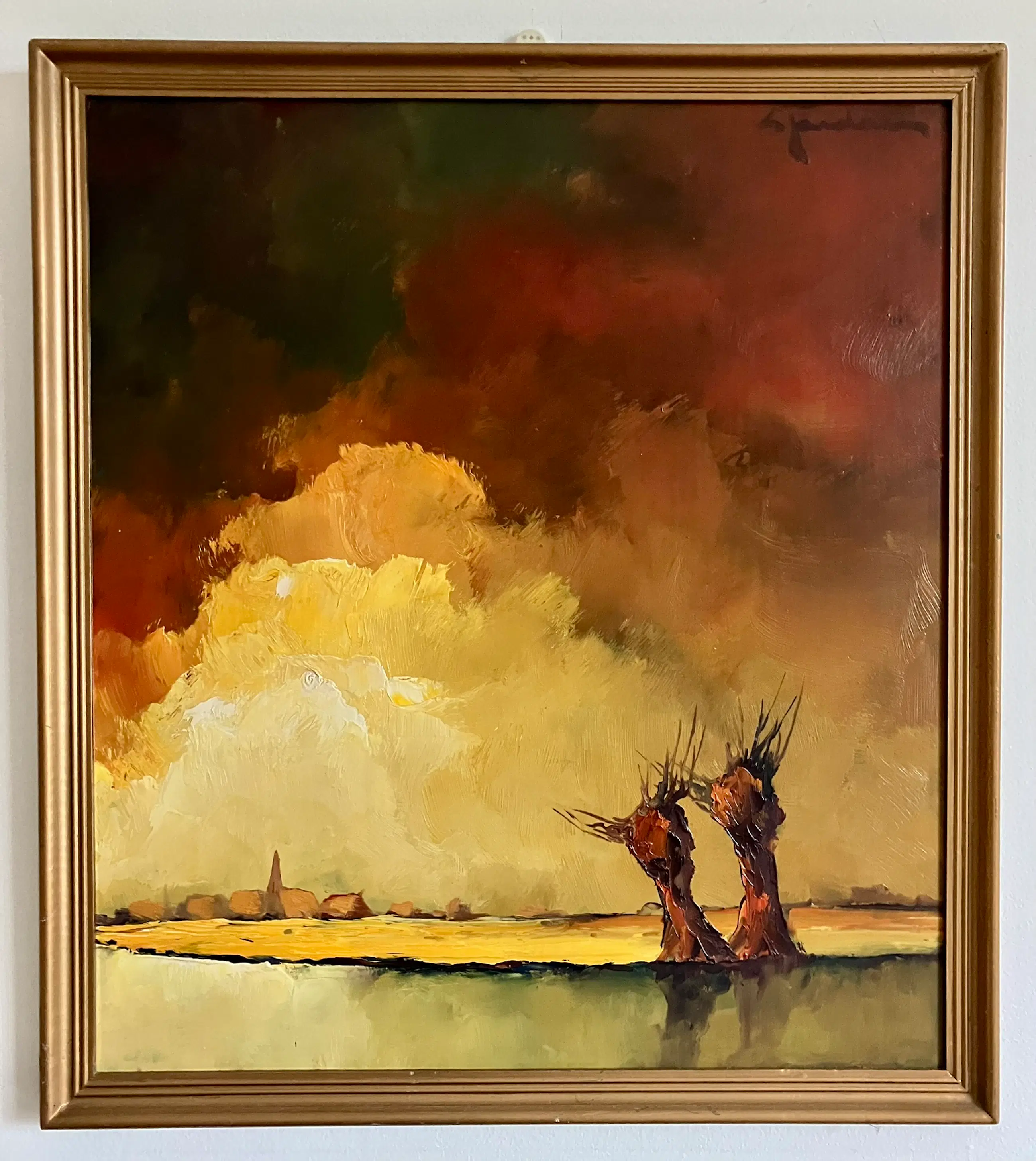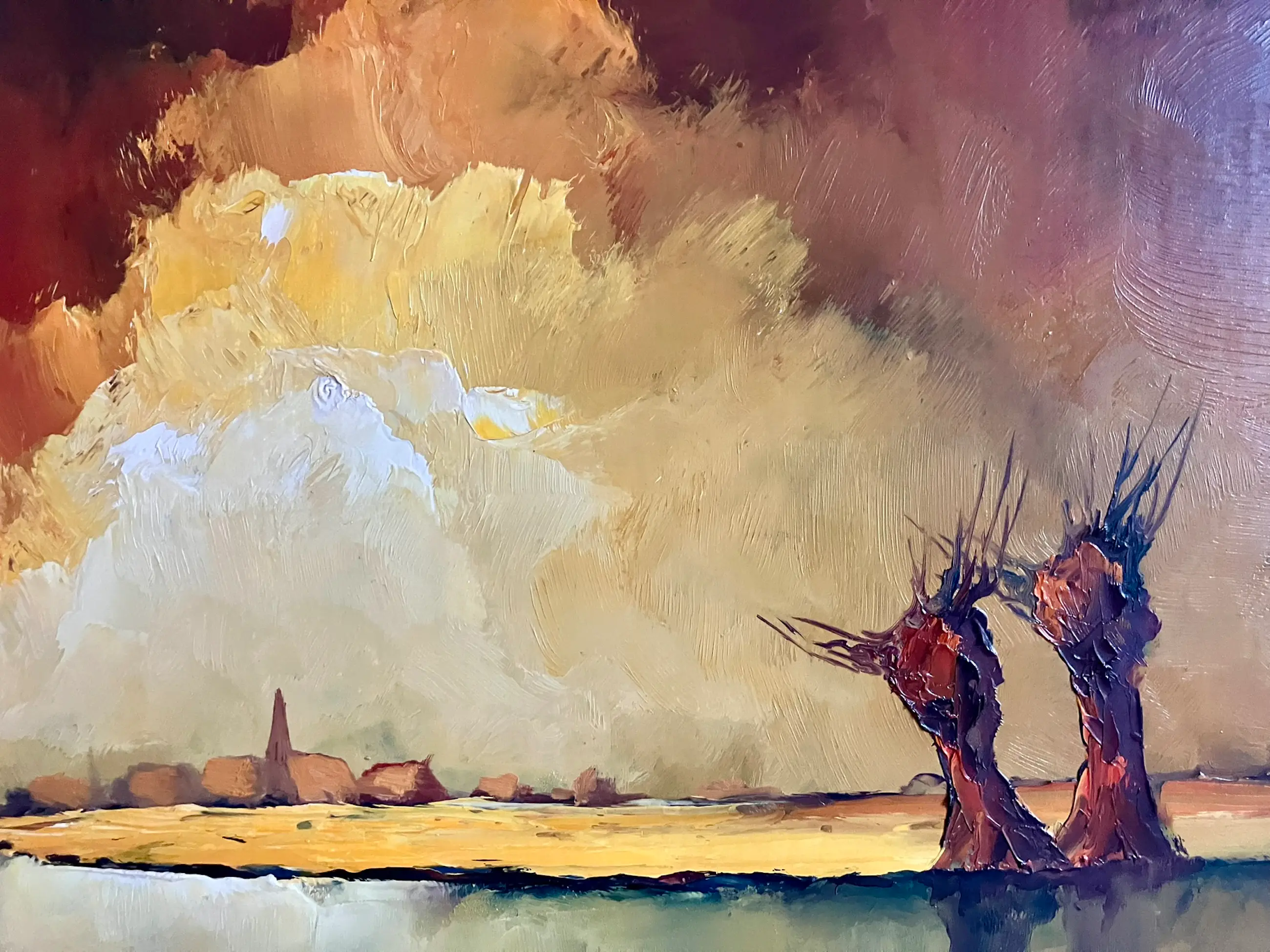 Kenmerken van het werk : Onderwerp: Het werk toont een kleurrijk Vlaams landschap met twee karakteristieke knotwilgen aan het water. Stijl: Jordaens stond bekend om zijn expressieve gebruik van kleur en licht, vaak met een zonovergoten of dramatische lucht. Signatuur: Het werk is door de kunstenaar gesigneerd rechtsboven.