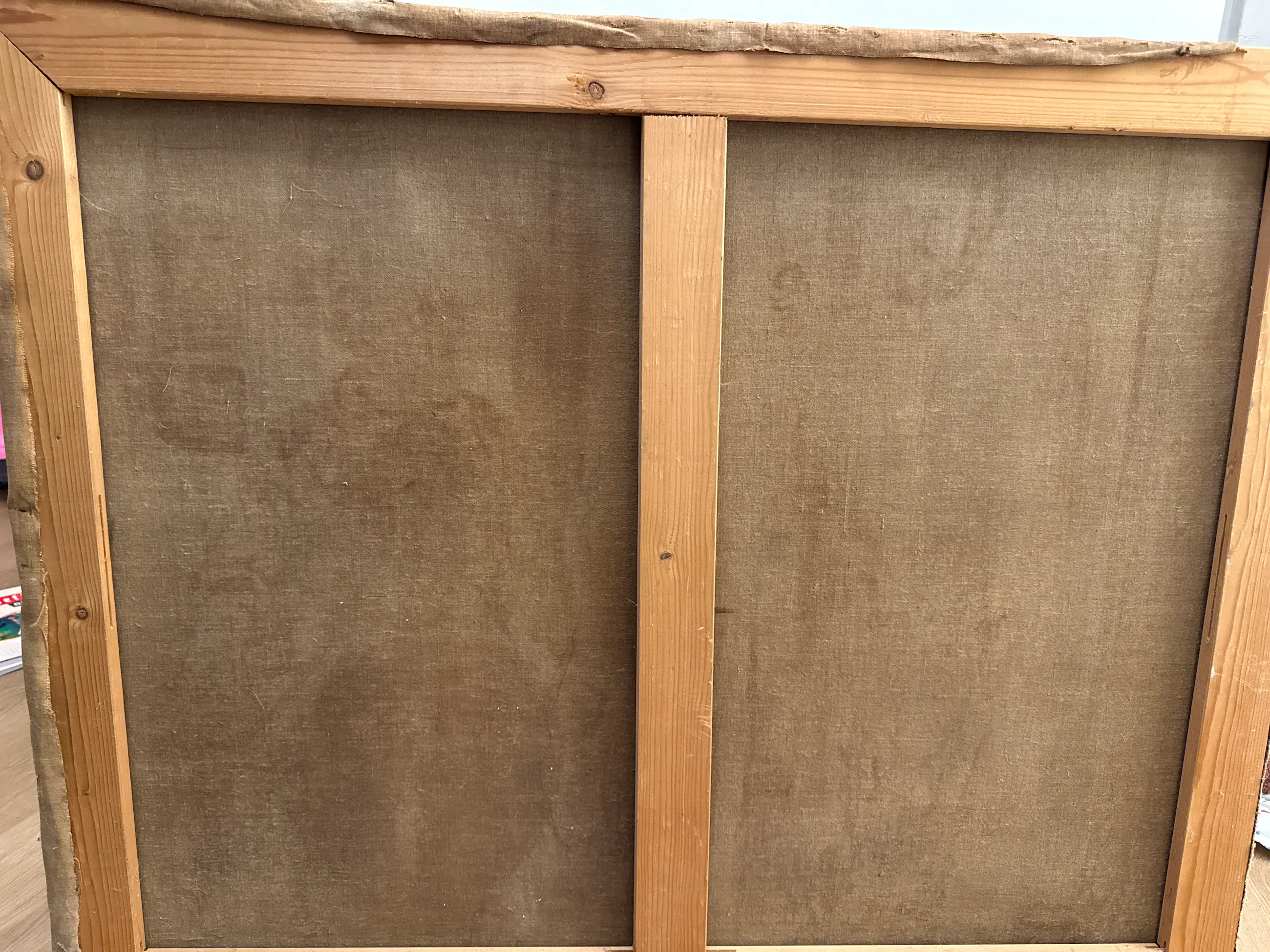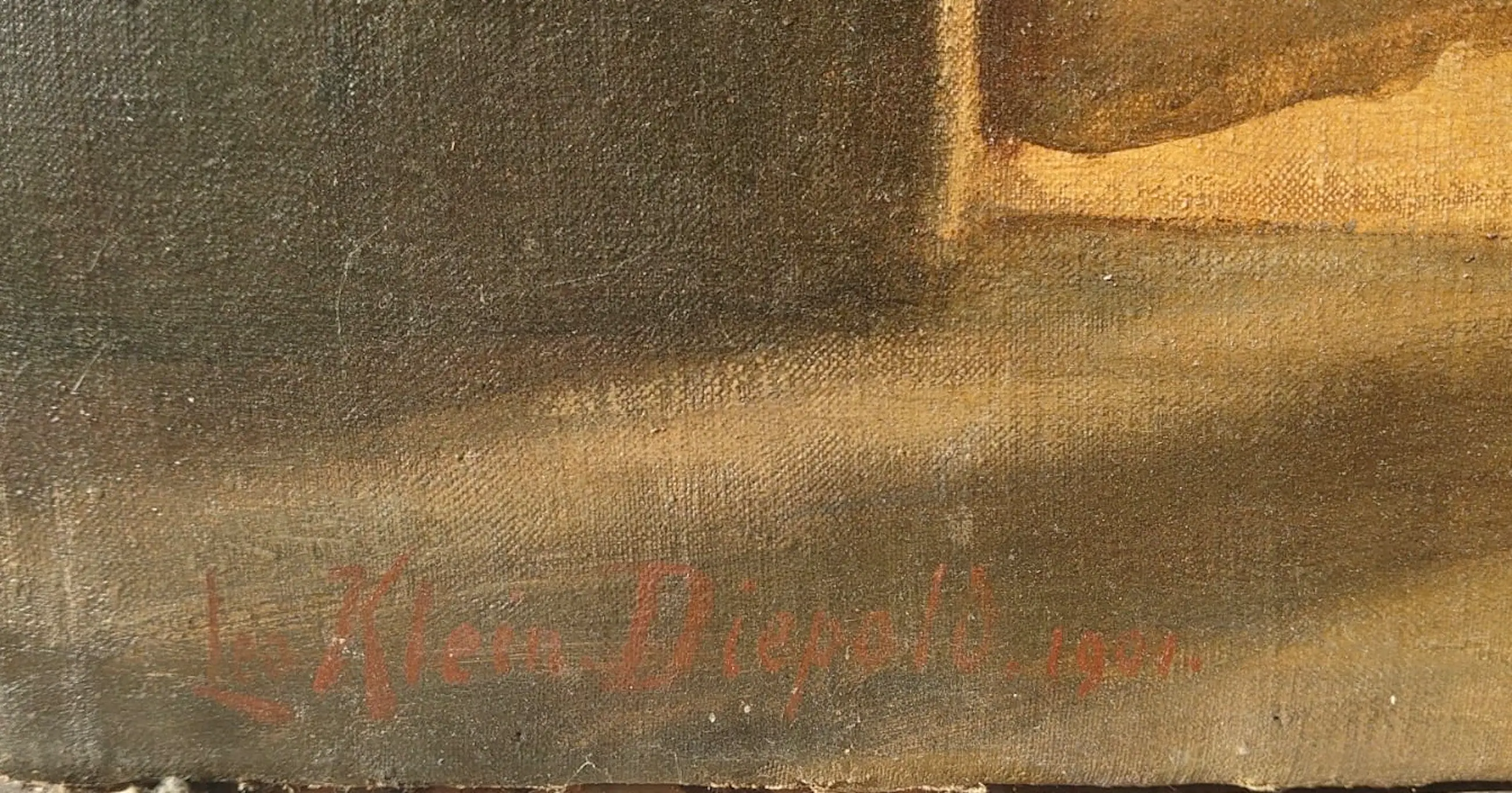 Doek is heel, een paar beschadigingen (krasjes) zichtbaar op het schilderij.