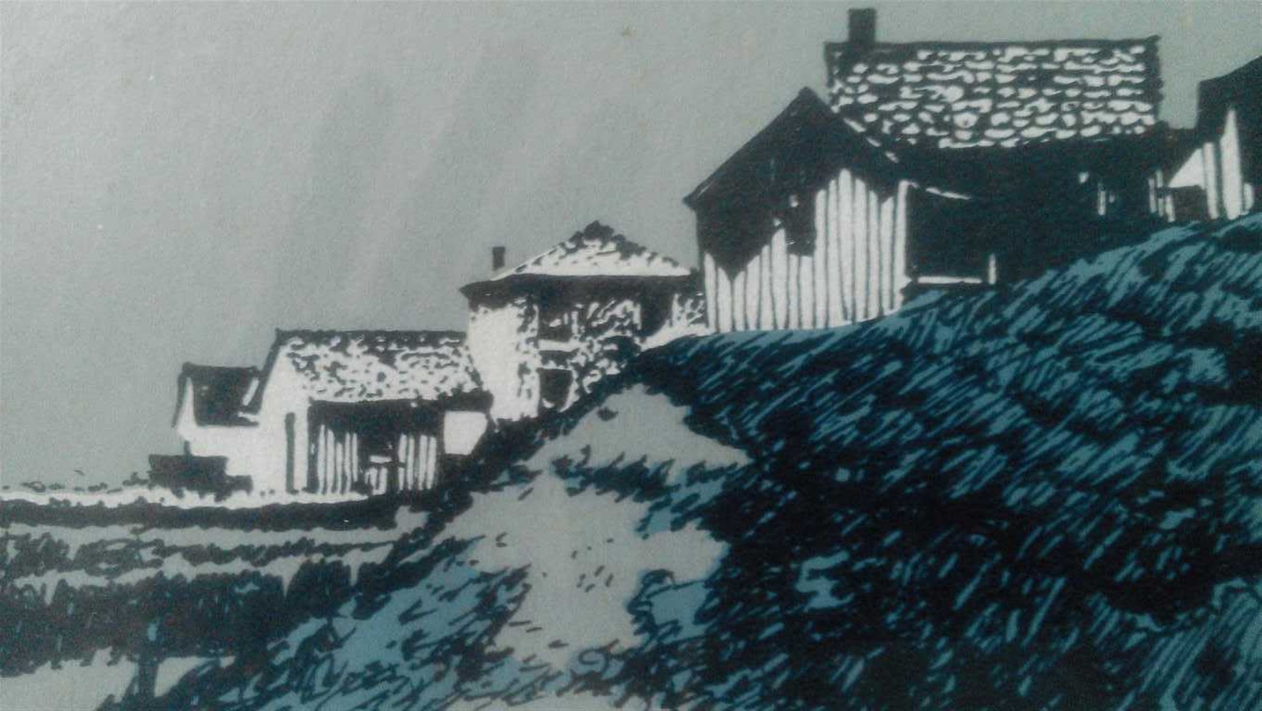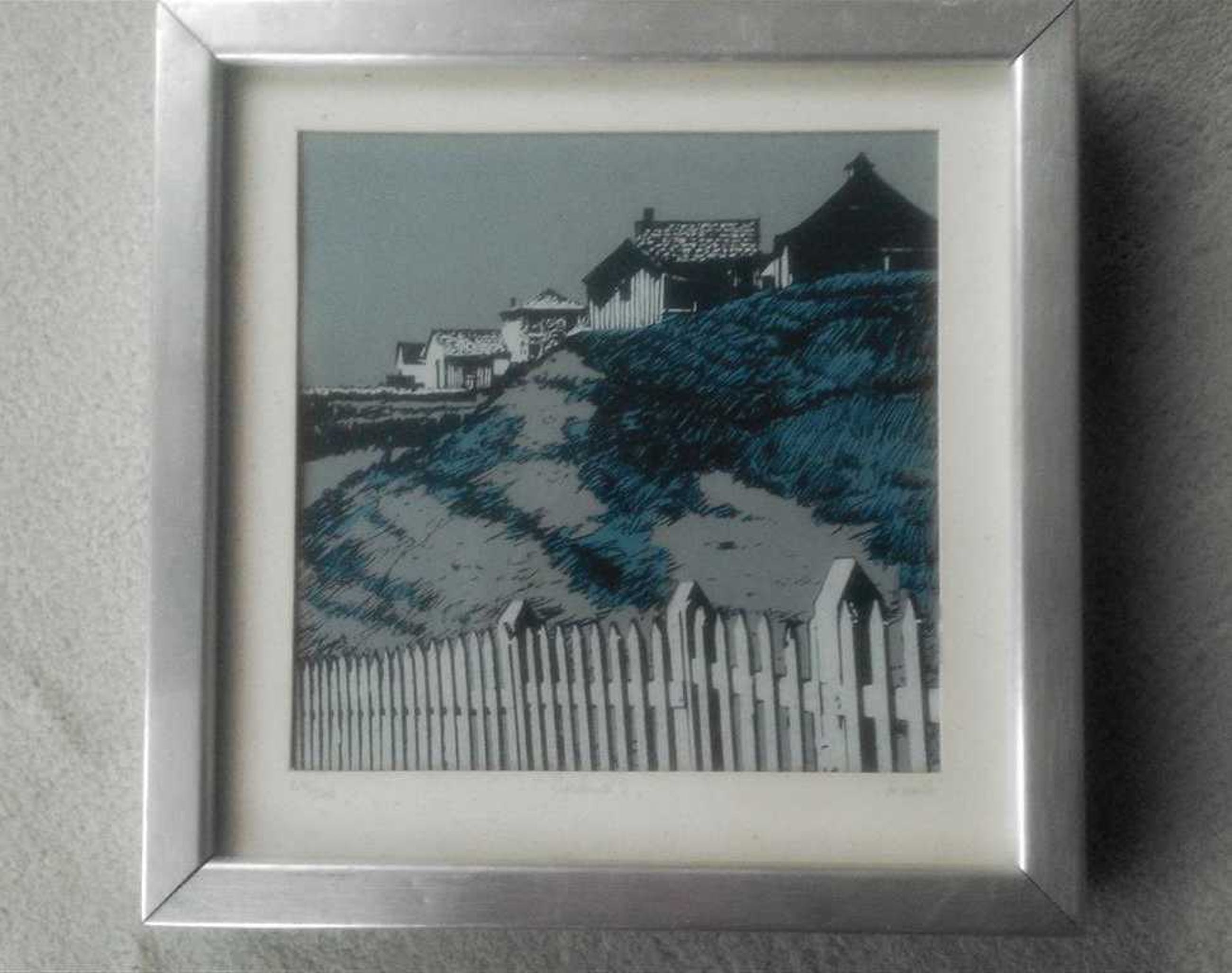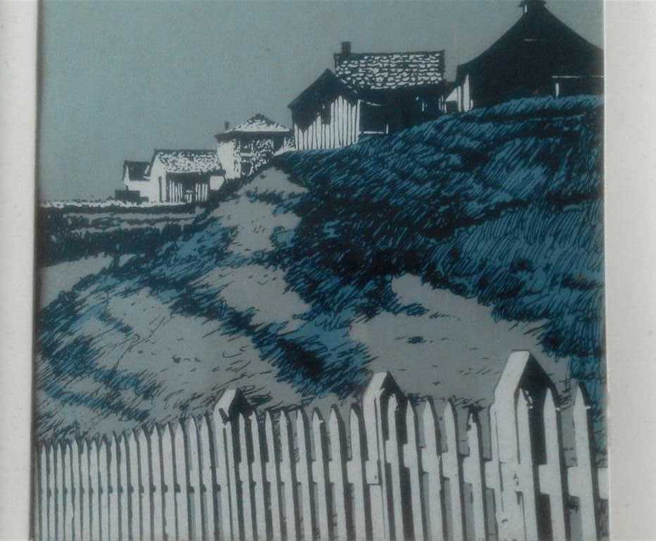 In blauwtinten houten hek duinen en huizen genummerd en gesigneerd