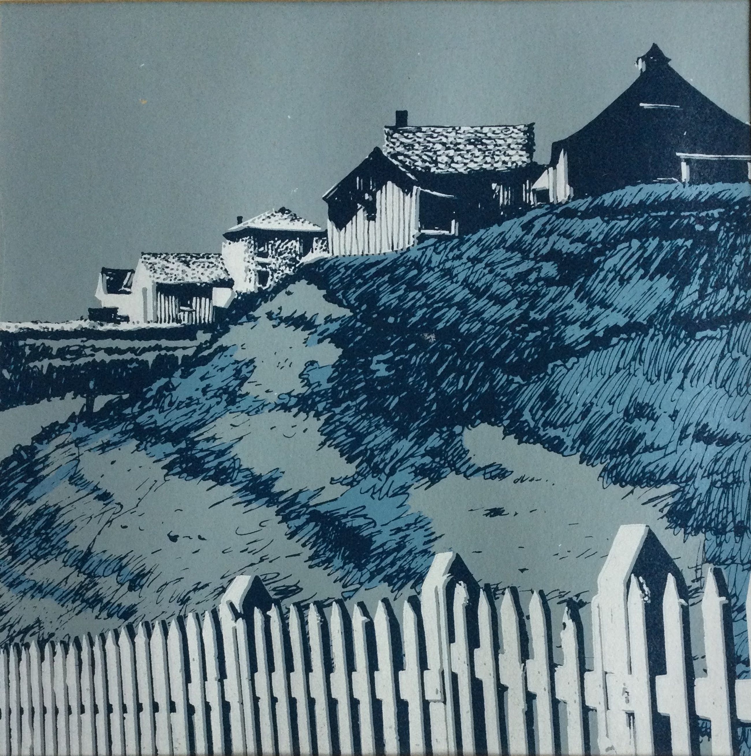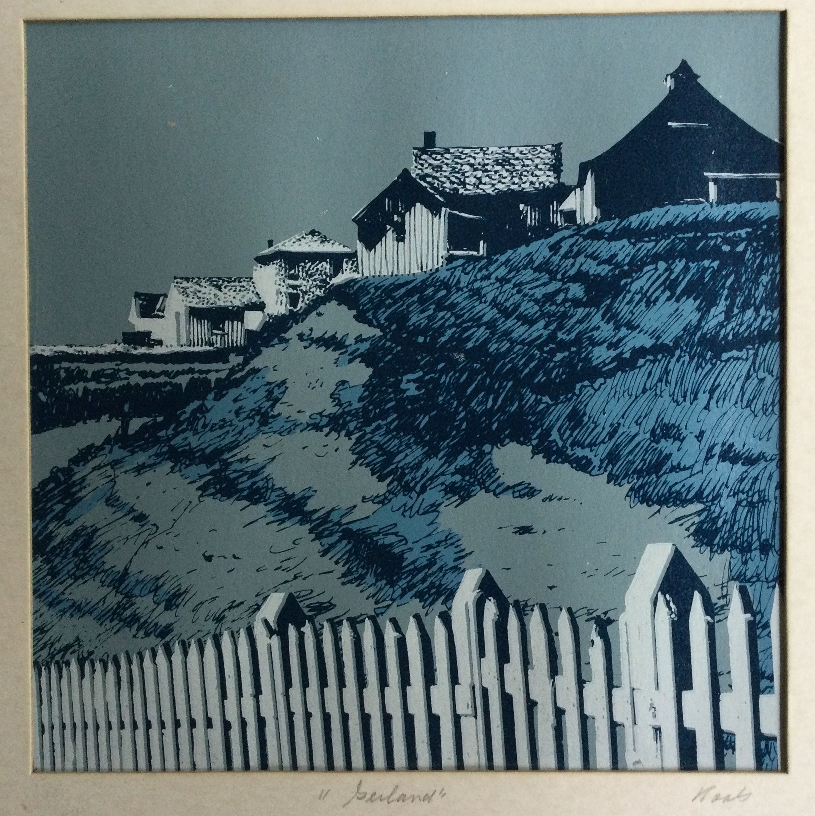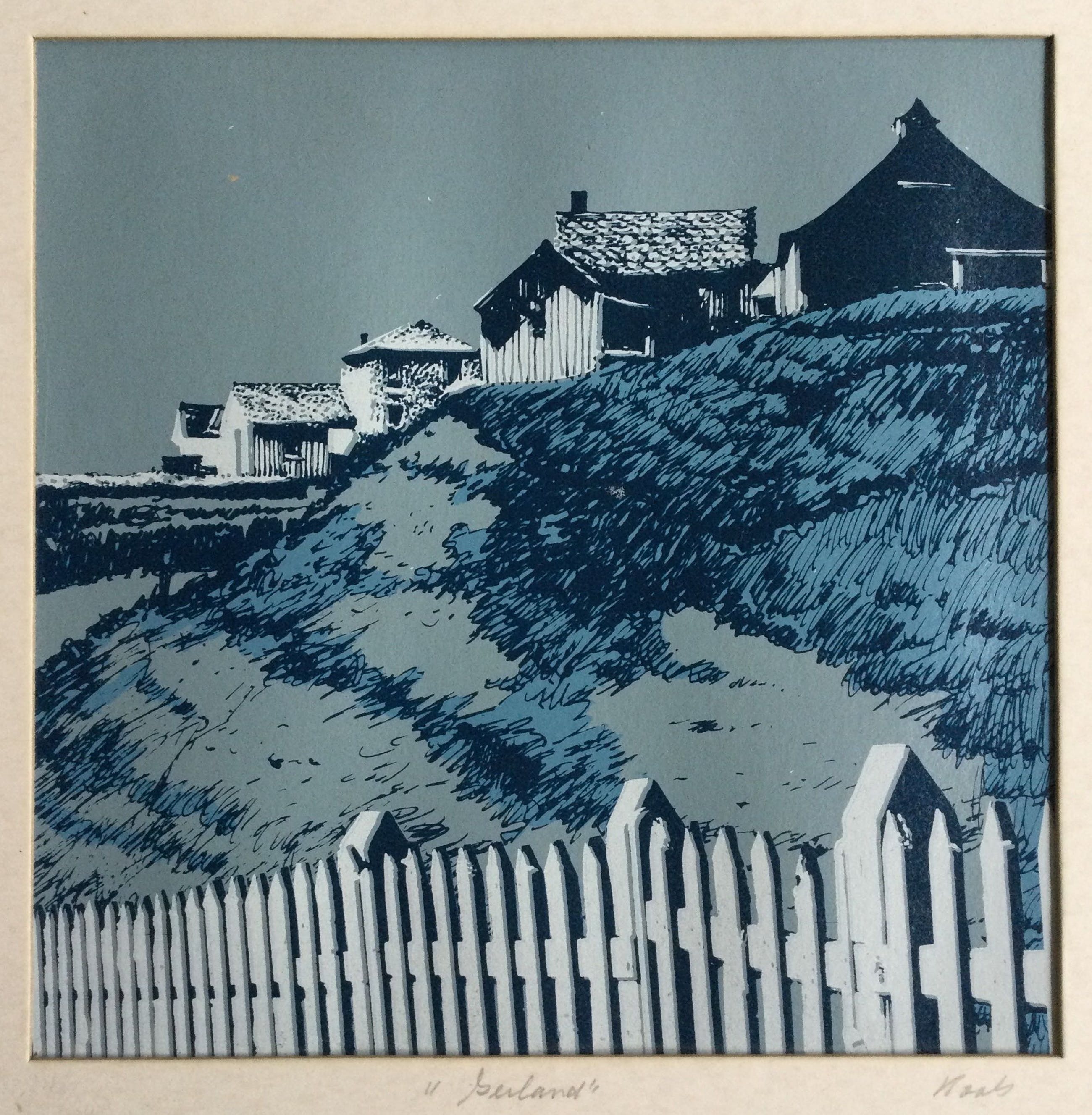 Kleurenzeefdruk in blauwtinten van Leo Kools (1941) getiteld 'Ierland'. Het verbeeldt enkele huizen in de duinen achter een houten hek. Waarschijnlijk gemaakt in 1974. Dit exemplaar is met potlood op het passe-partout gesigneerd en ongenummerd. De originele oplage is 300 exemplaren. Op de achterzijde van het blad zit een stempel als echtheidscertificaat. In eenvoudige kunststoffen lijst met ontspiegeld glas. Het passe-partout (karton) is wat vlekkerig, sporen van ouderdom. De foto's maken deel uit van de beschrijving.