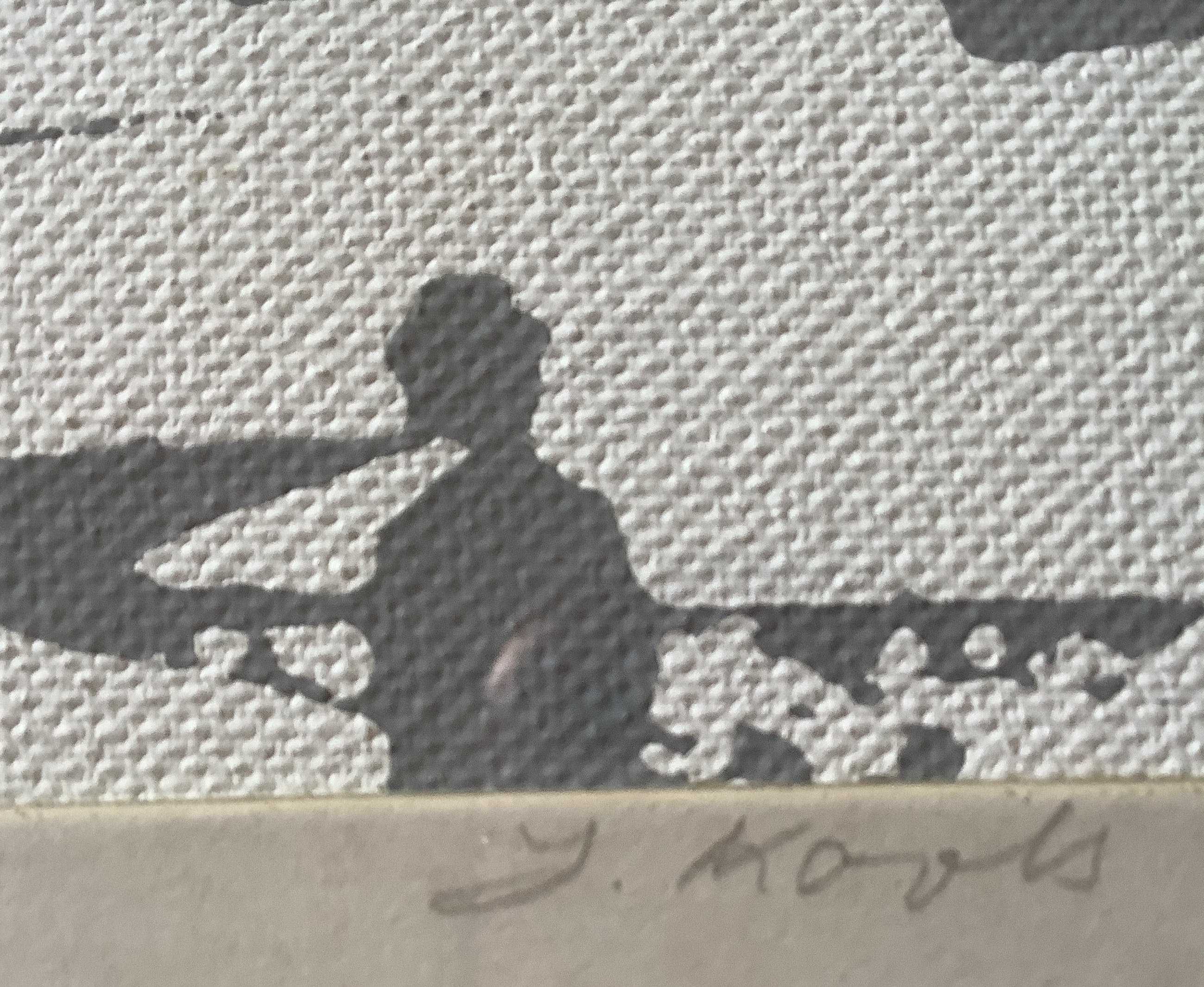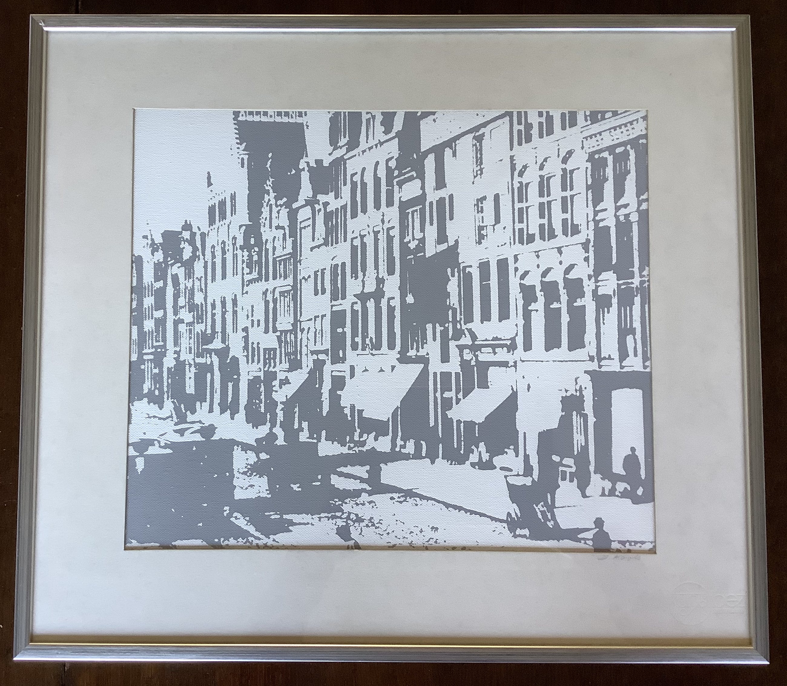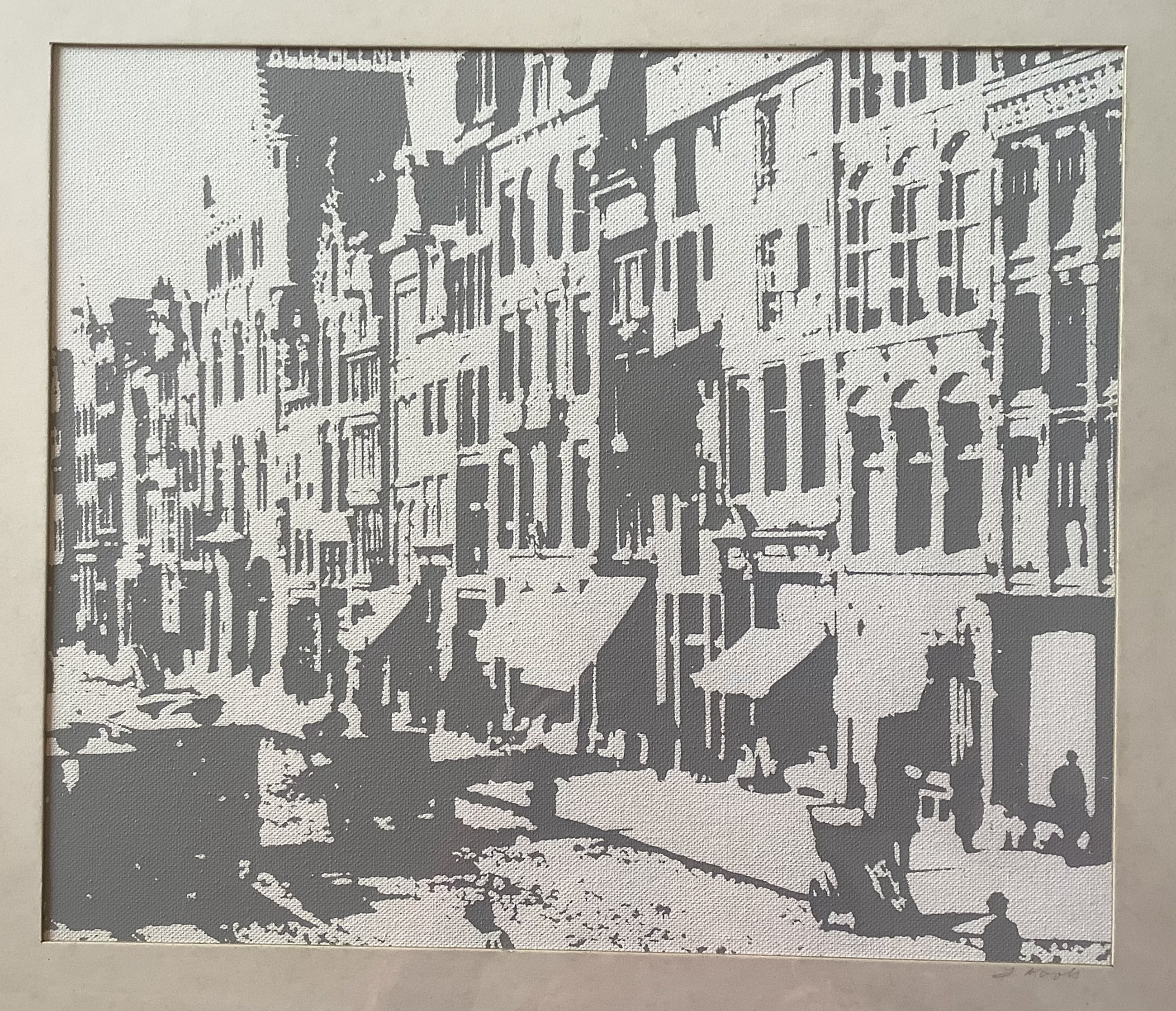 Zeefdruk op canvas van een stadsgezicht van Leo Kools.