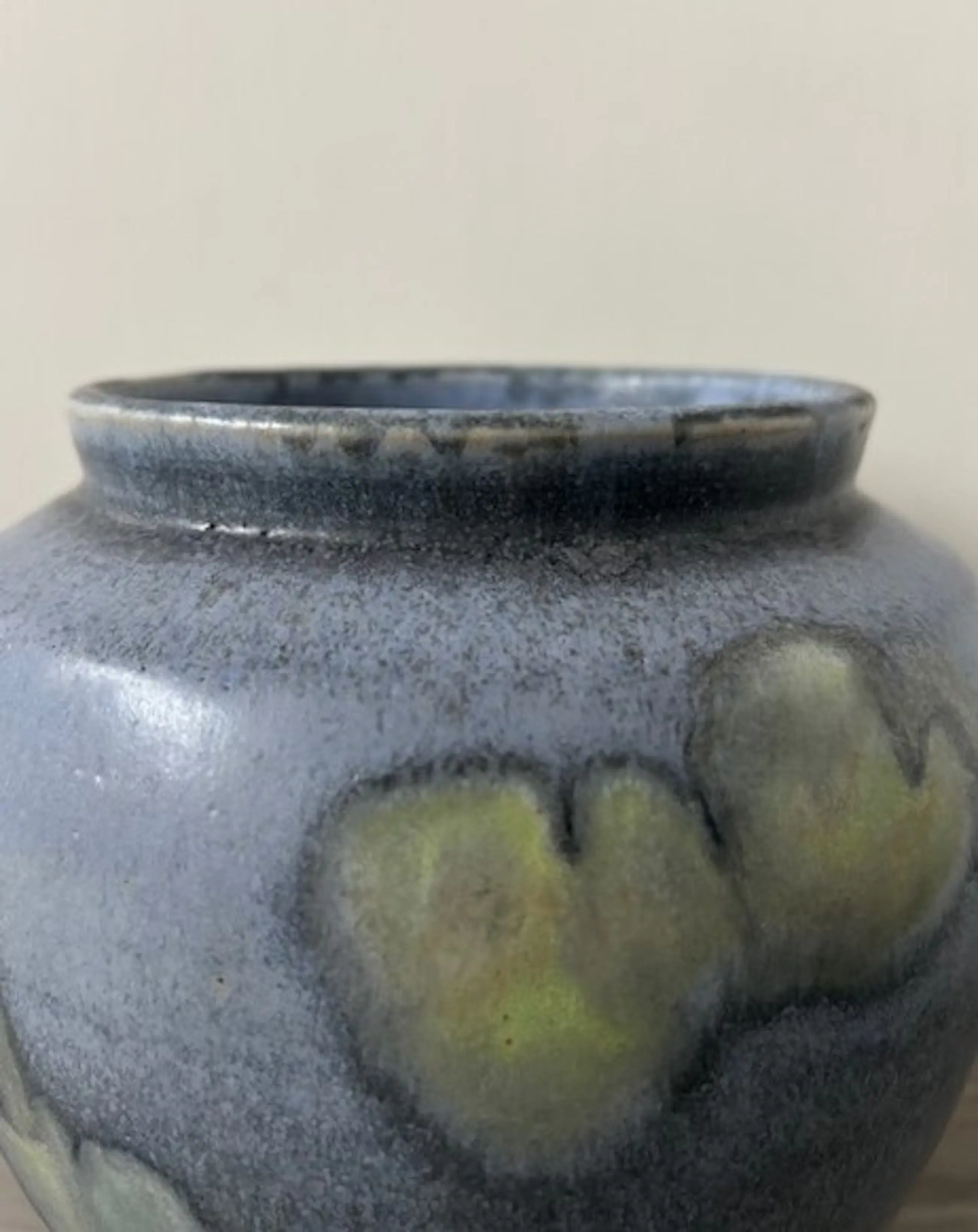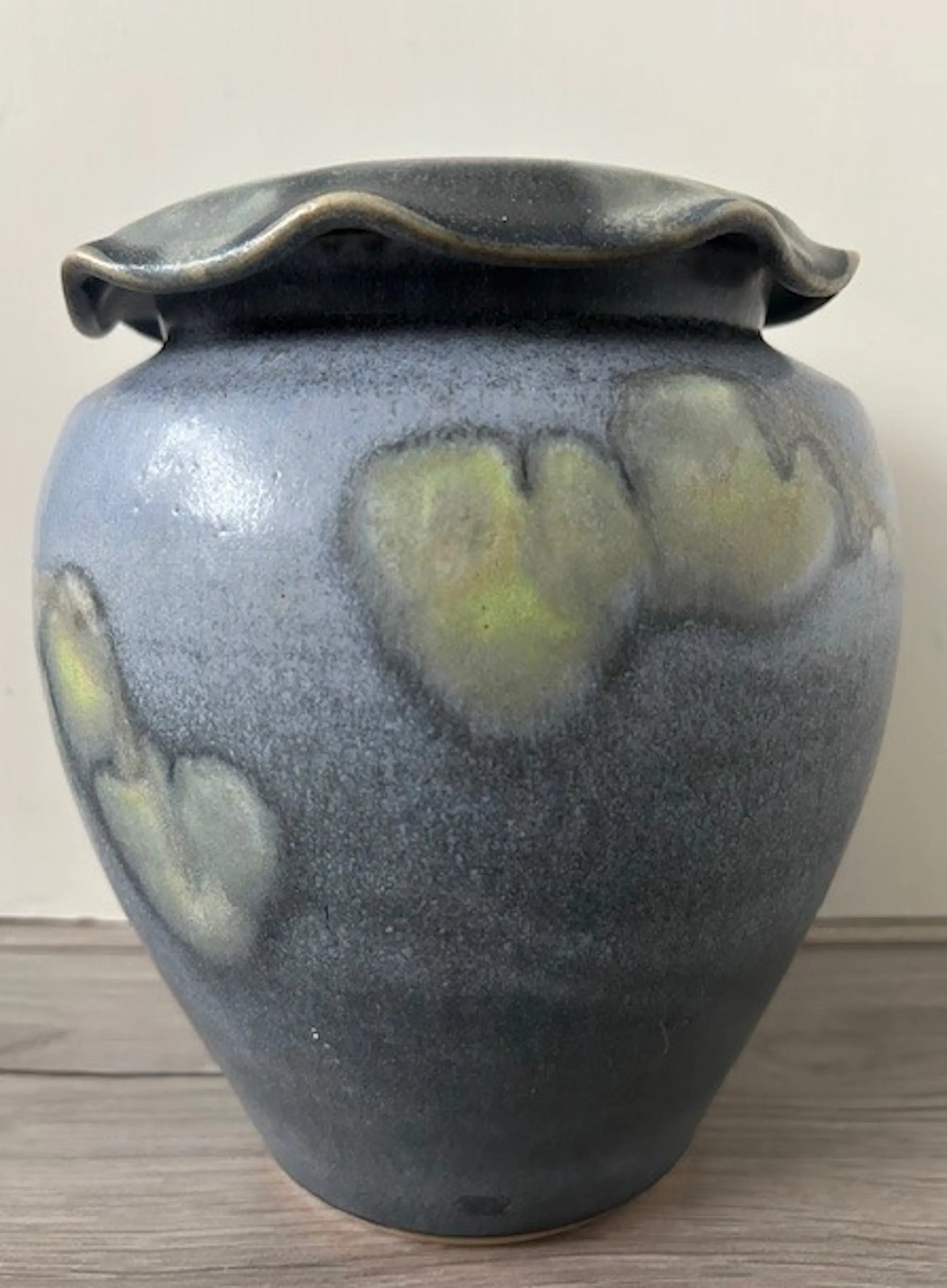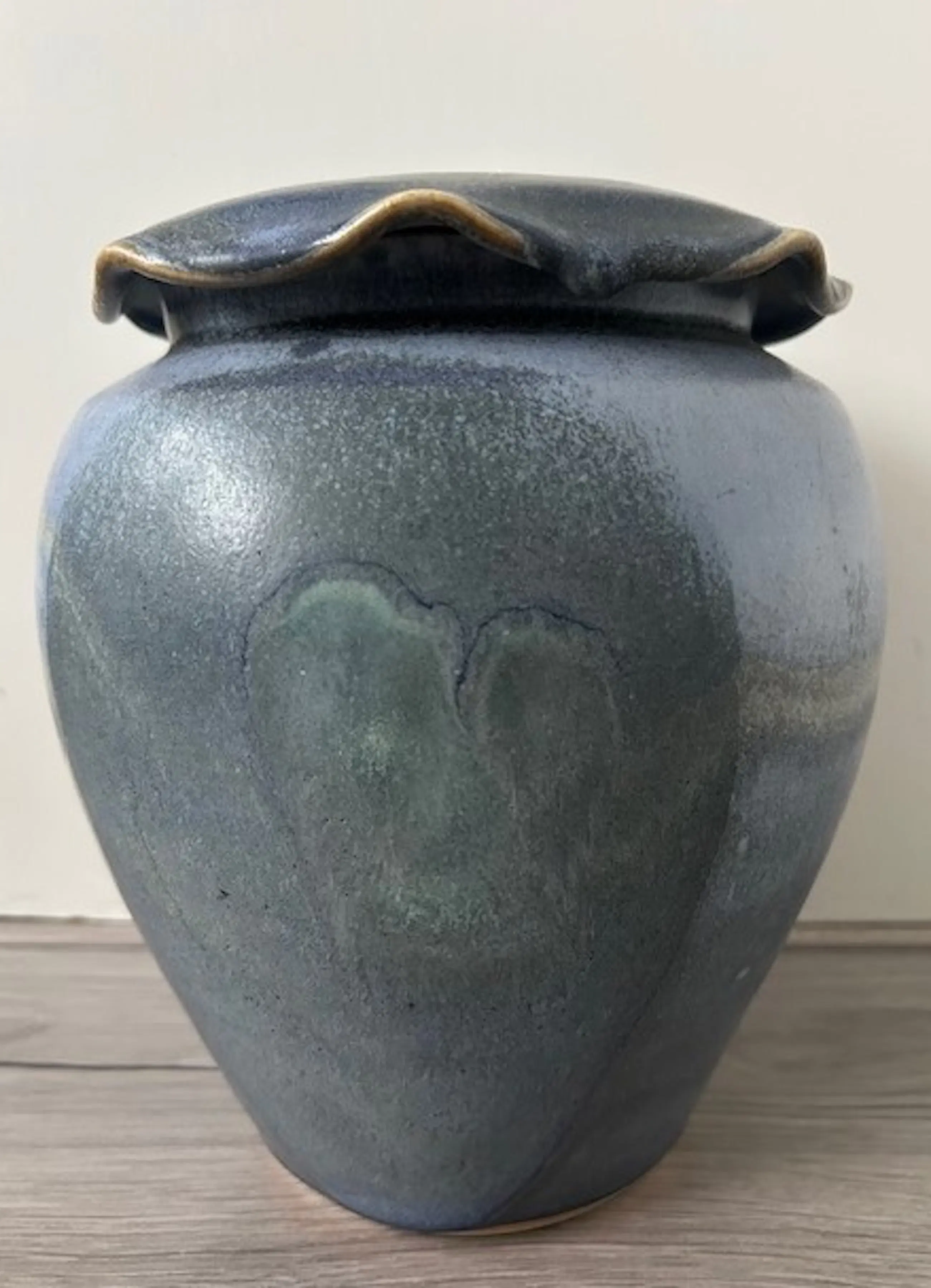 Leo Martens forse handgedraaide dekselpot in lichtblauw, donkerblauw en geel/groen. De pot is uitgevoerd met een sierlijk deksel met gegolfde rand. Vervaardigd bij Rooyart Keramiek 1995. Gesigneerd door de keramist op de onderkant.