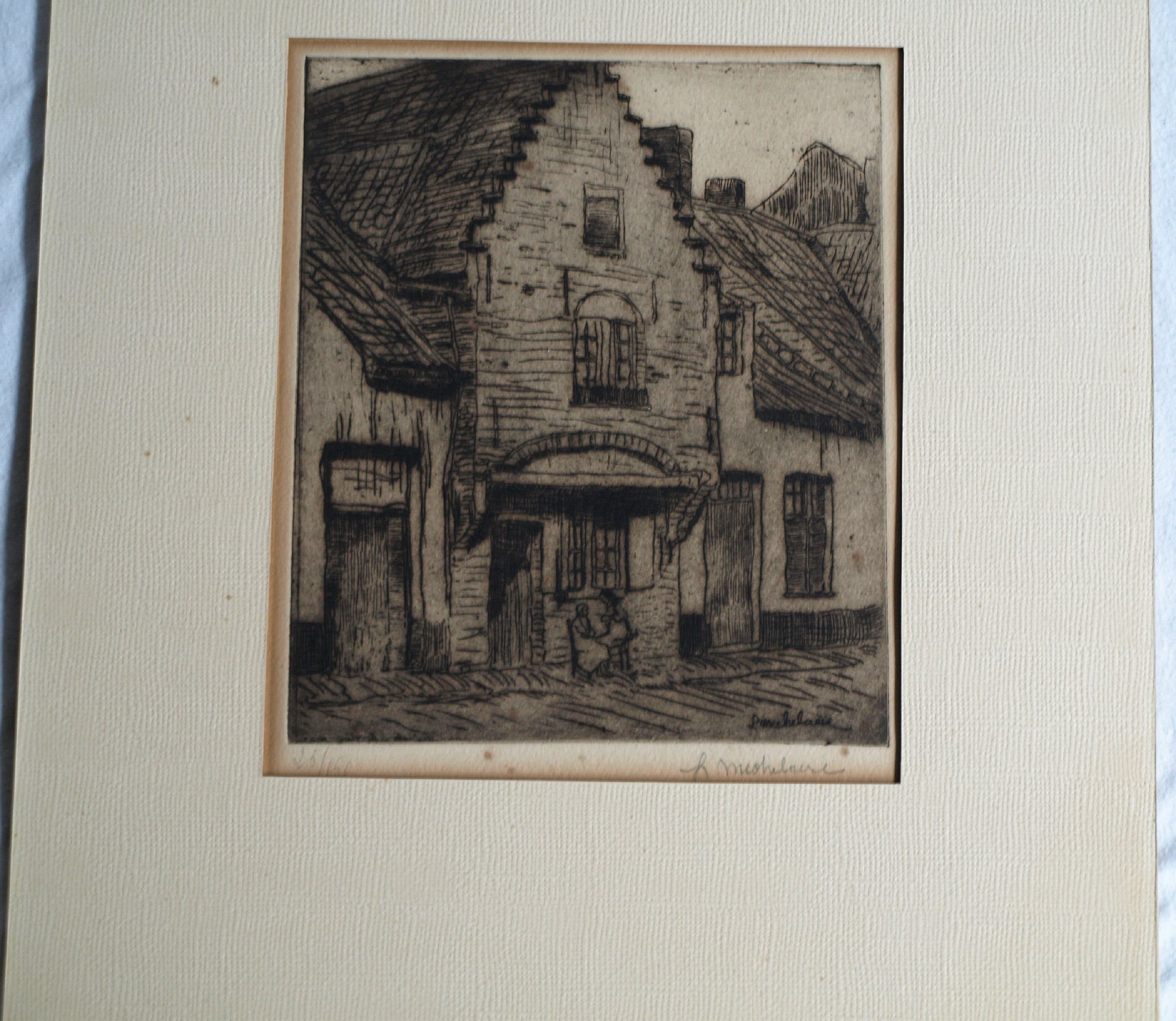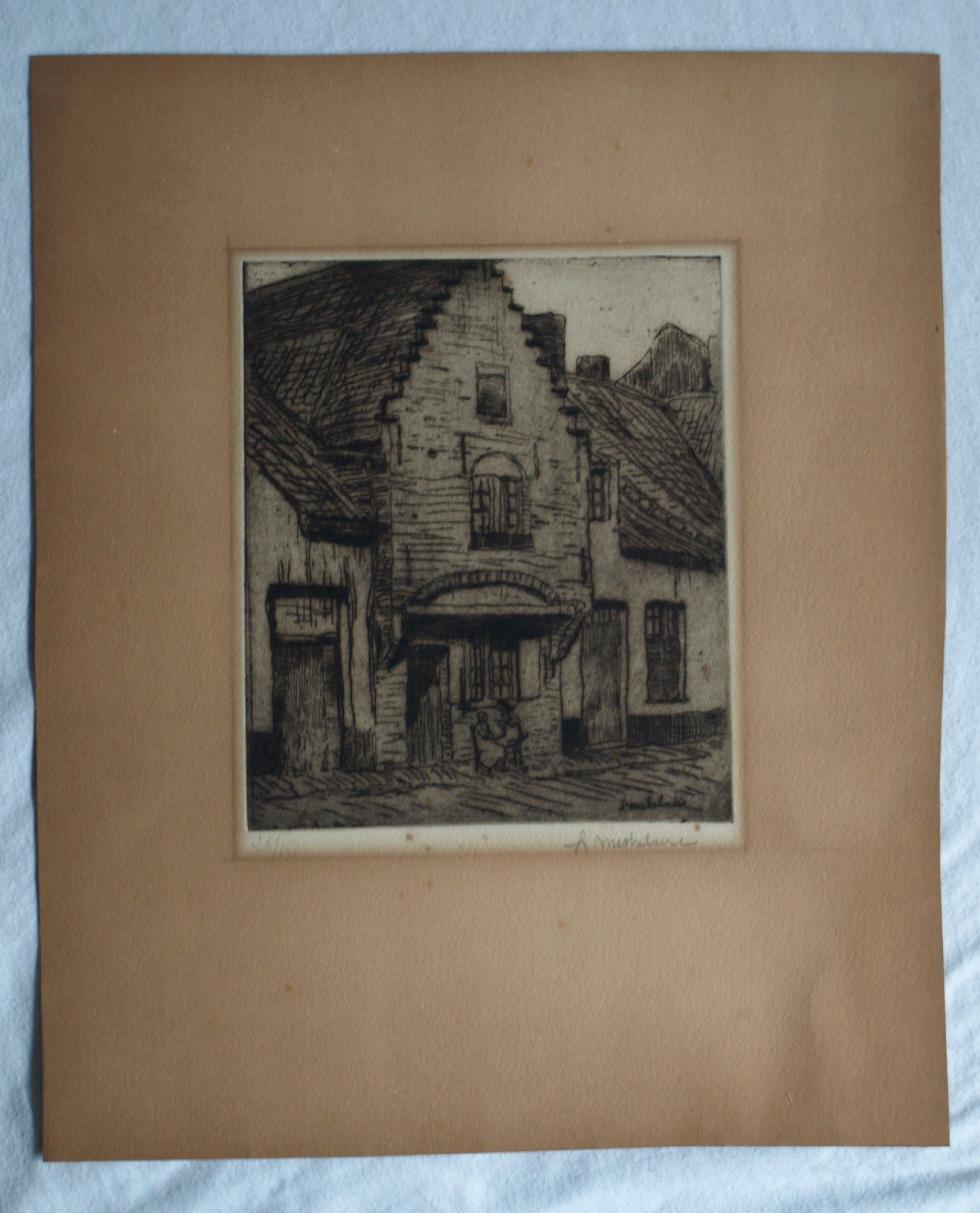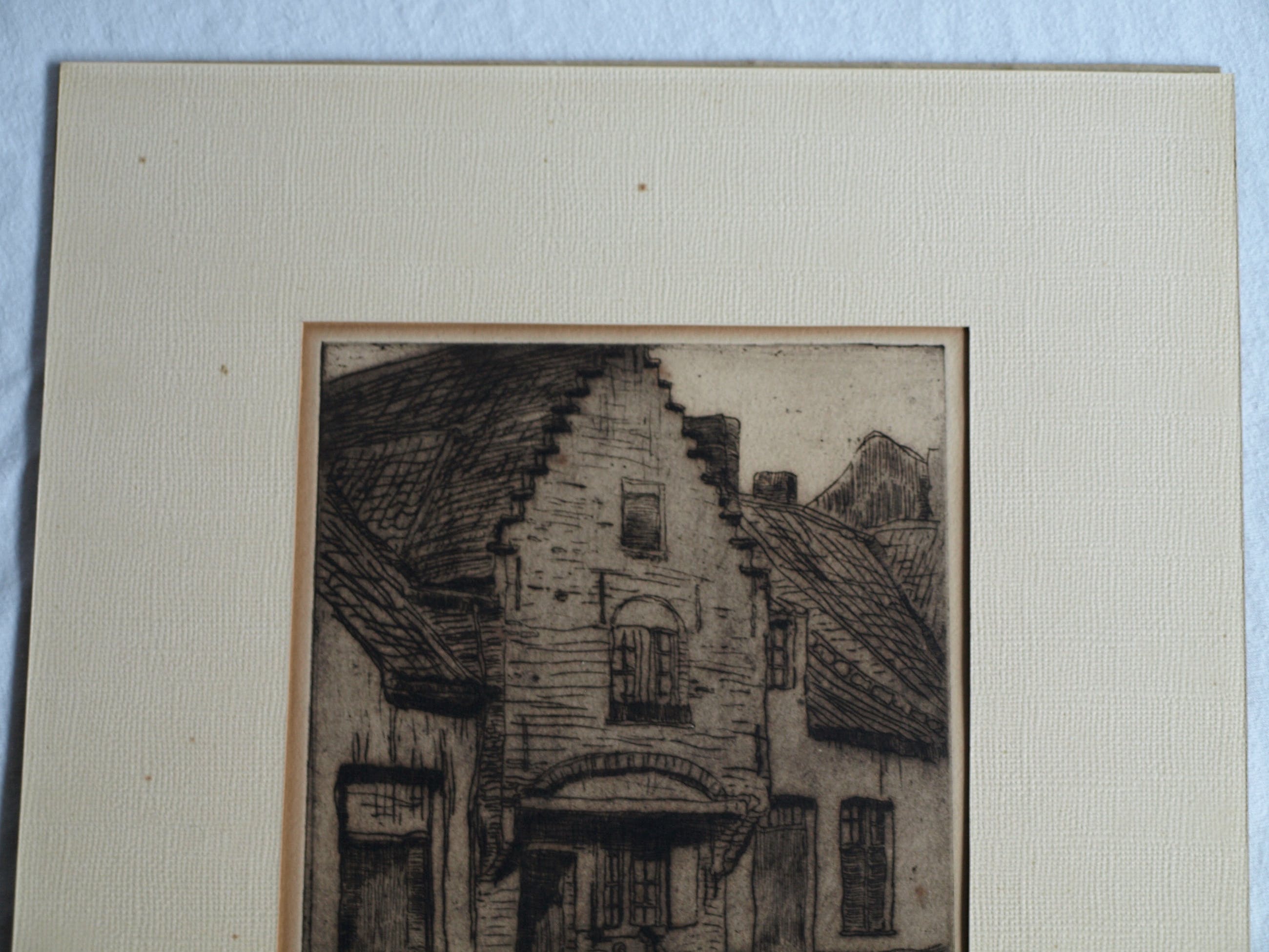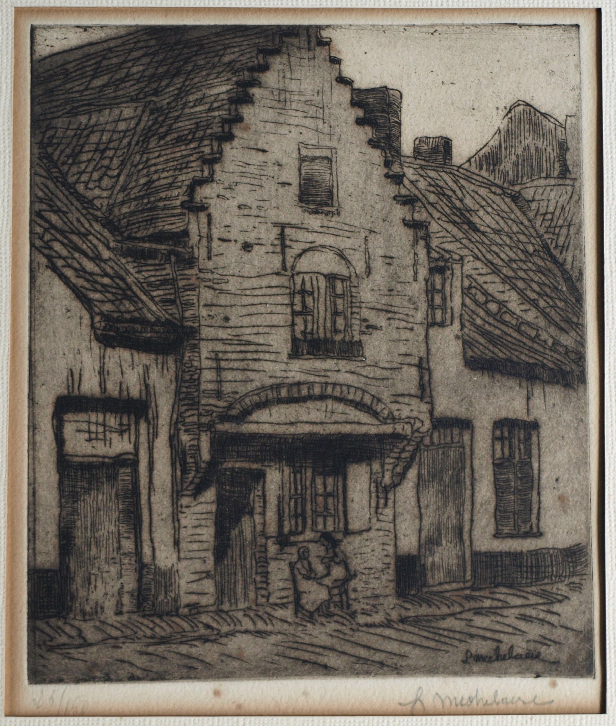 Een ets uit de 1e helft van de 20e eeuw van de Belgische kunstenaar Leo Mechelaere (1880–1964), met een voorstelling van een huis in, waarschijnlijk, Brugge.