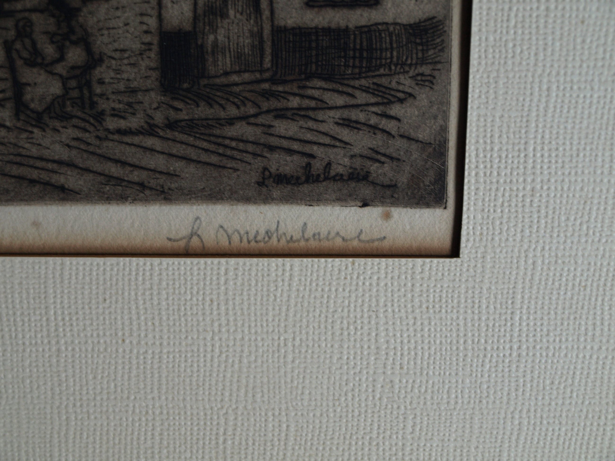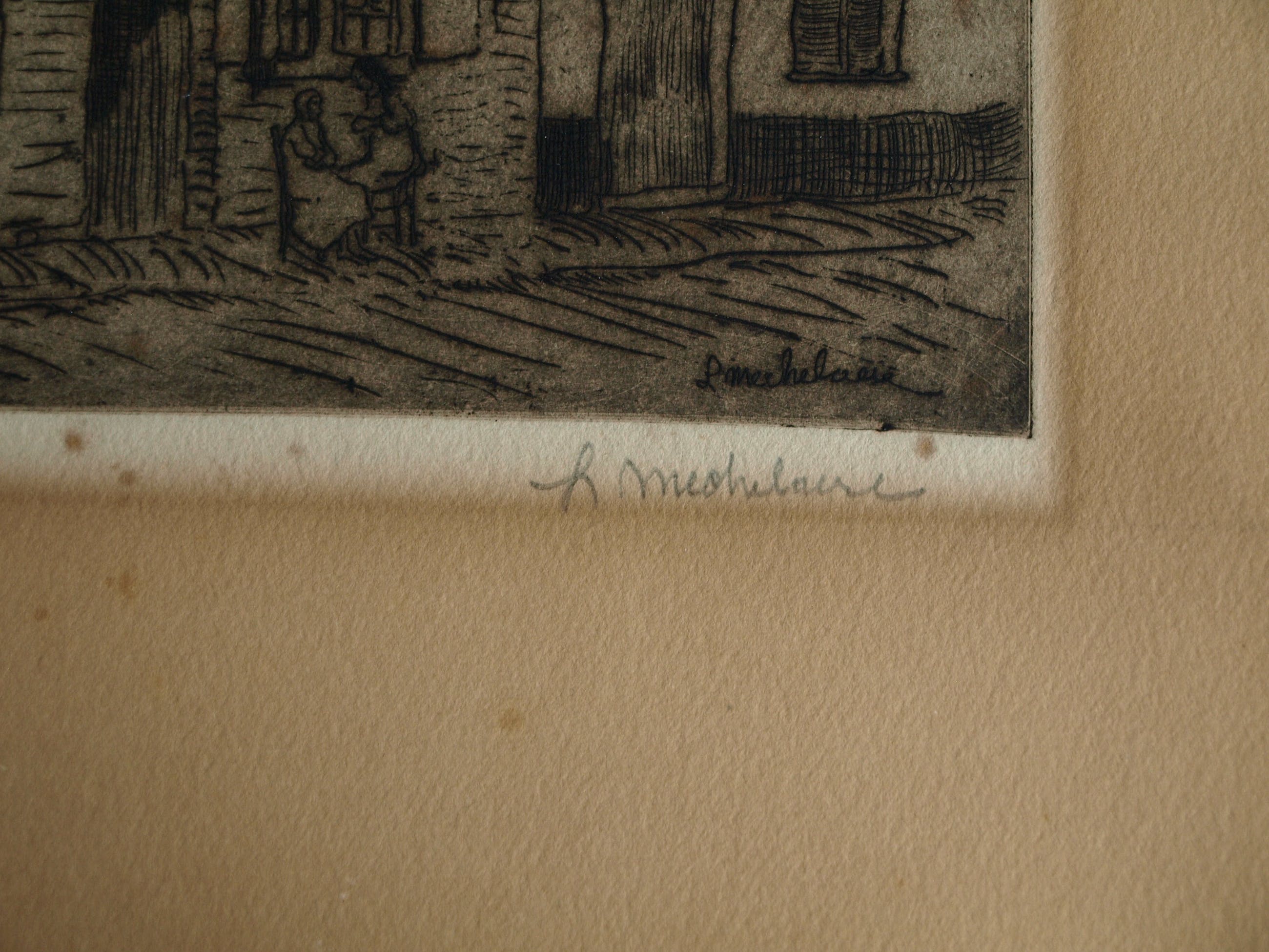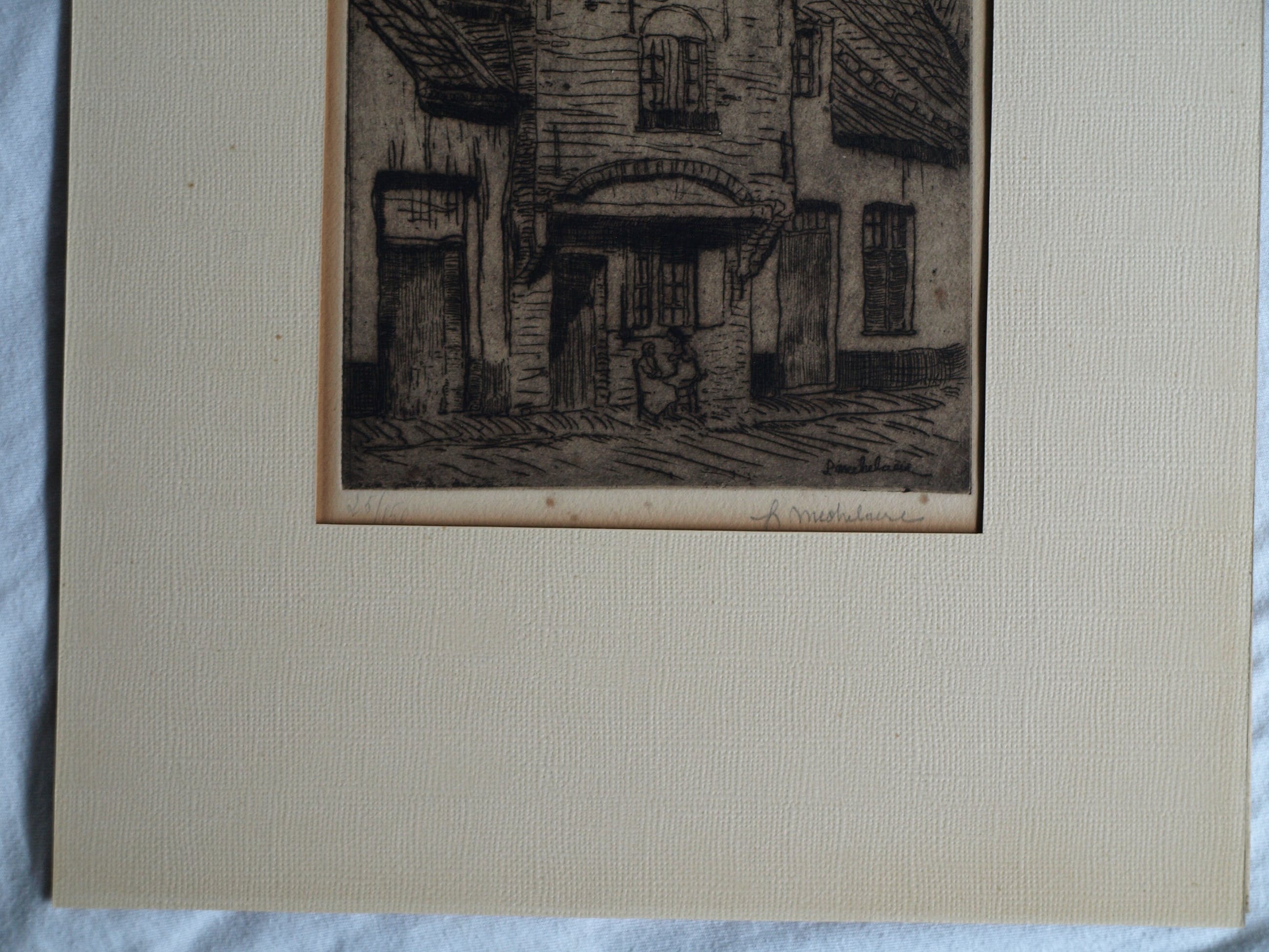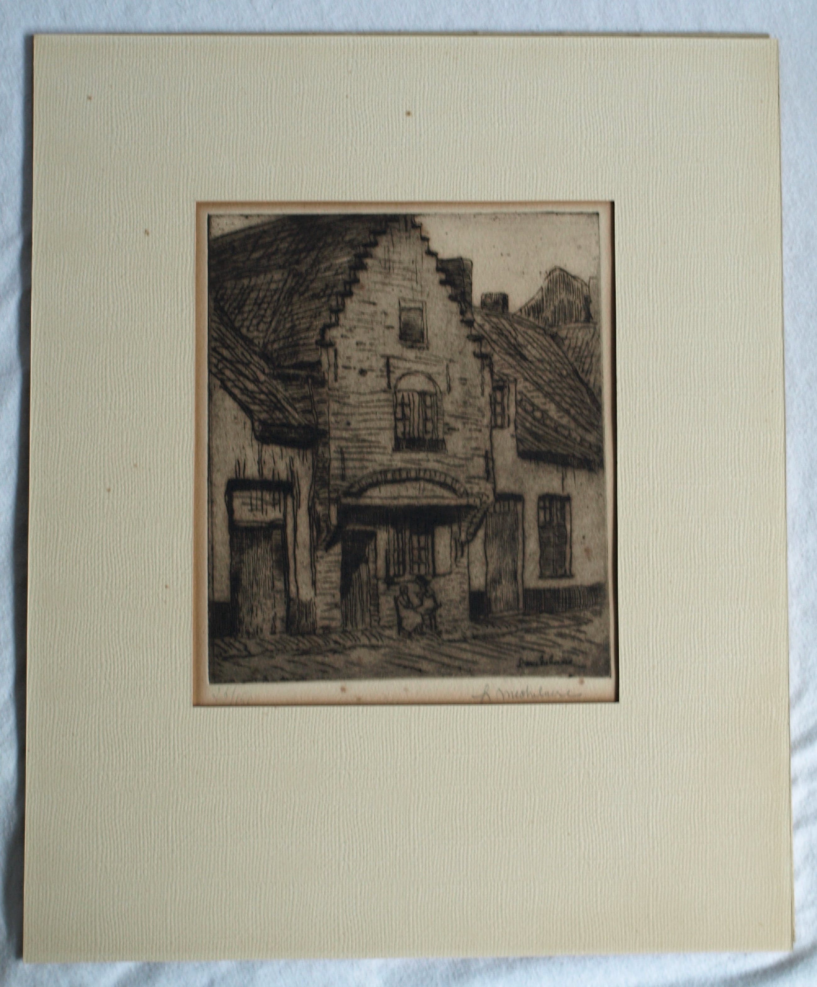 Een ets uit de 1e helft van de 20e eeuw van de Belgische kunstenaar Leo Mechelaere (1880–1964), met een voorstelling van een huis in, waarschijnlijk, Brugge.