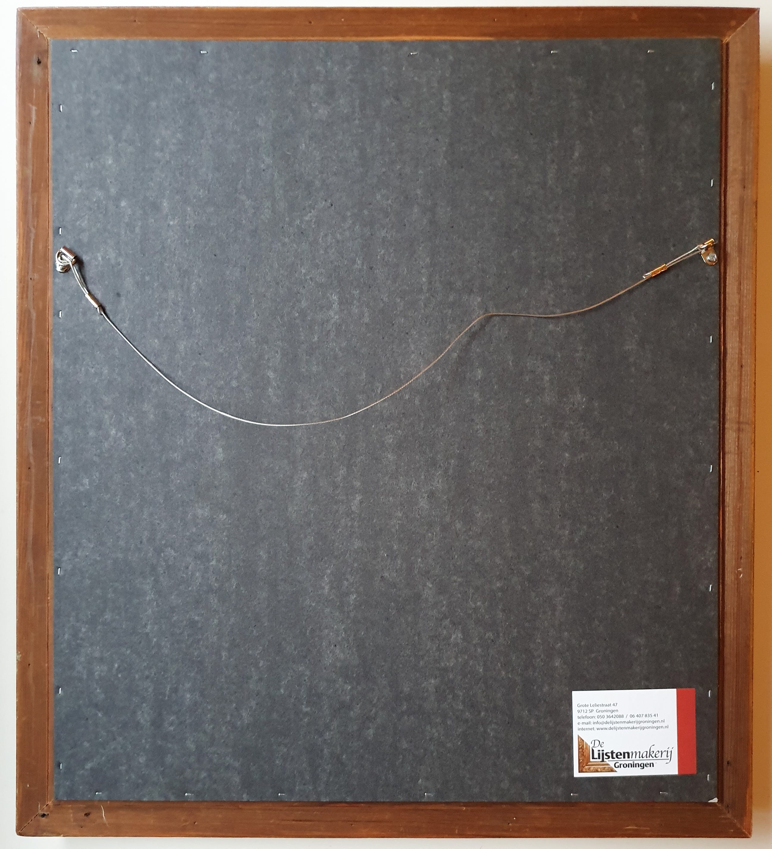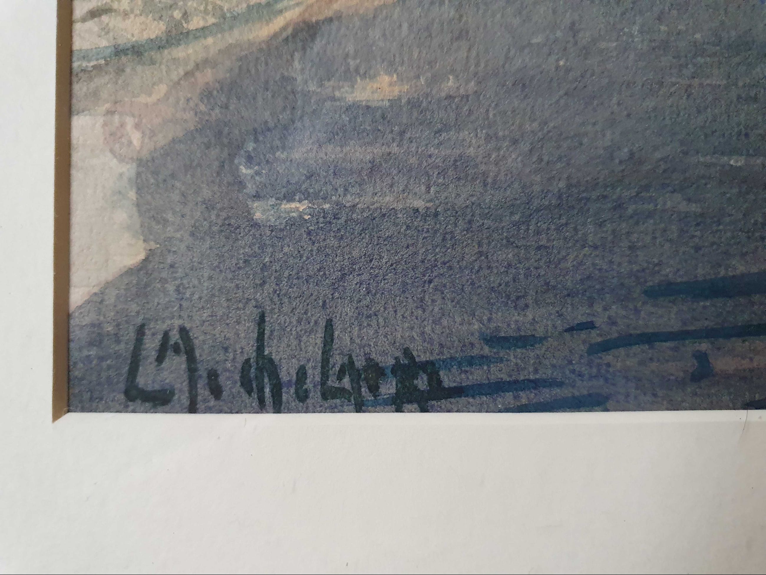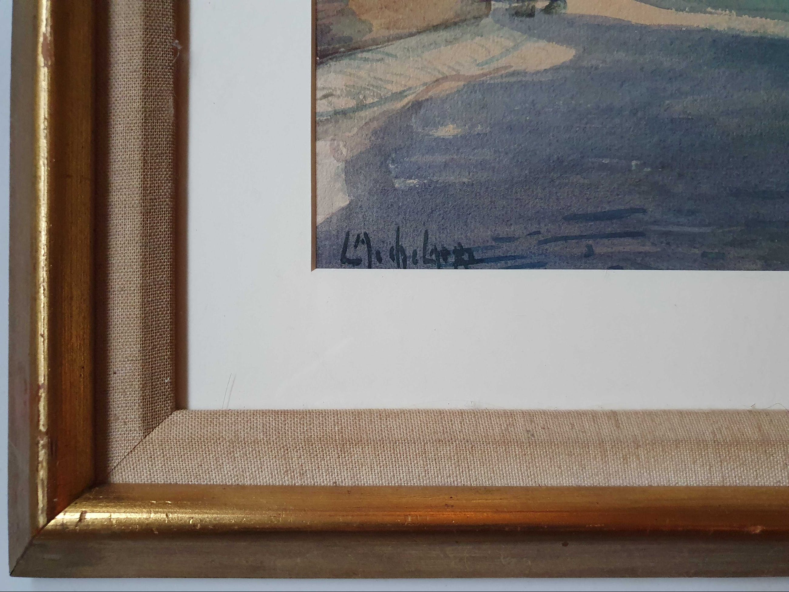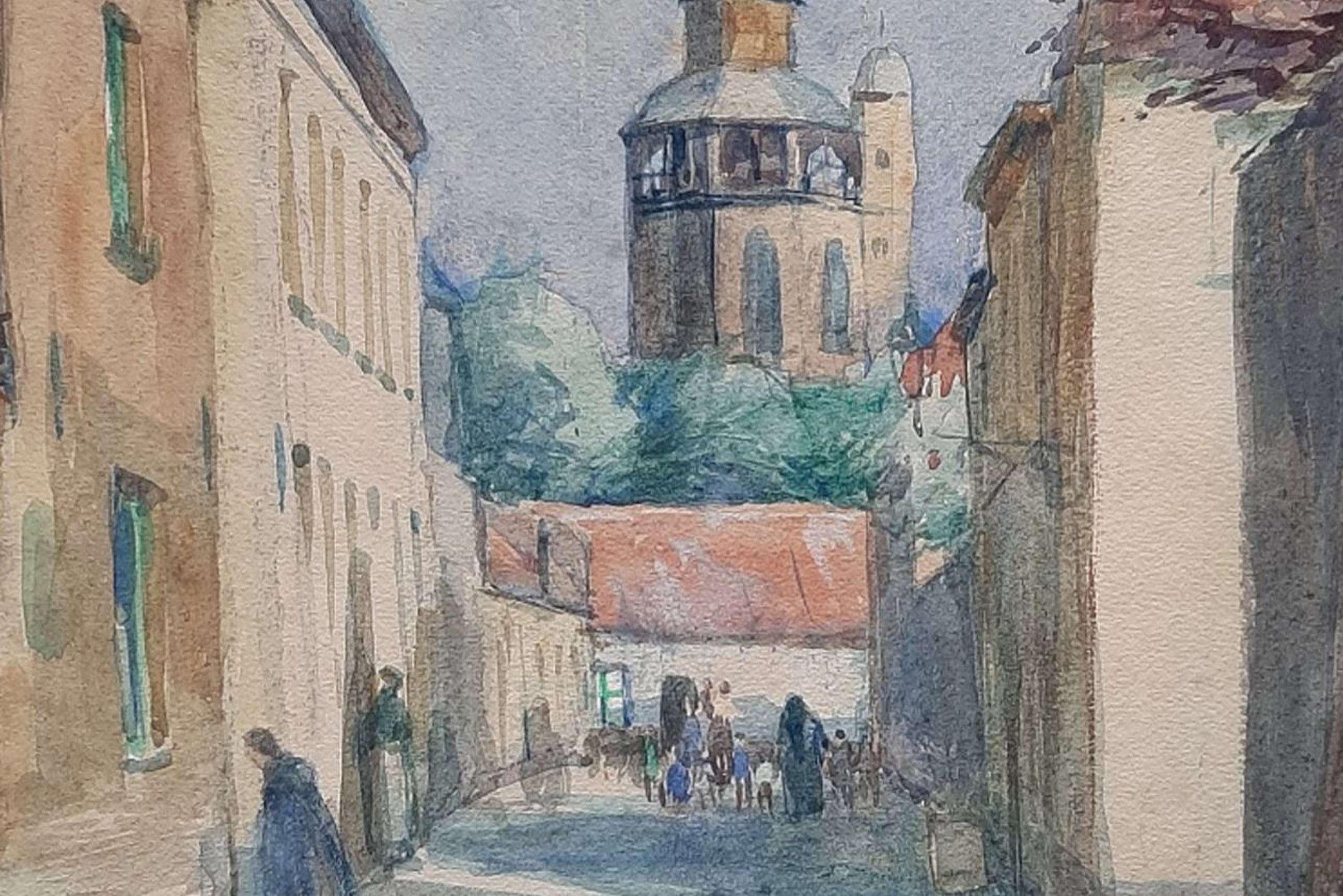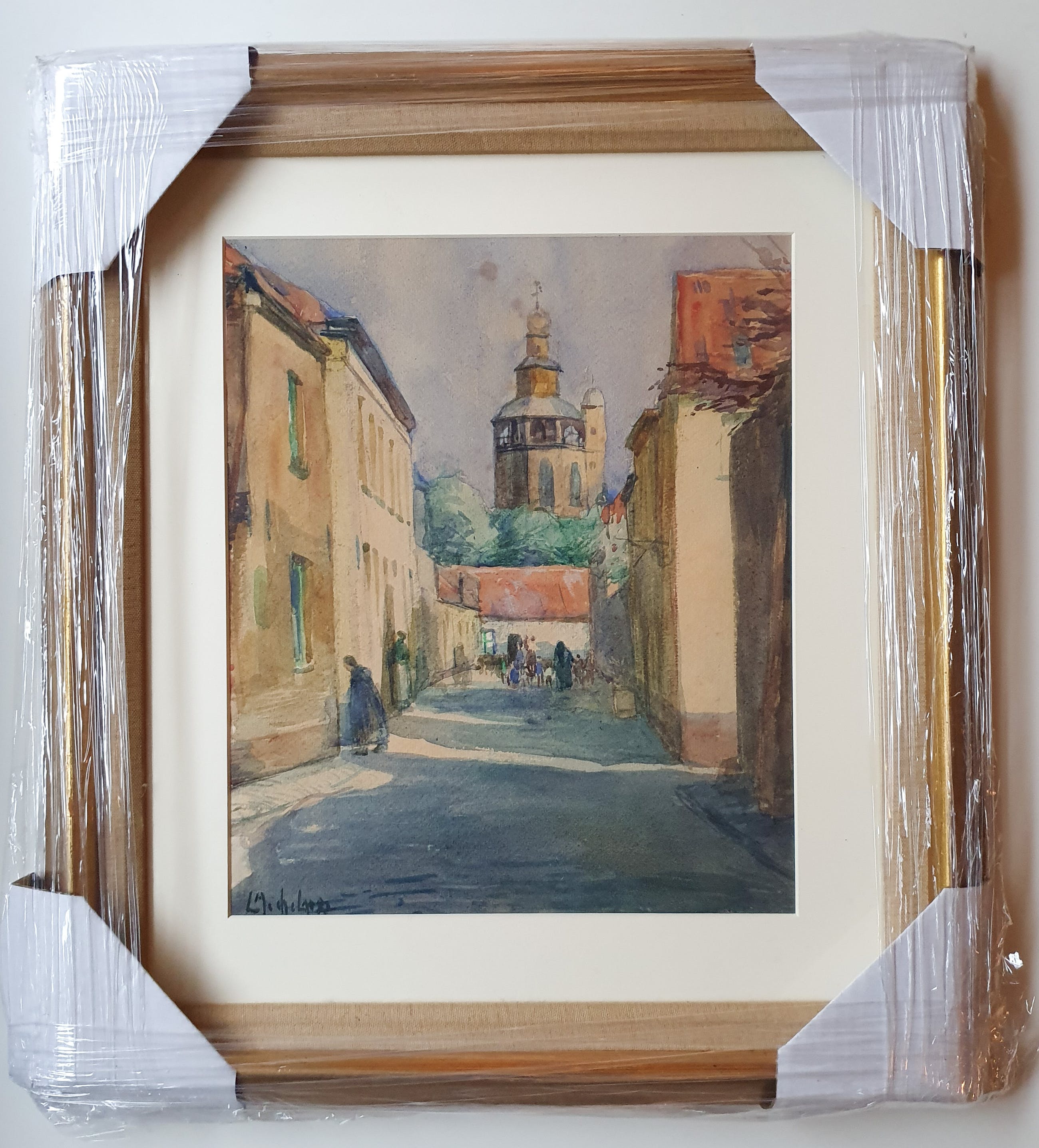 Een schitterende aquarel op handgeschept papier van de hand van Leo Mechelaere met een stadsgezicht van Brugge. De voorstelling is van mensen in de straat met tegen de achtergrond een kerktoren. Opnieuw gelijst achter museumglas in een vergulde contemporaine lijst met binnenrand en passe-partout. De lijst kent lichte sporen van gebruik, het geheel verkeert verder in uitstekende staat. Zie foto's.