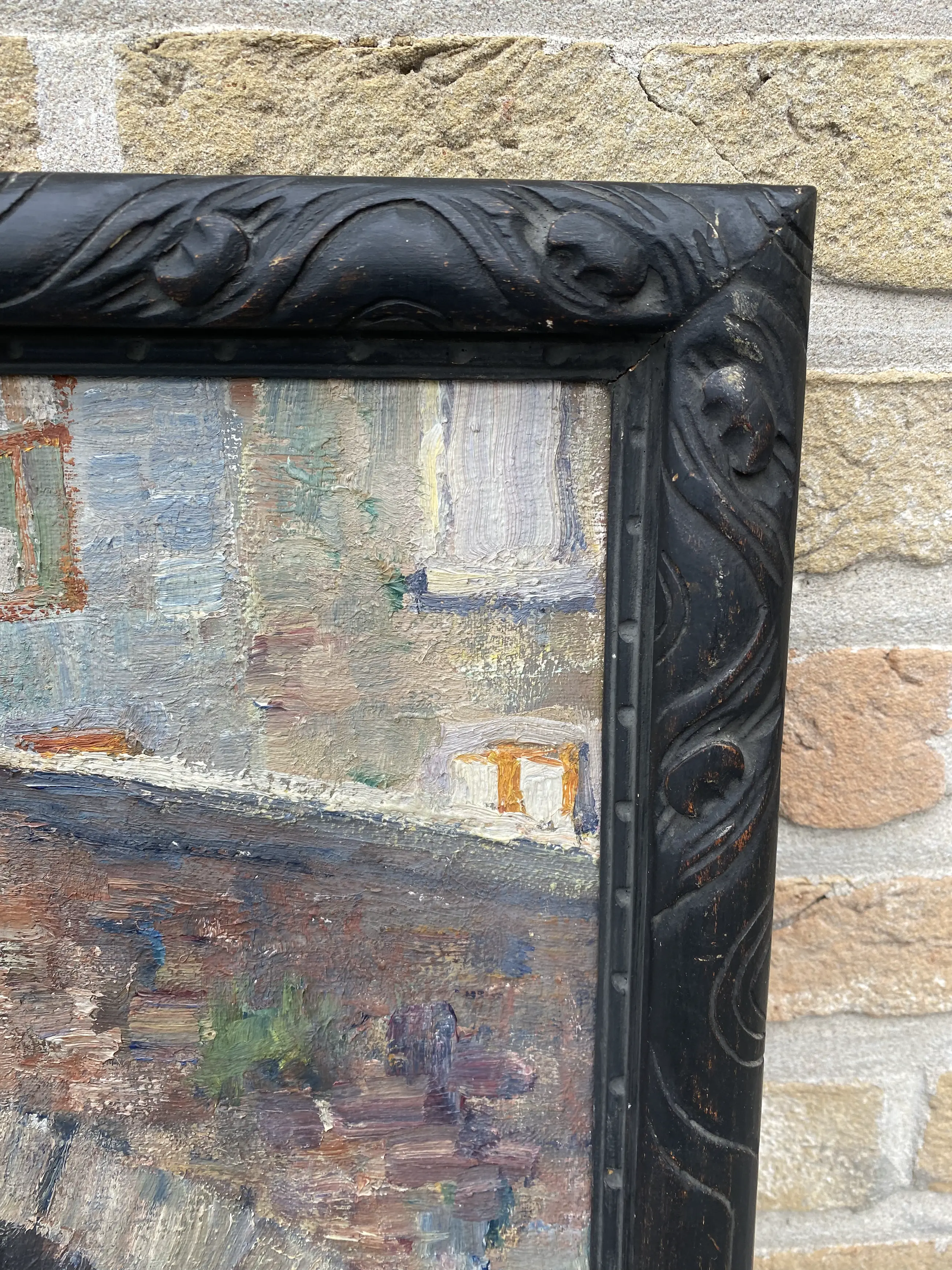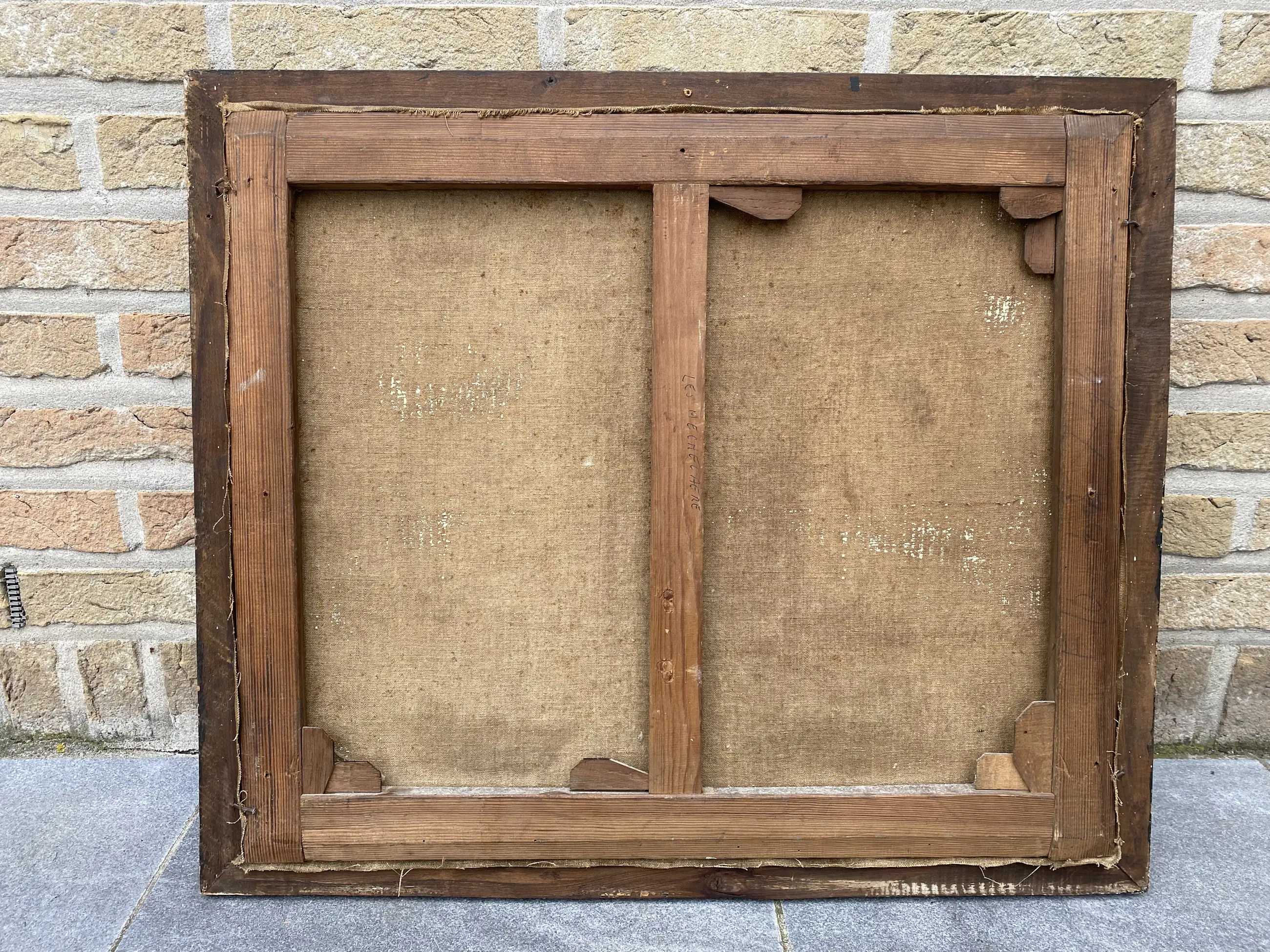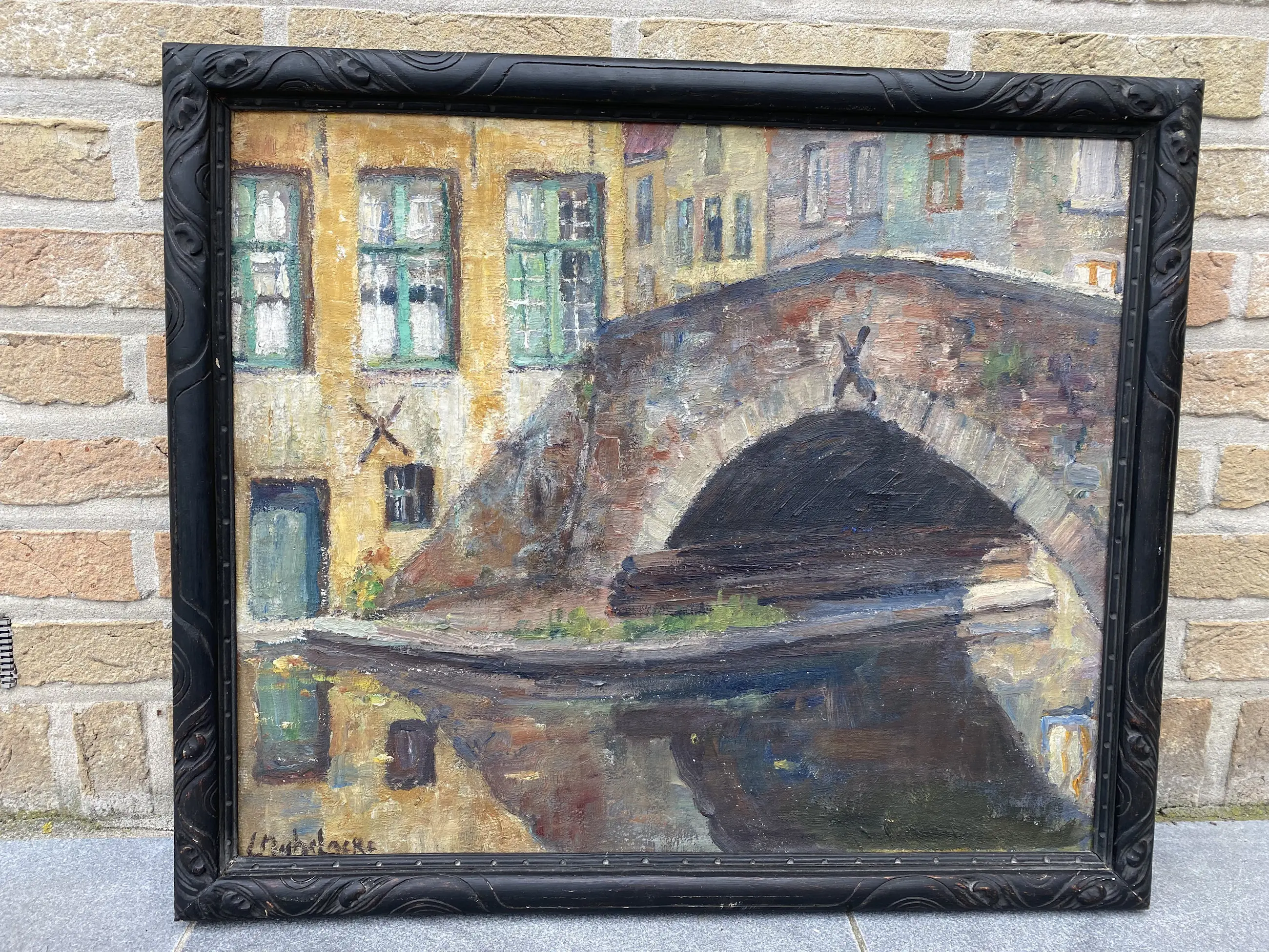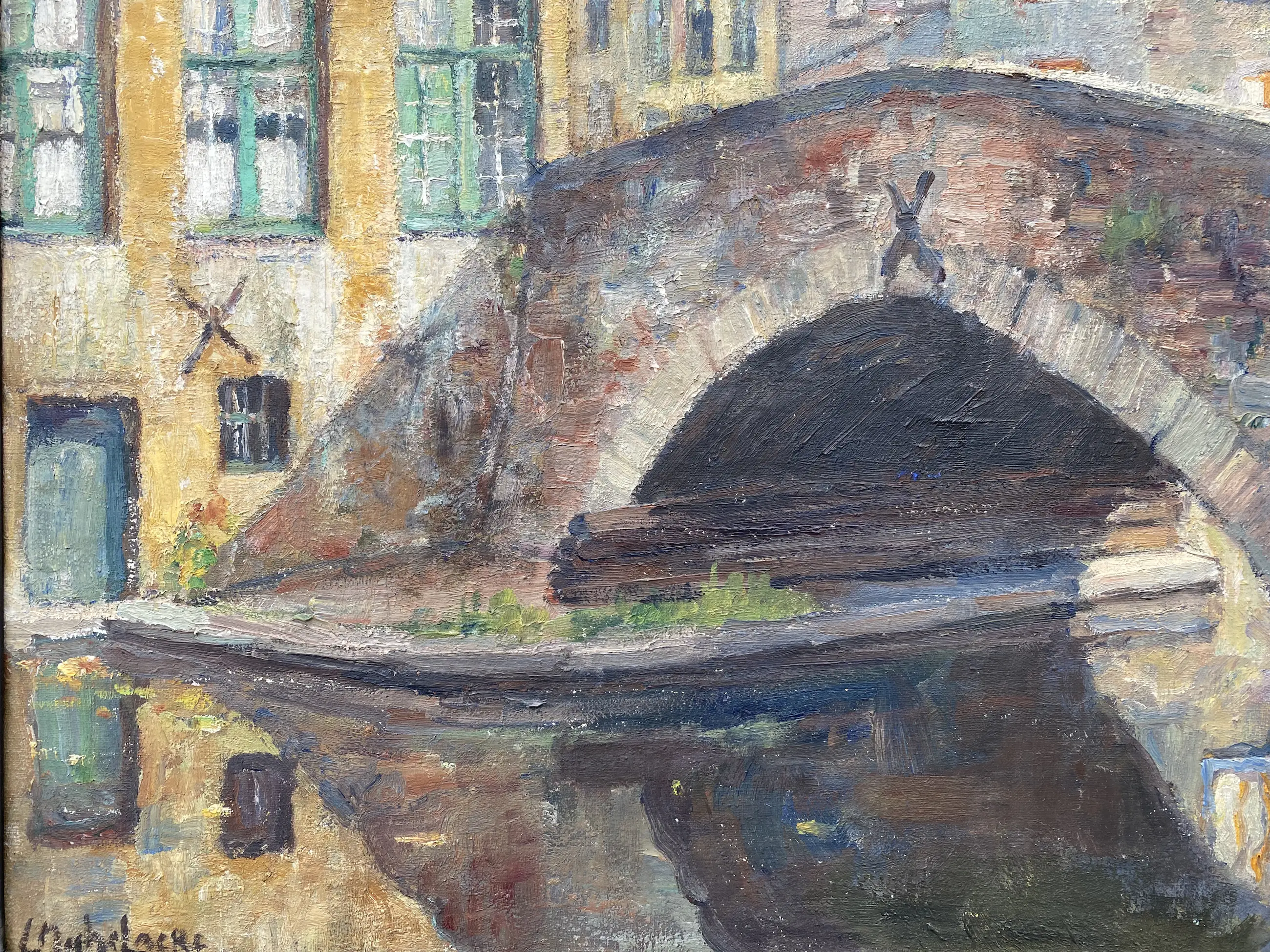 Olieverf op doek uit de Belgische School van de Belgische kunstschilder Leo Mechelaere (1880-1964). Gesigneerd linksonder. Het schilderij stelt een hoekje voor aan de Meebrug te Brugge. Goede staat. Eenvoudig ingekaderd in kader uit die tijd. Afmetingen met kader 60 x 51 cm zonder kader 54 x 46 cm