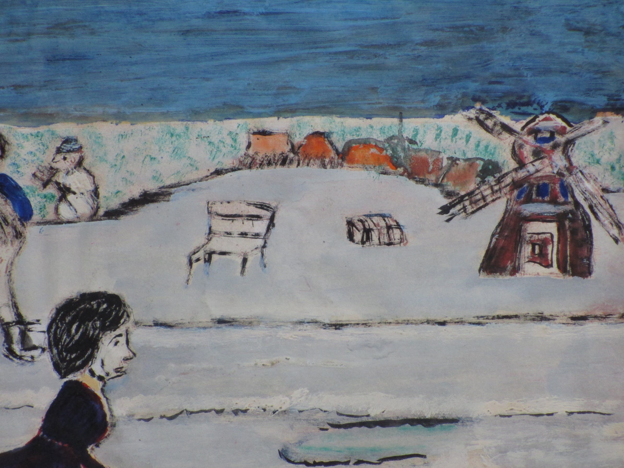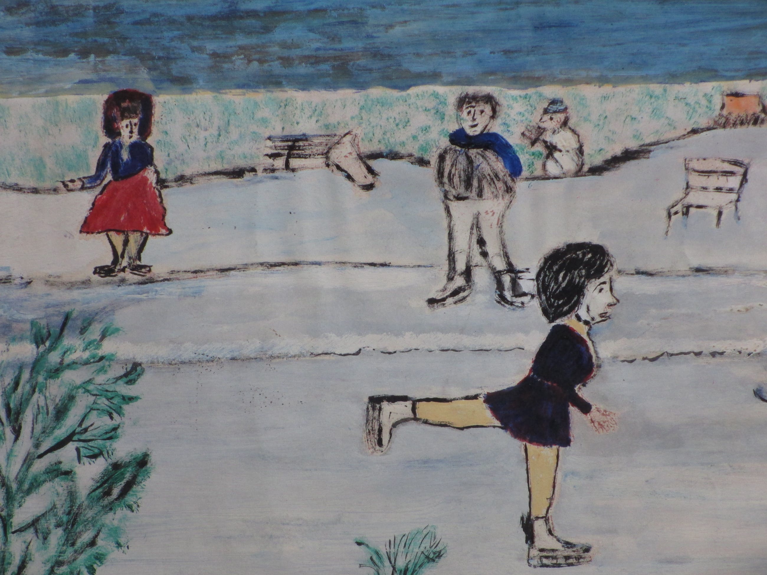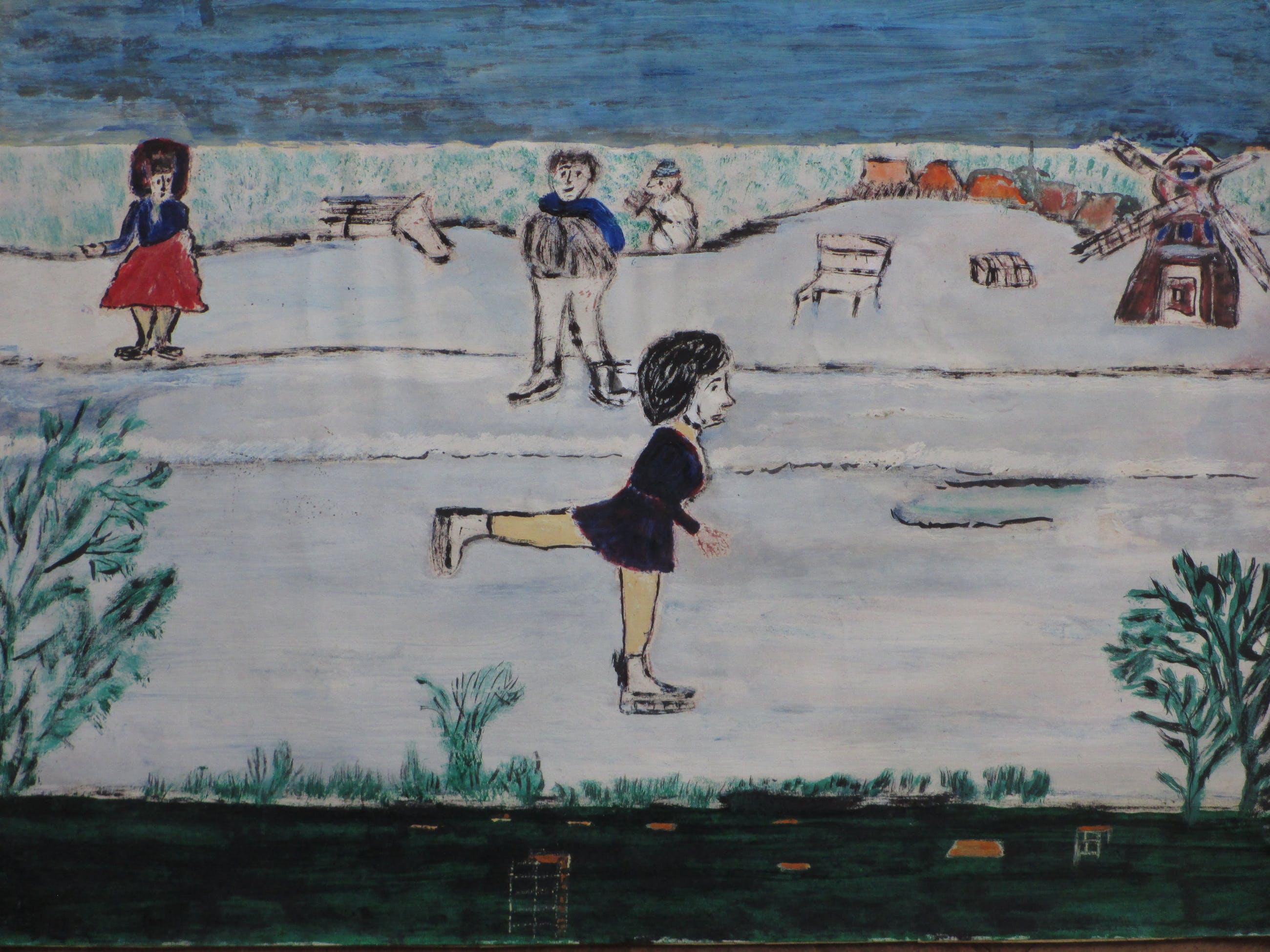 Gemengde techniek door Leo NeervoortEén van de bekendste Nederlandse Naïeve SchildersVoorstelling van een schaatsster in een Hollands WinterlandschapVoorstelling op papier op karton, beeldmaat 29x39Niet gesigneerdAuthenticiteit volledig gegarandeerd