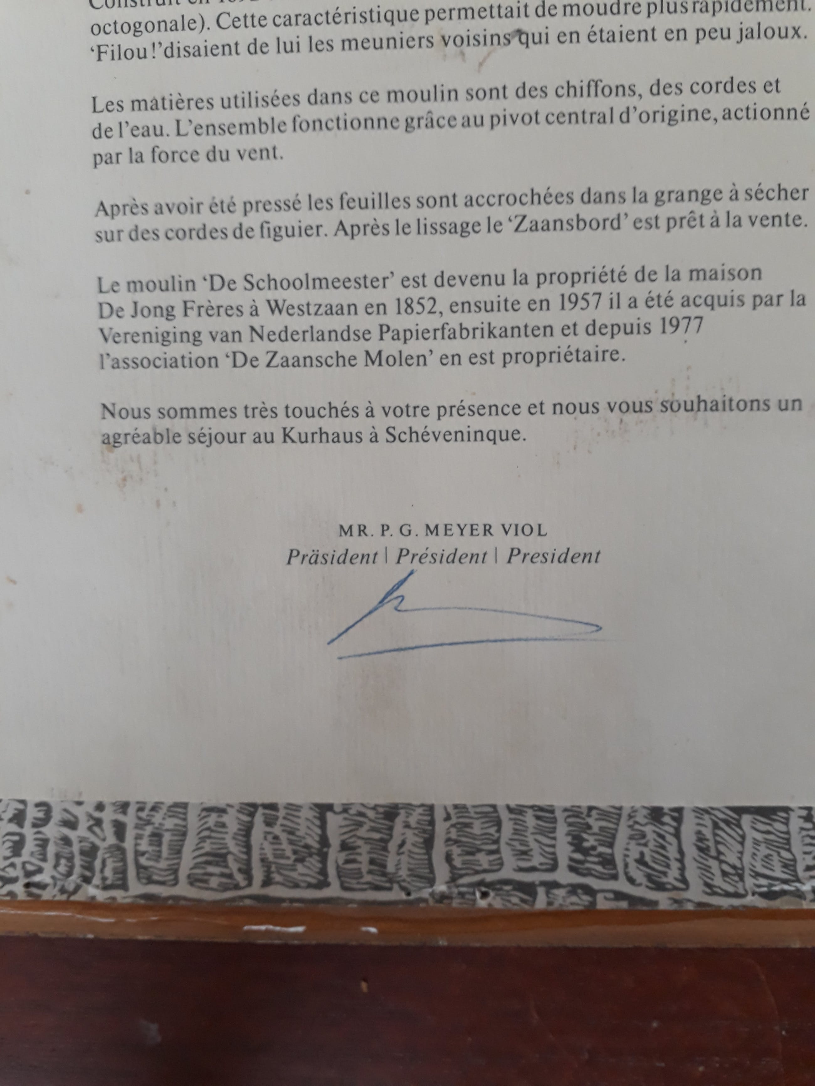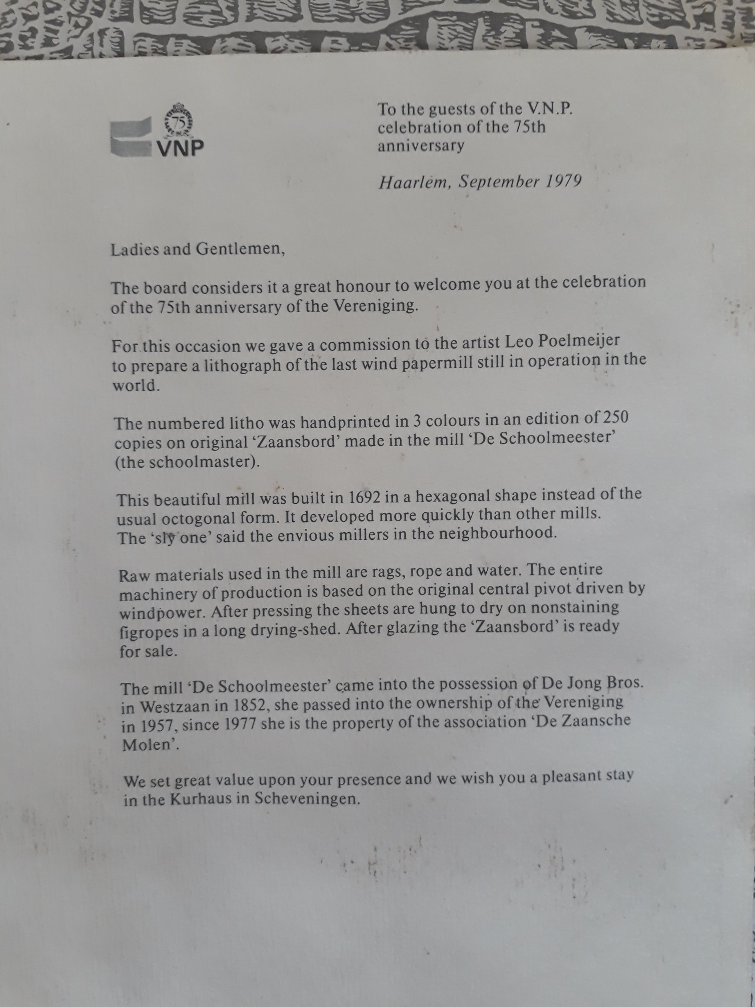 fraaie zeefdruk op geschept papier [zaans bord] uitgegeven tav 75 jarig bestaan van VPN achterop ondertekend door Mr. Meyer Viol president