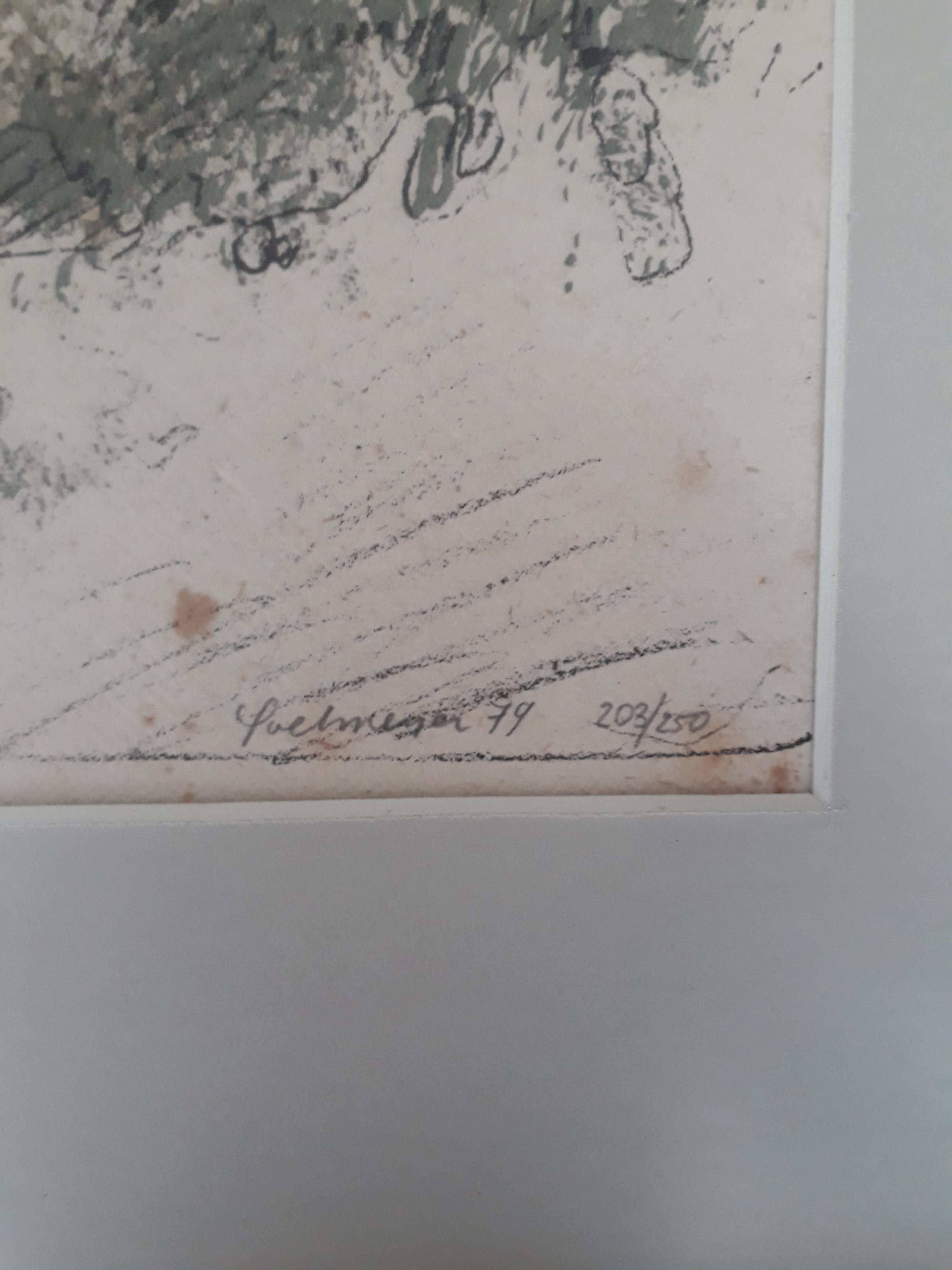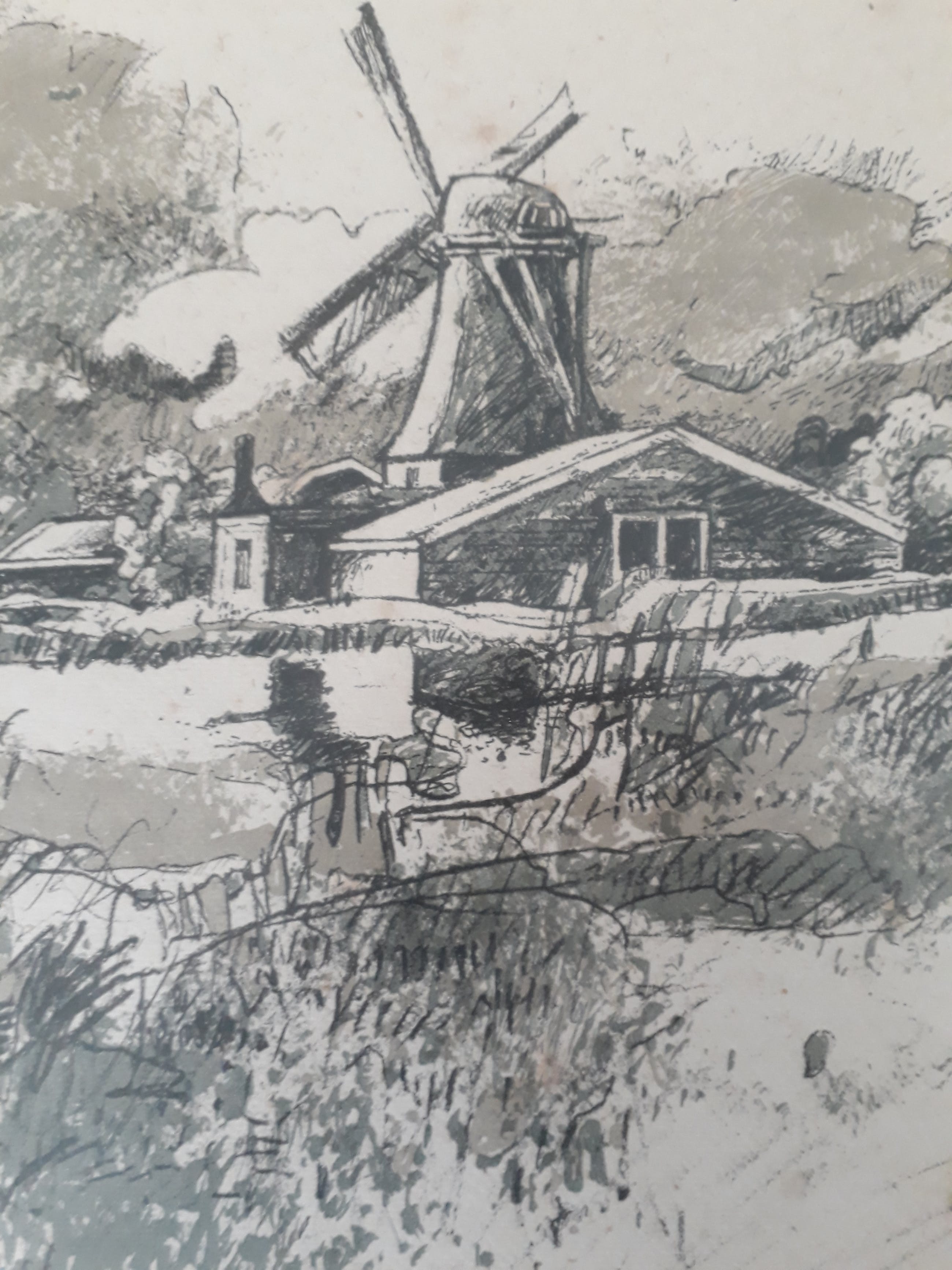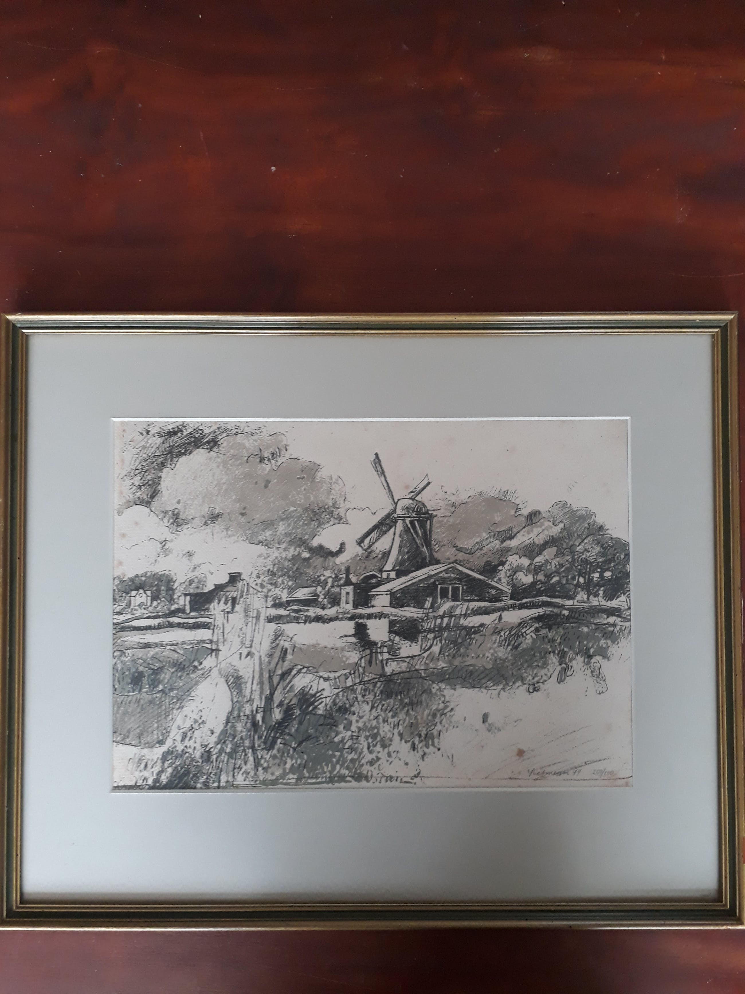 de afbeelding betreffende de "schoolmeester" de laatste operationele wind papiermolen ter wereld. rechtsonder paar kleine bruine vlekjes potlood gesigneerd