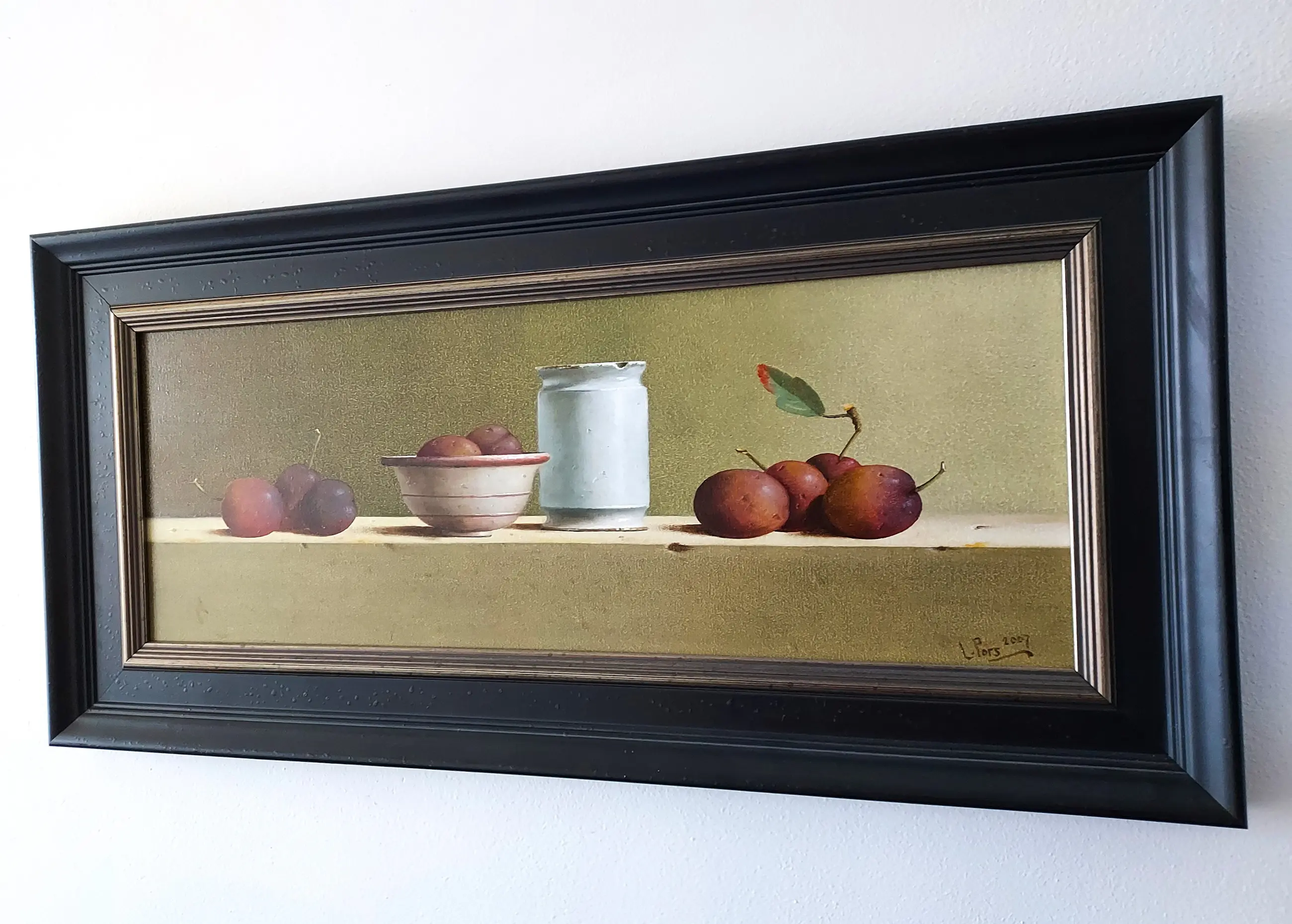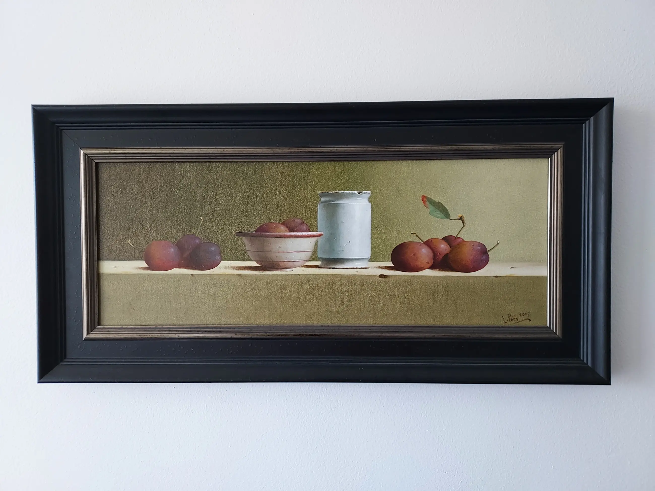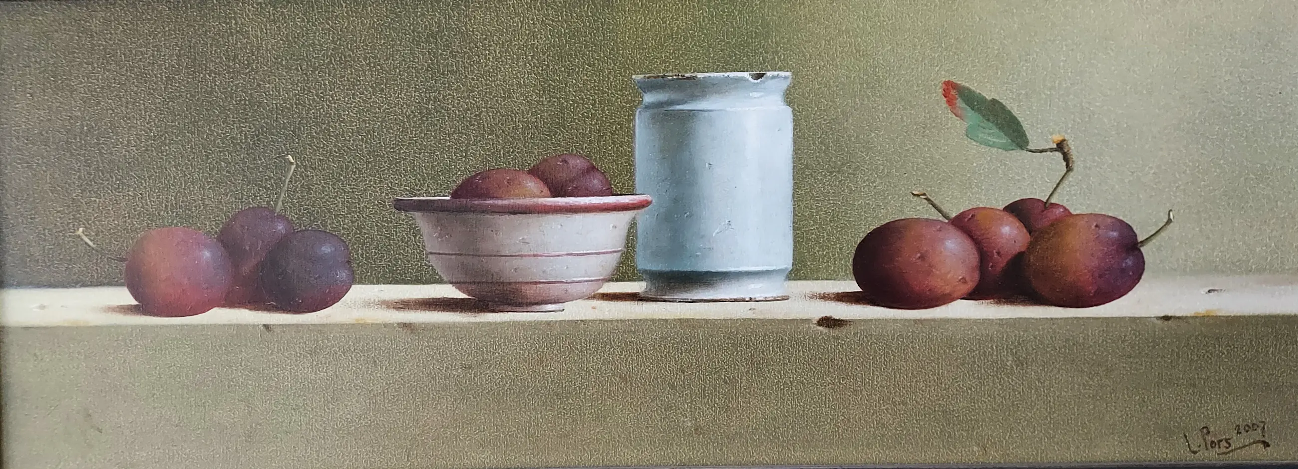 Dit stilleven is van 2007 en heeft een paneelmaat van 20 x 53 cm. Op een tafel staan diverse objecten zorgvuldig gerangschikt. De gebruikte kleuren zijn in een perfecte harmonie gekozen en ook de compositie is geheel in evenwicht. Er gaat van het schilderij een grote rust uit, hetgeen van een stilleven ook verwacht mag worden. Een prachtig werk dat een mooie plaats verdient.