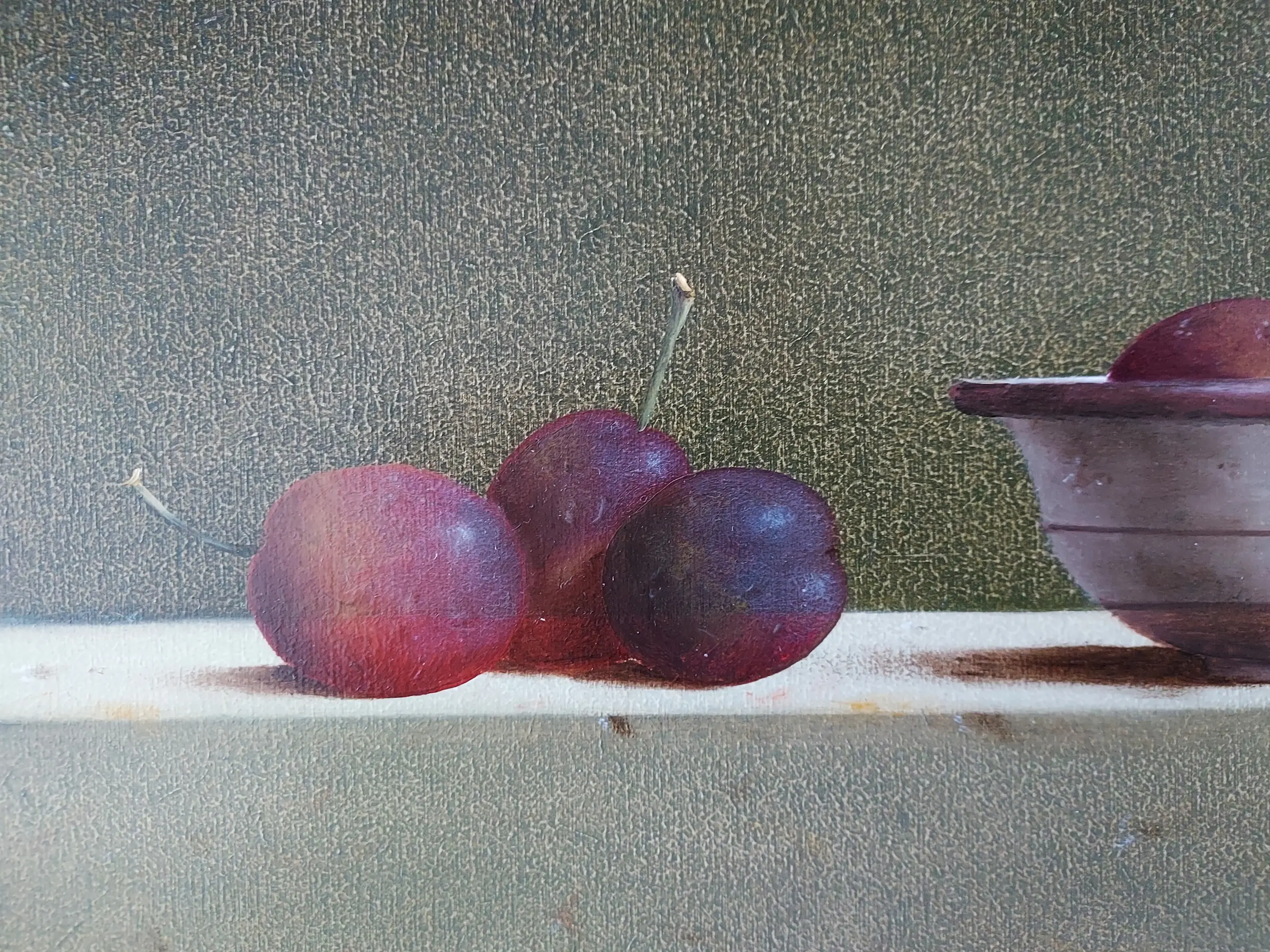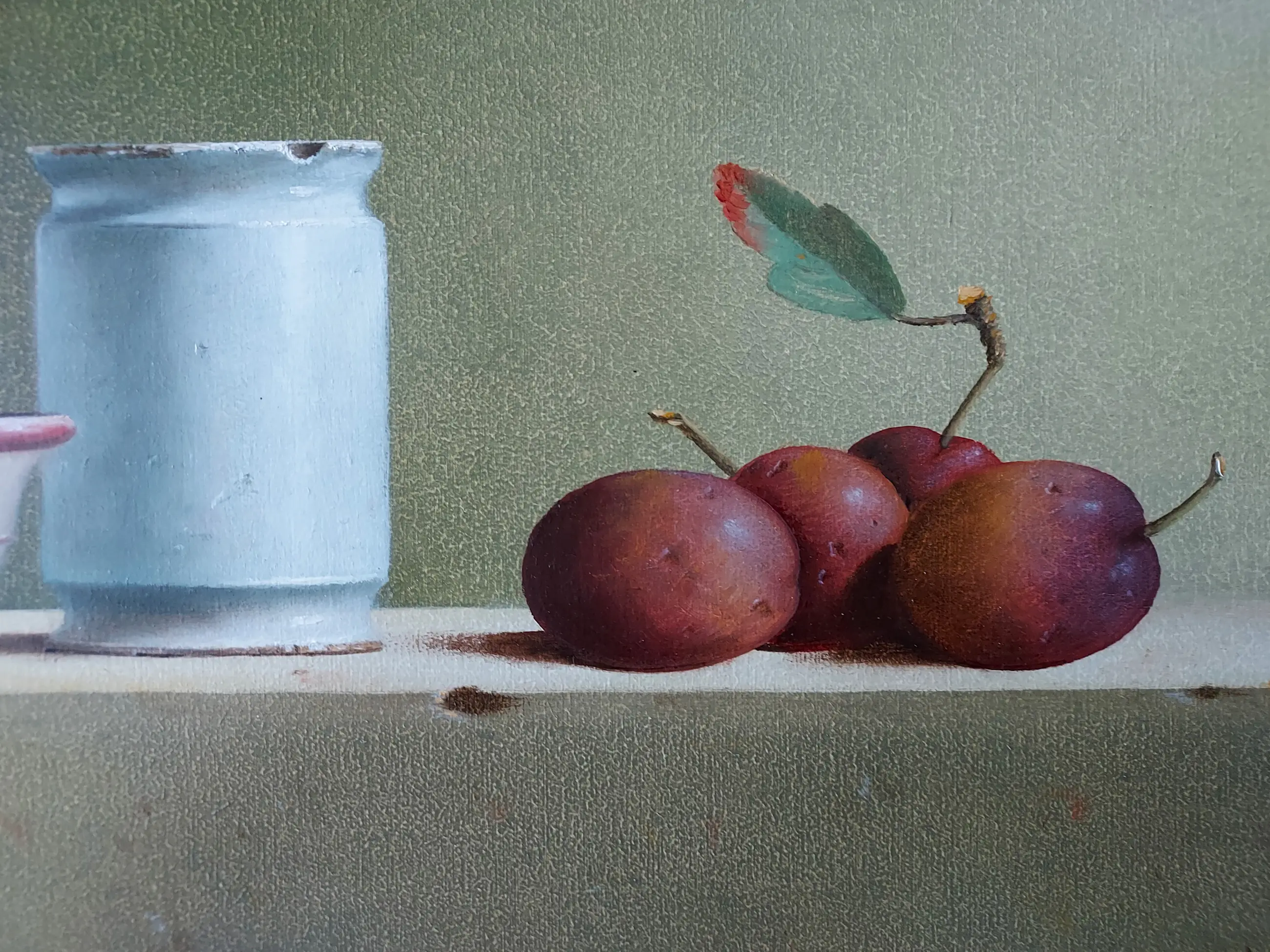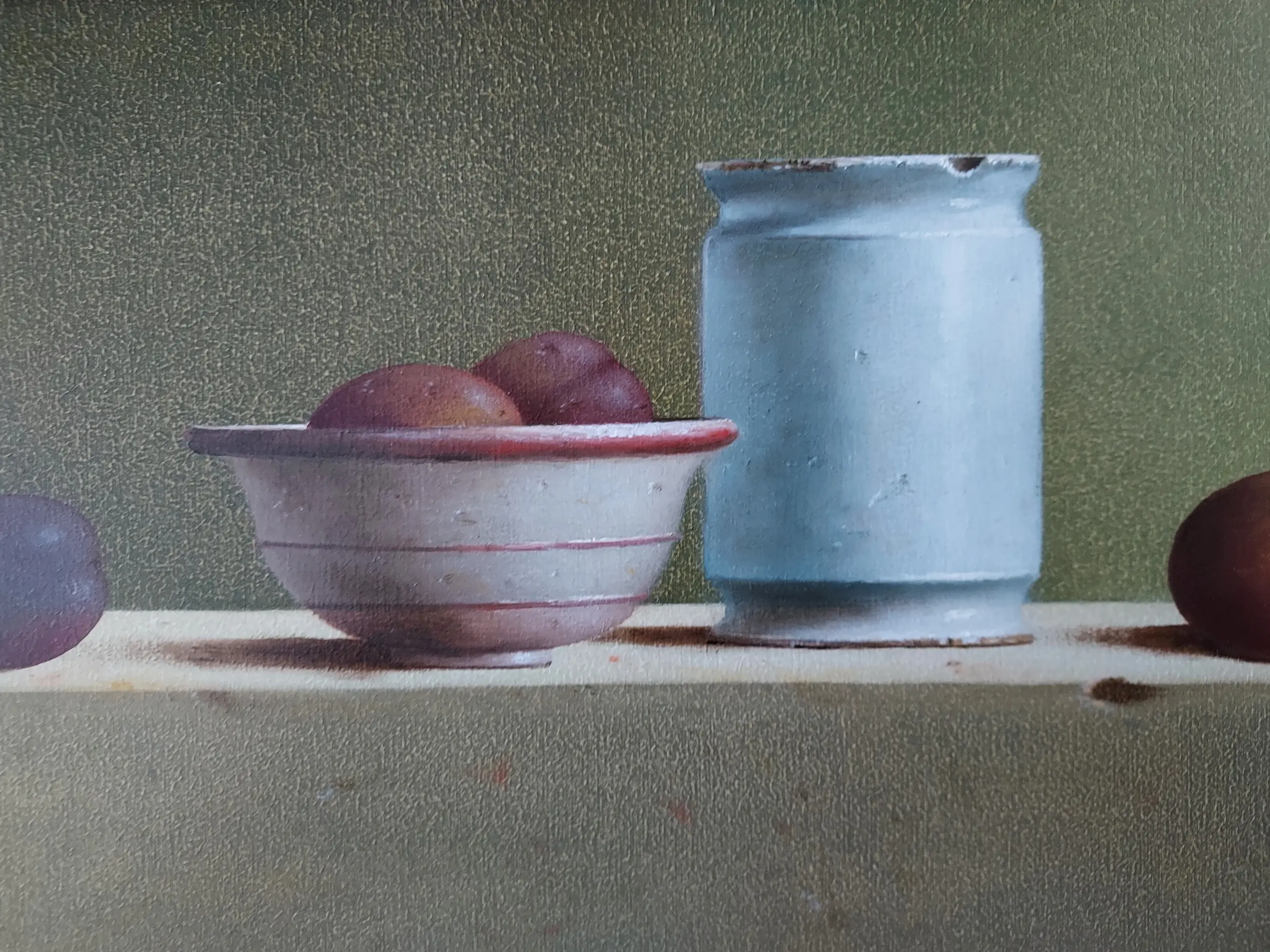 Dit stilleven is van 2007 en heeft een paneelmaat van 20 x 53 cm. Op een tafel staan diverse objecten zorgvuldig gerangschikt. De gebruikte kleuren zijn in een perfecte harmonie gekozen en ook de compositie is geheel in evenwicht. Er gaat van het schilderij een grote rust uit, hetgeen van een stilleven ook verwacht mag worden. Een prachtig werk dat een mooie plaats verdient.