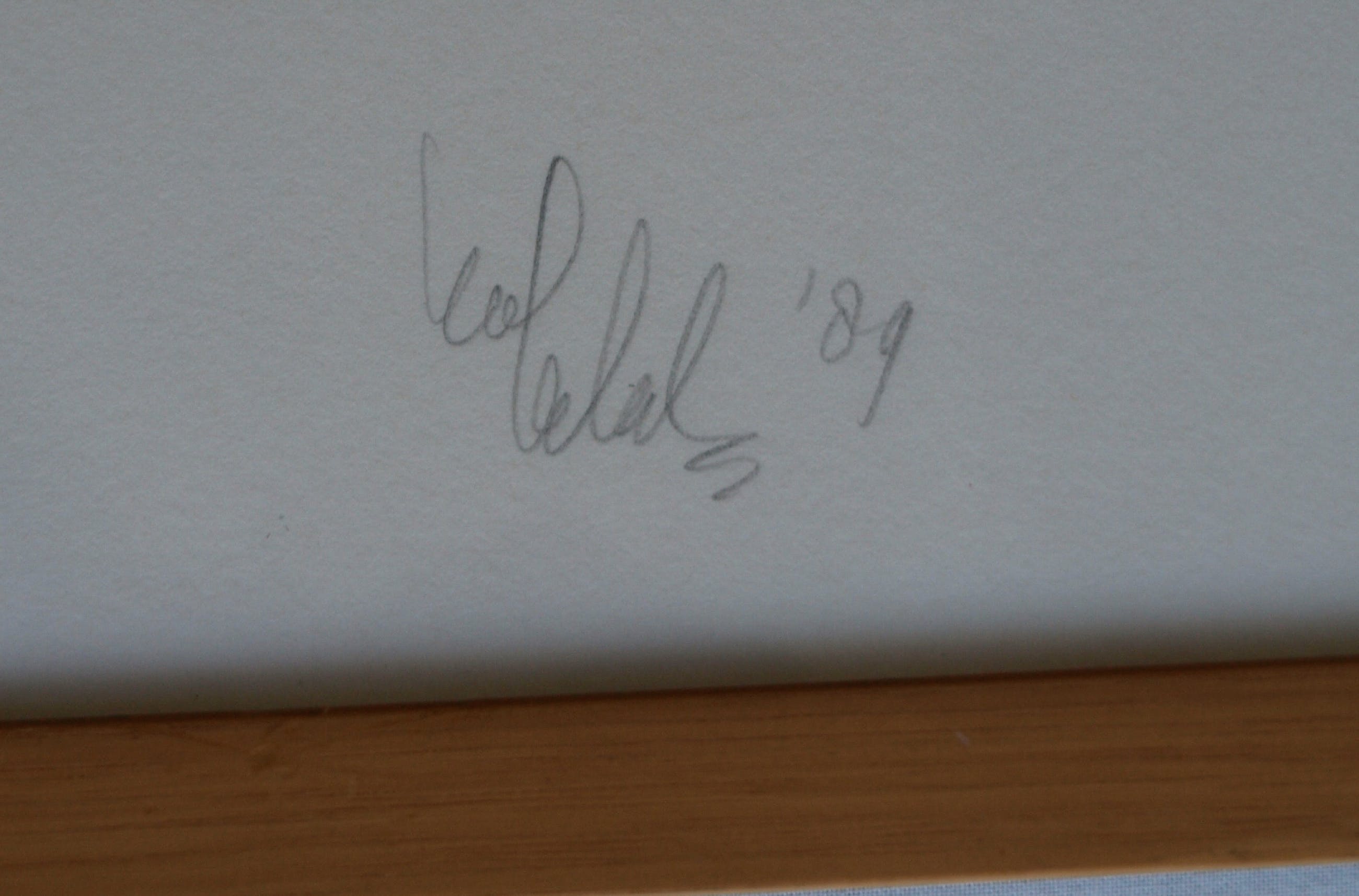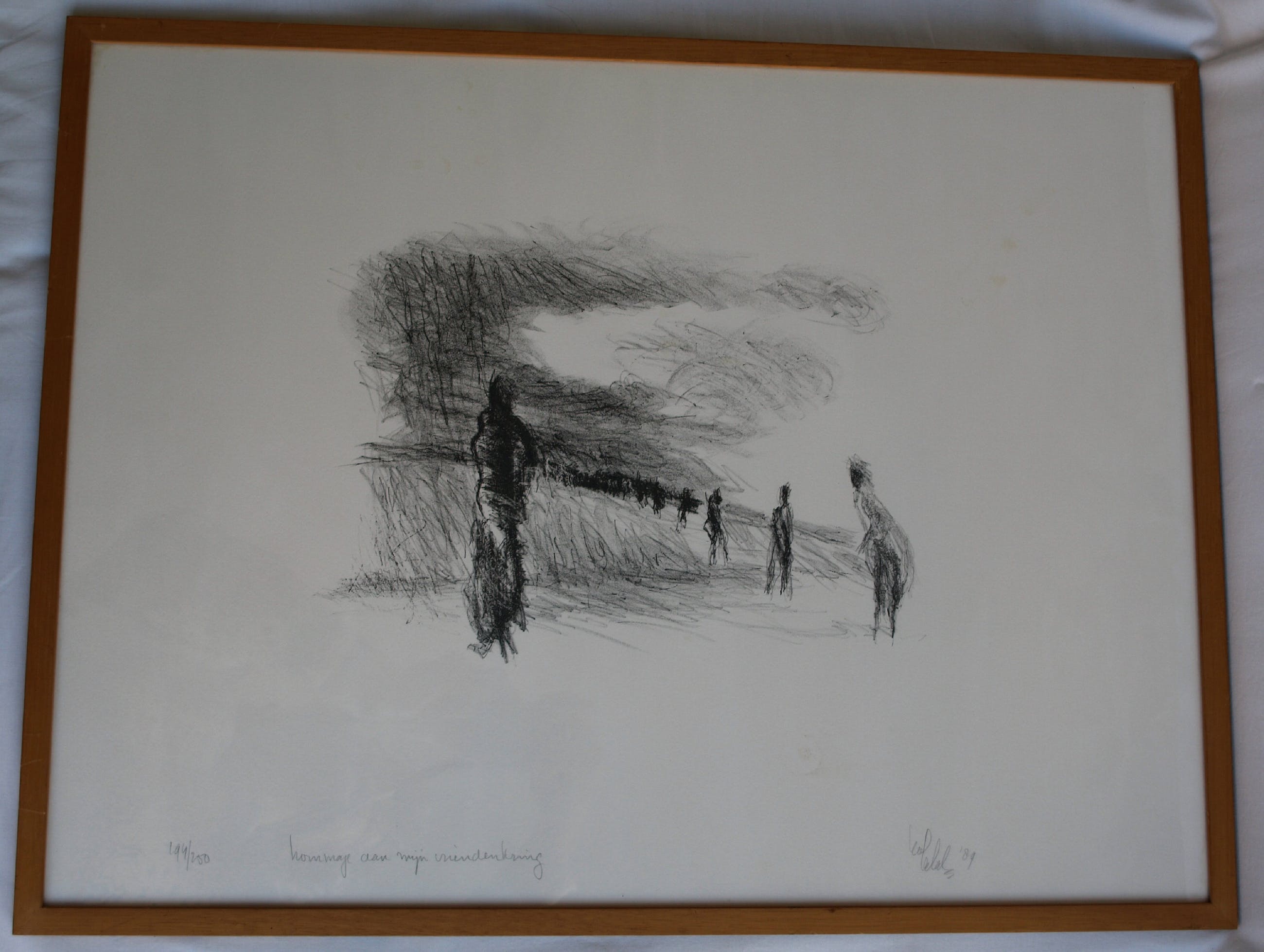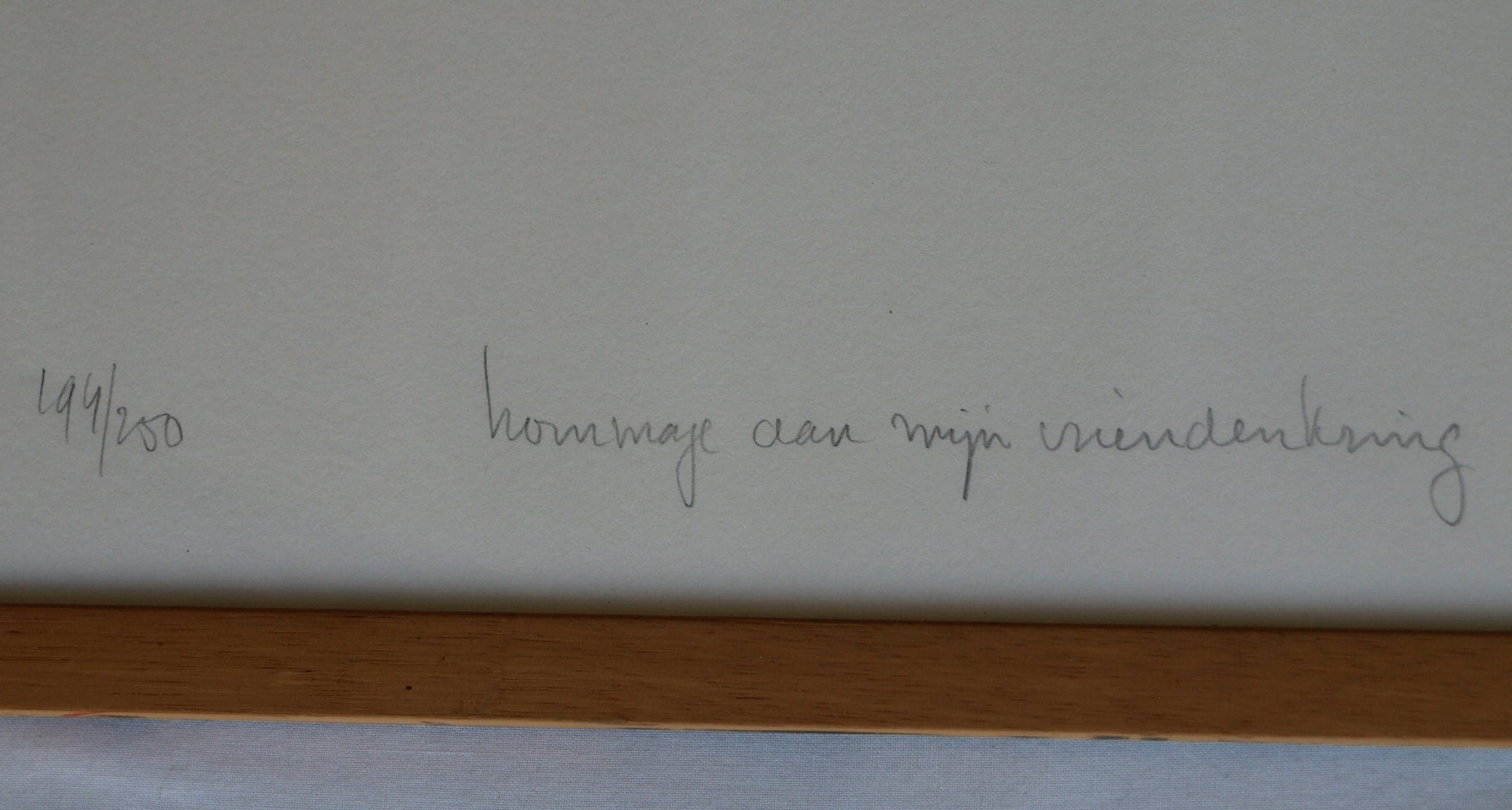 Een ingelijste litho uit 1989 van de Nederlandse kunstenaar Leo Schatz (1918-2014), getiteld “Hommage aan mijn vriendenkring”.