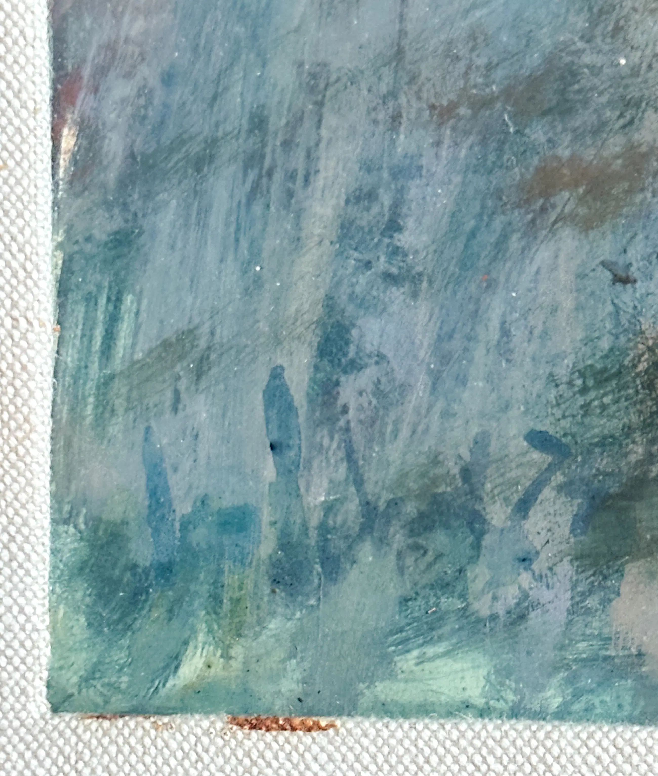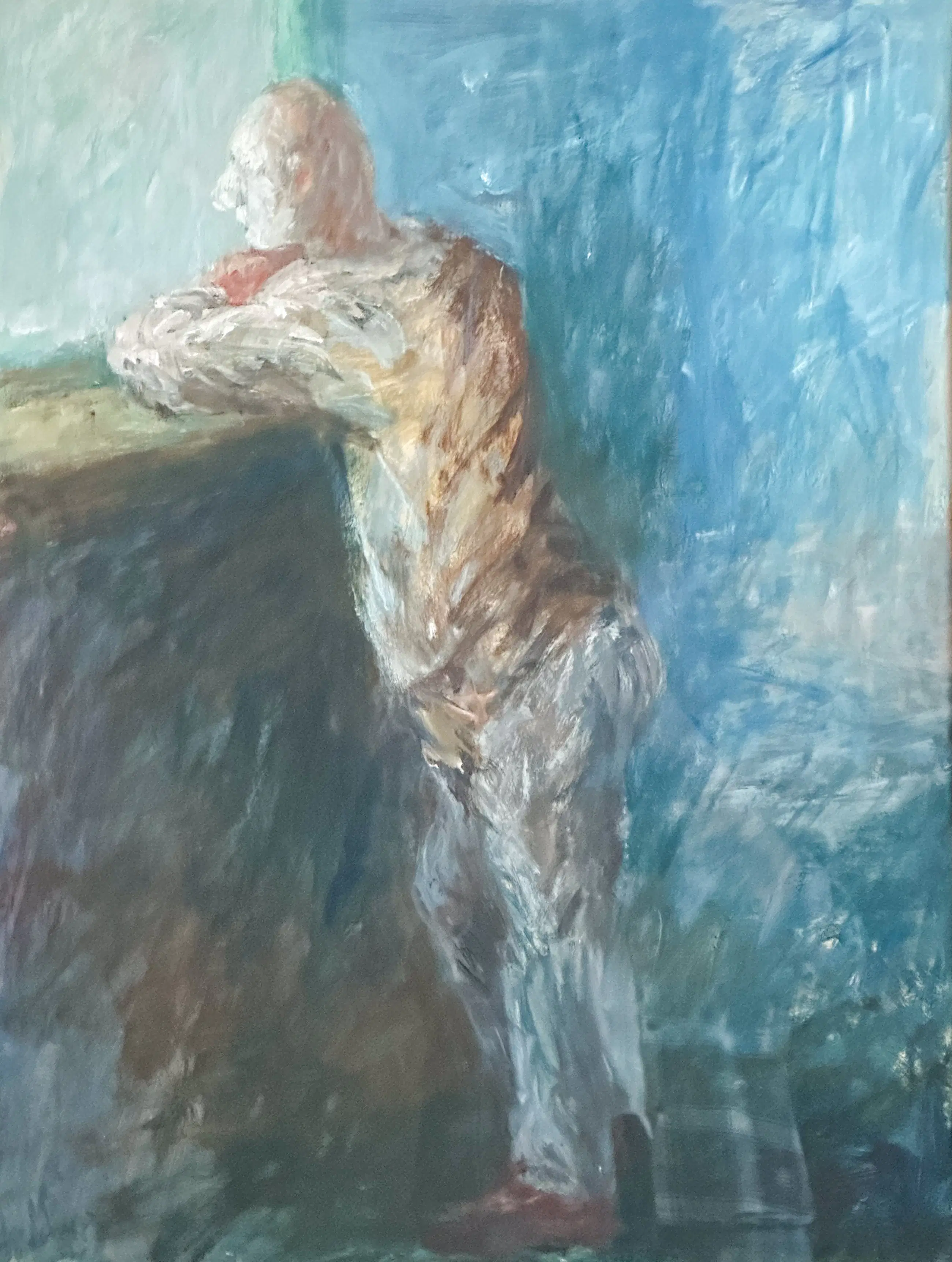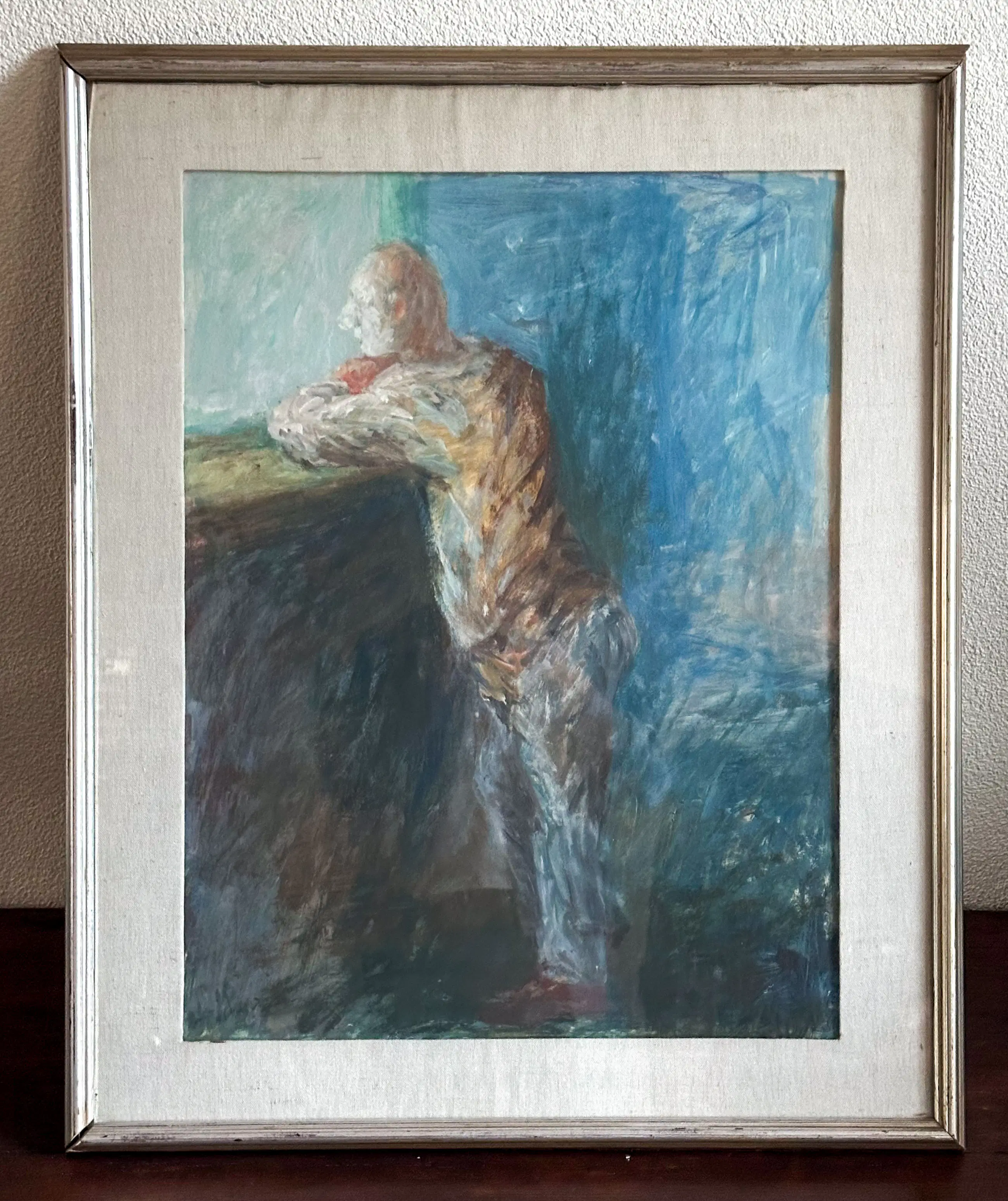 Staande man, leunend bij een vensterbank, weergegeven in expressieve penseelvoering en koele blauwtinten. Het werk ademt verstilling en introspectie, kenmerken die typerend zijn voor het oeuvre van Leo Schatz. Olieverf op board, linksonder gesigneerd in verf.