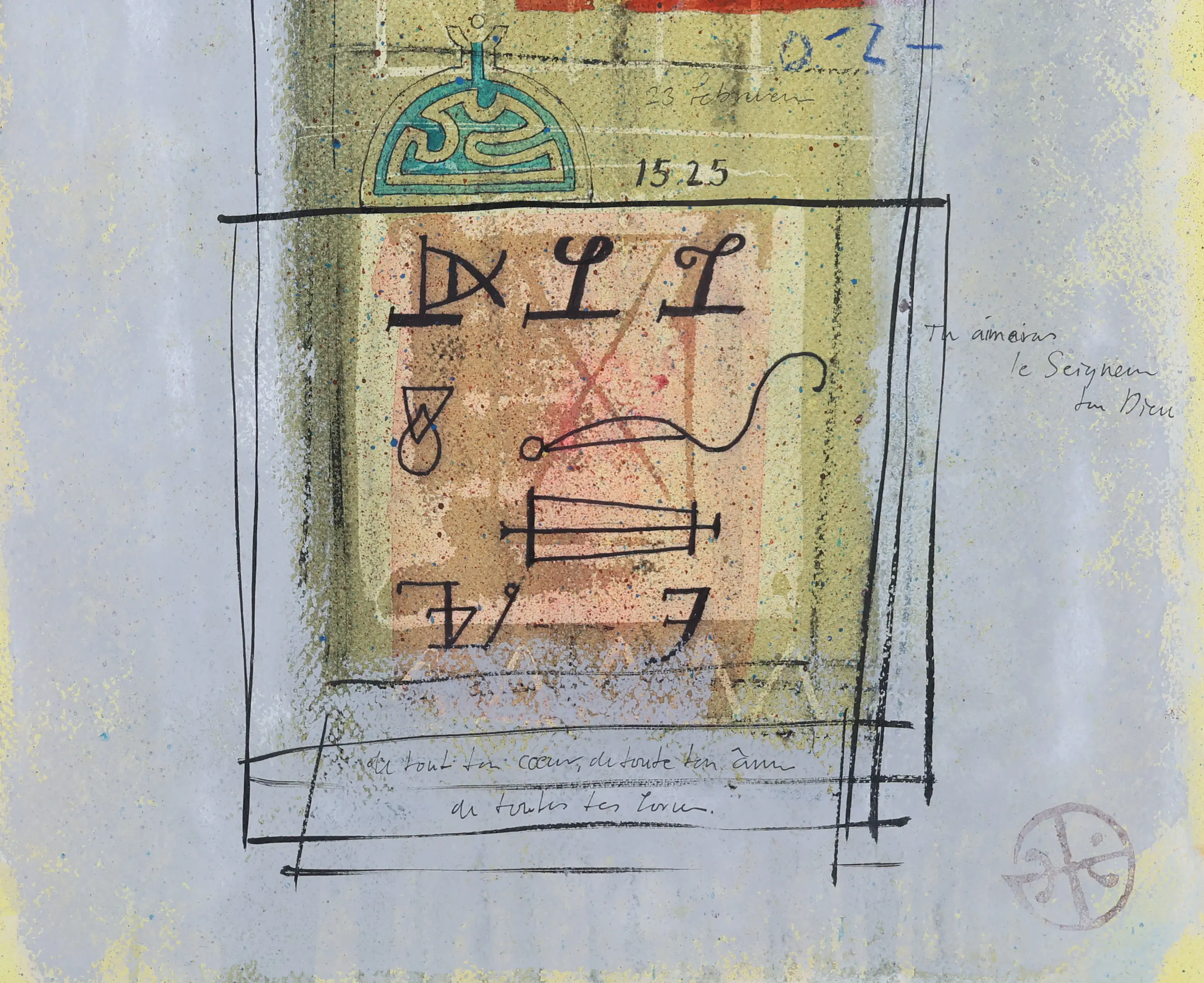 Een fascinatie voor tekens en symbolen uit verschillende culturen en tradities vormt een tweede belangrijke laag in zijn werk. Schepens verwerkt deze symboliek op een intuïtieve manier, vaak binnen een centrale compositie, alsof de kijker wordt uitgenodigd een onbekende, mysterieuze wereld te betreden — een wereld waarin we onze eigen verhouding moeten vinden.