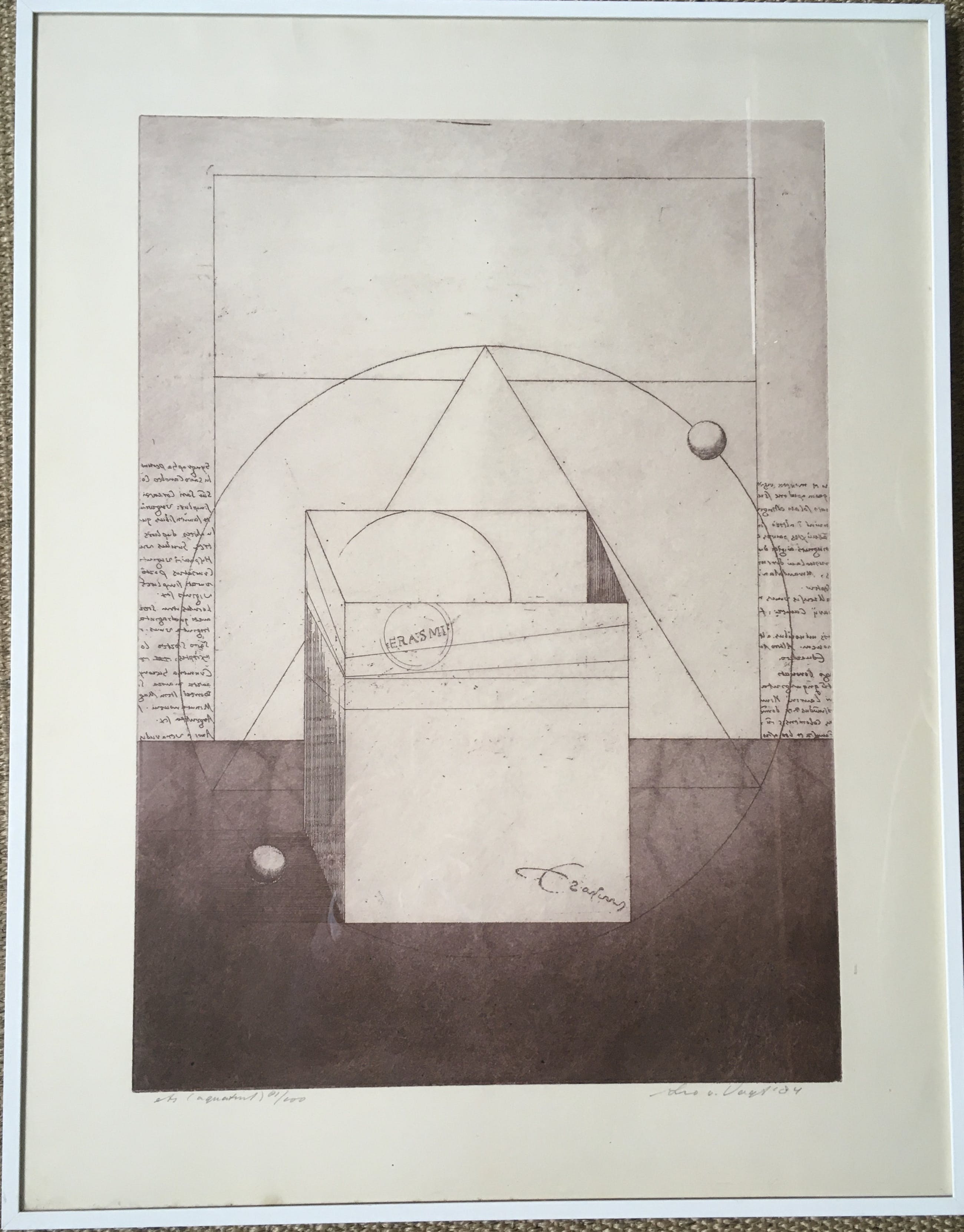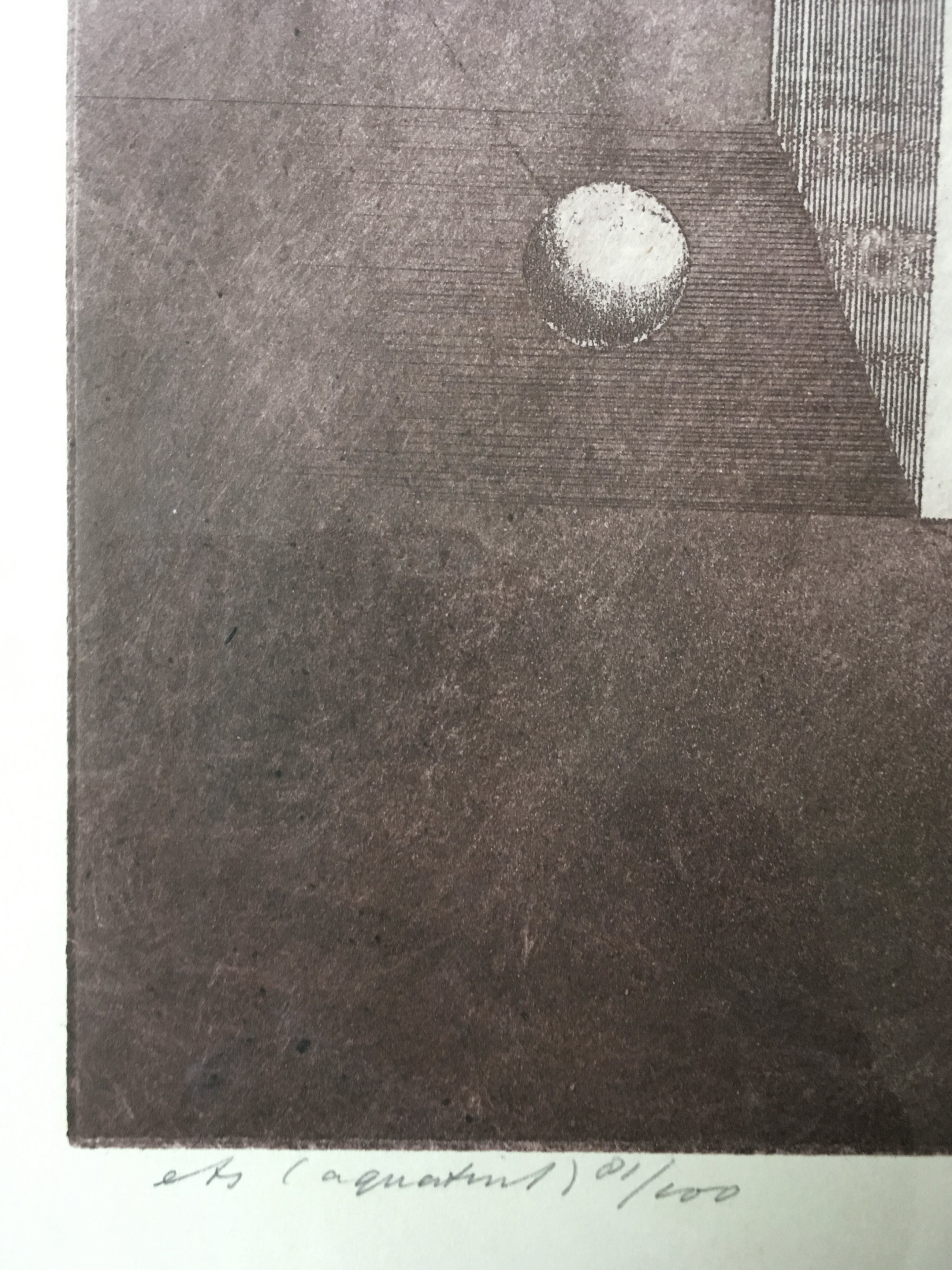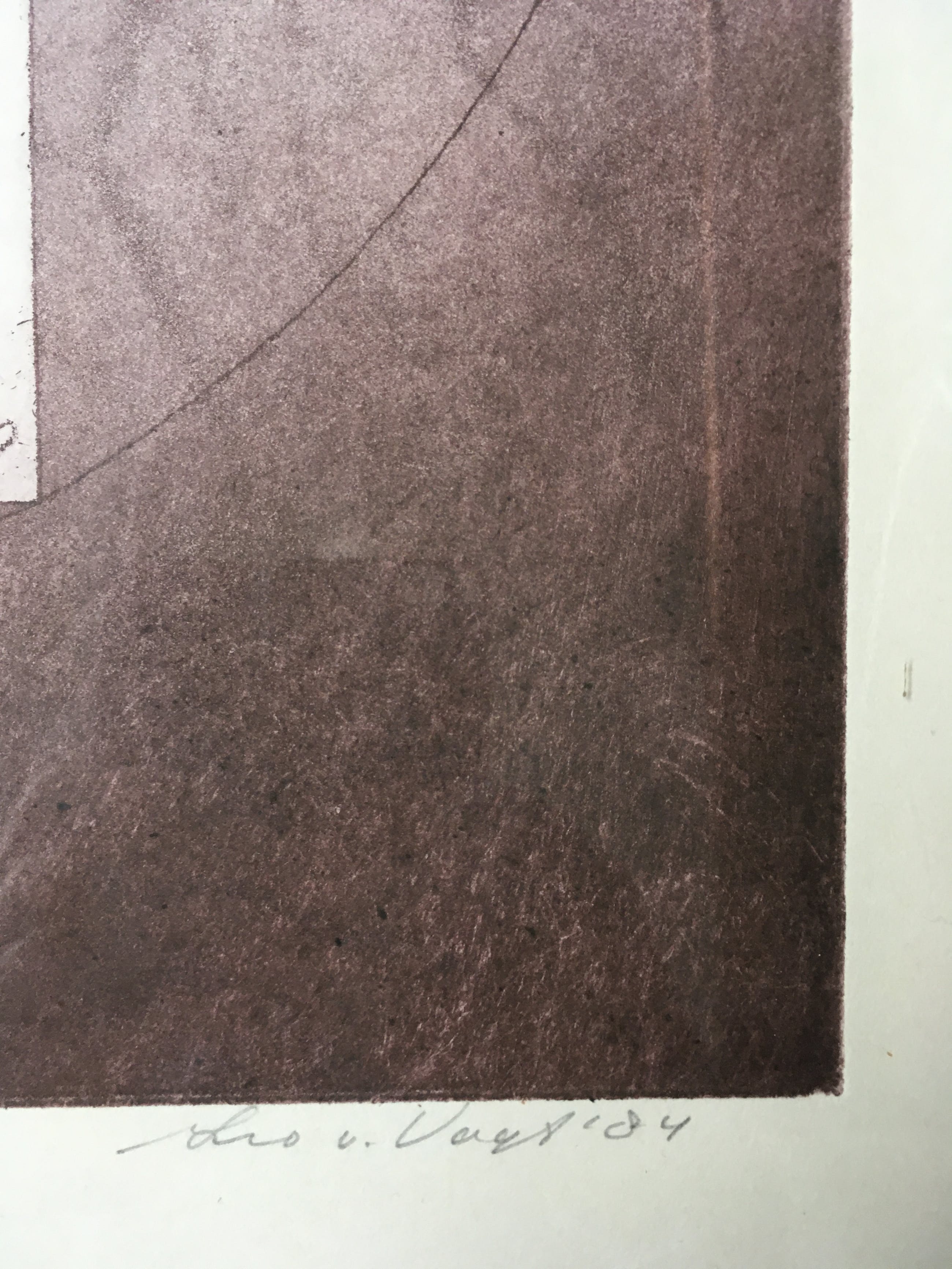 Abstracte ets/aquatint - door Leo van Vugt - 1984 - met potlood genummerd l.o.: 'ets (aquatint) 81/100', gesigneerd/gedateerd r.o.: 'Leo v. Vugt '84'. In witte aluminium wissellijst zonder passe partout. Uitstekende conditie.