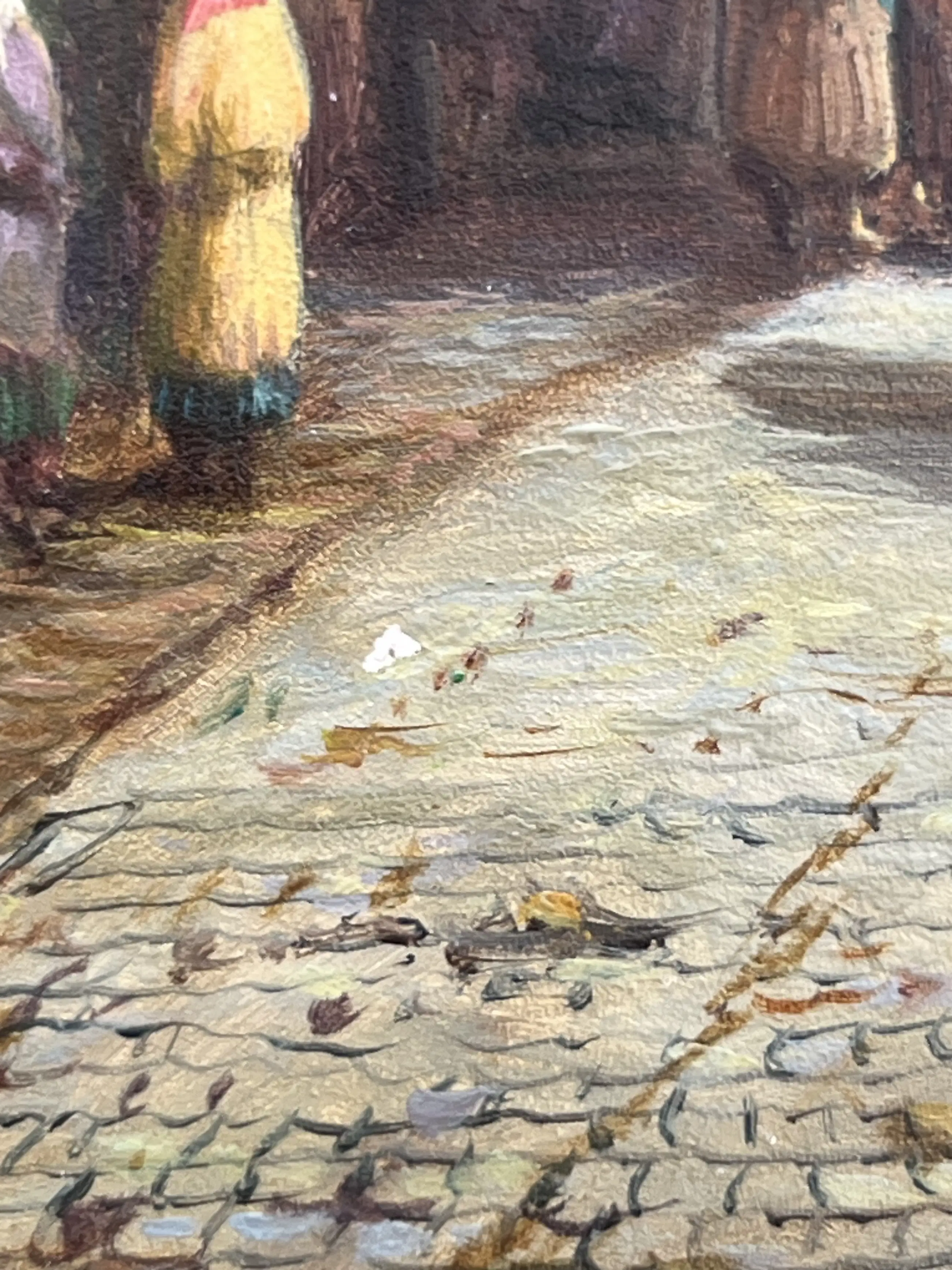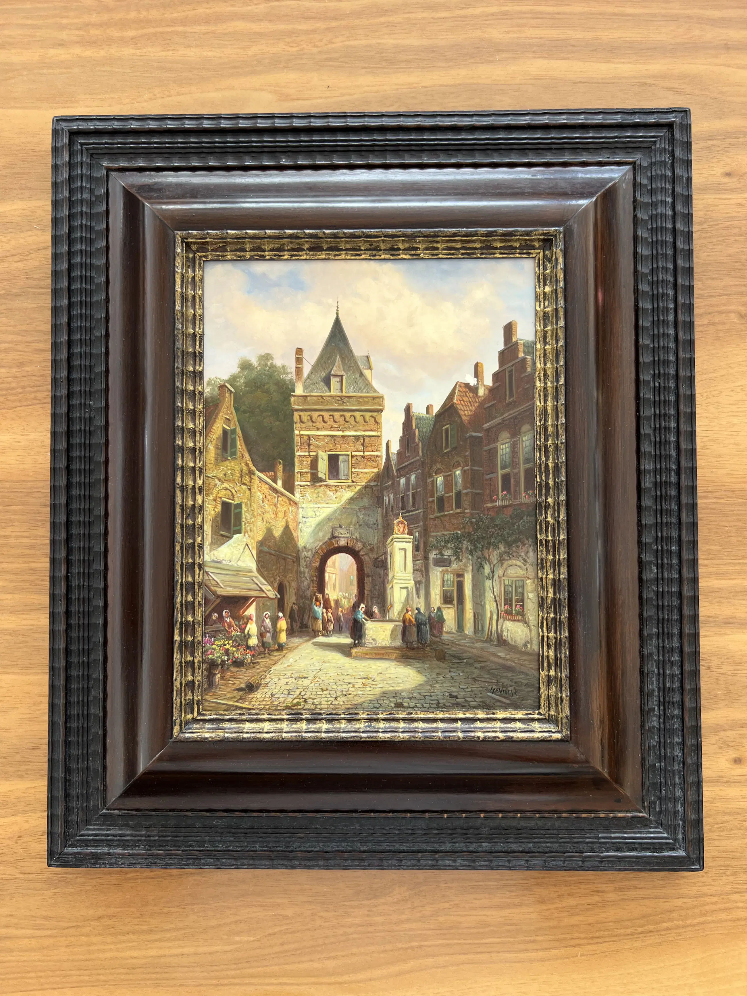 Schilderij van een middeleeuwse stad - een scène met oude herenhuizen, bloemenstalletjes en vrouwen bij de fontein - zeer fijn geschilderd - verf op twee plaatsen beschadigd - zie foto - gesigneerd linksonder - met massief houten lijst