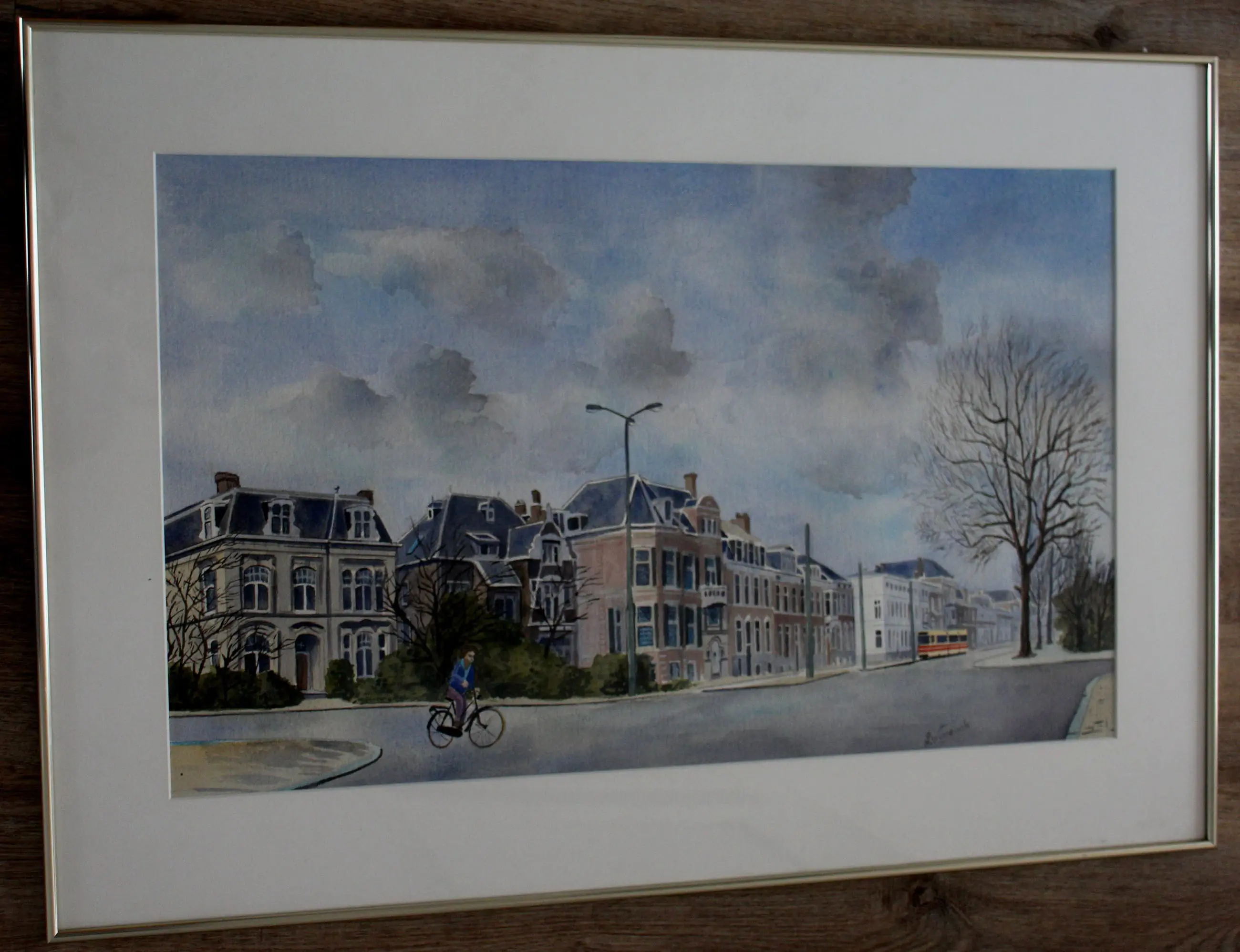 Prachtig werk van hoge kwaliteit! Ingelijste aquarel van Leo Wisselink. Titel: Gezicht op de Javastraat in Den Haag. Afmetingen incl lijst : H67 x b95cm; Afmetingen voorstelling: H46 x b76cm. Het werk is rechts onderaan, met potlood, gesigneerd door de kunstenaar. De authenticiteit van het aangeboden werk wordt volledig gegarandeerd. Een certificaat van echtheid kan, op aanvraag, worden gemaild.