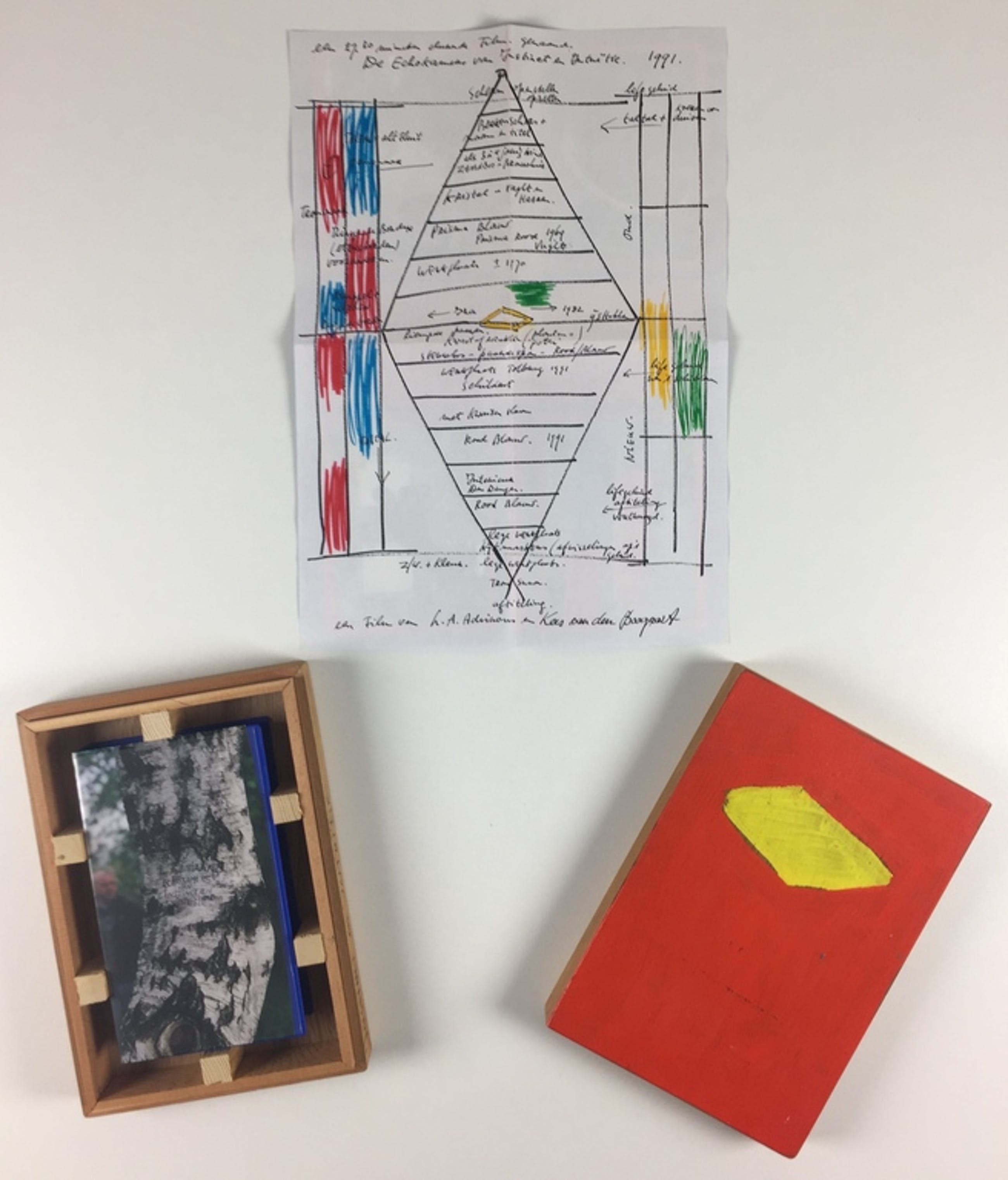 Zeer bijzonder en gezocht kunstobject van de hand van Leon Adriaans. Het betreft een beschilderd, door hemzelf vervaardigd, kistje. Daarin een gesigneerde videoband en een 'brochure'.