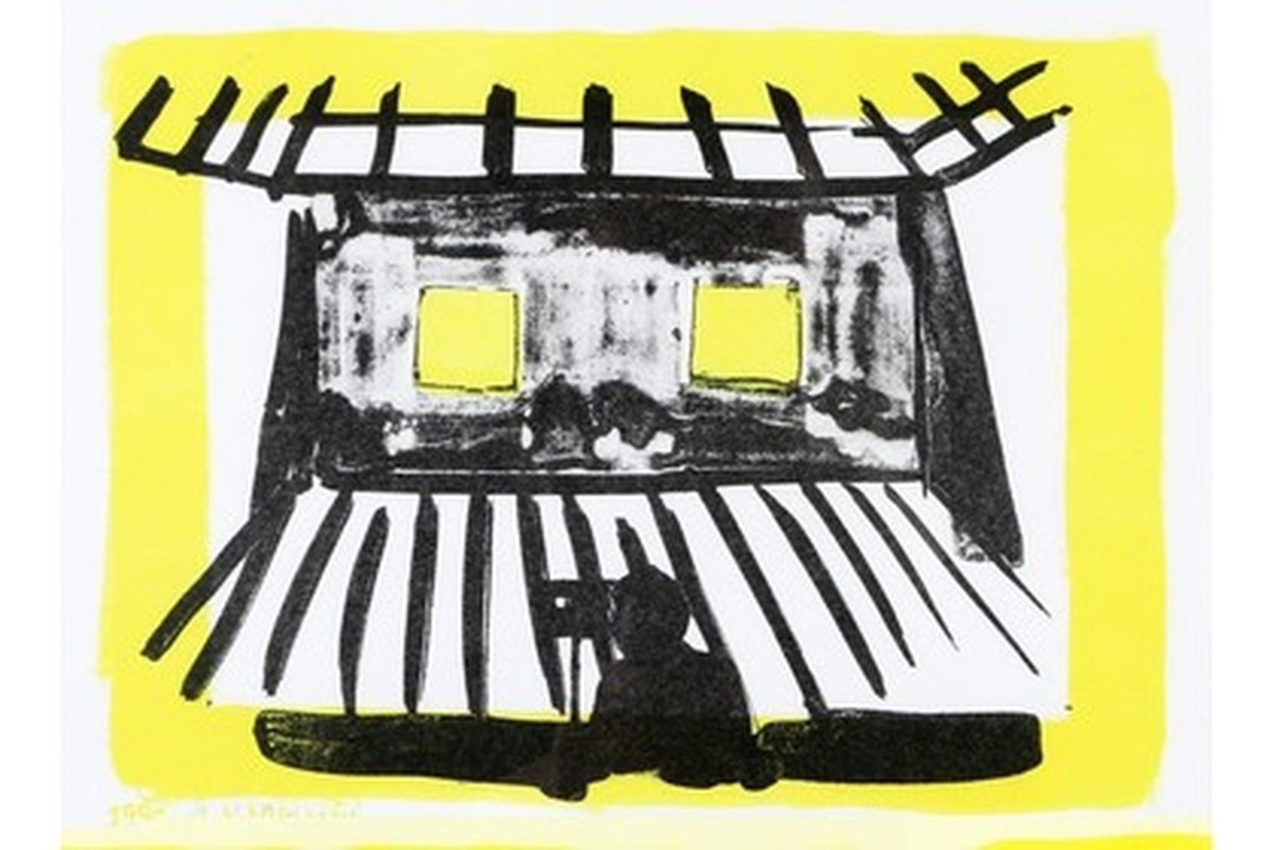 Gesigneerde en genummerdesteendruk, Gele kamer, van Leon Adriaans uit 1990. Formaat 30 x 40 cm. Afgedrukt in een oplage van 40 exemplaren is dit nummer 1. De zeefdruk kan met lijst (34 x 44 cm) worden opgehaald in onze galerie in Arkel of zonder palijst aangetekend worden verzonden in een stevige kartonnen verpakking.
