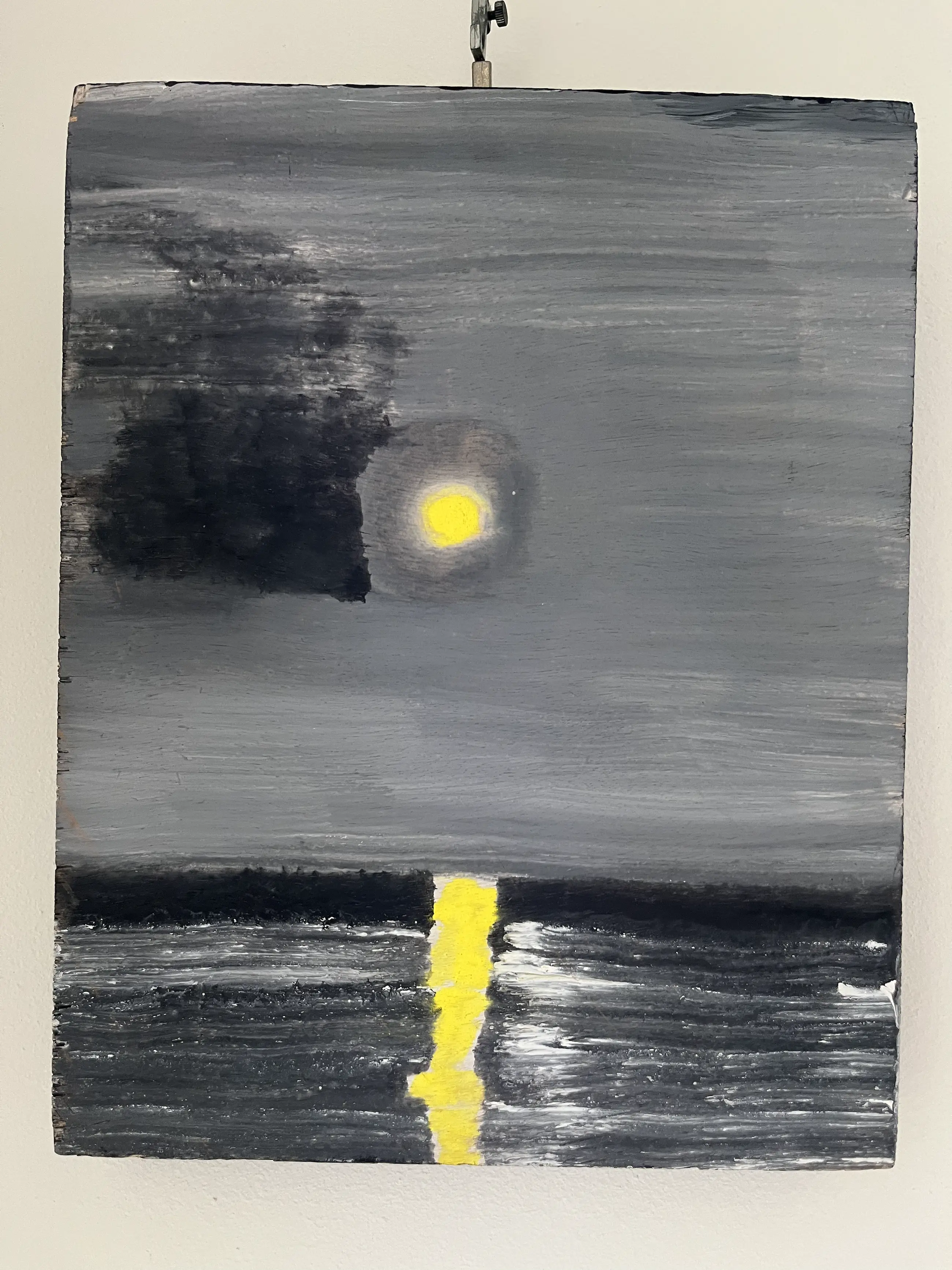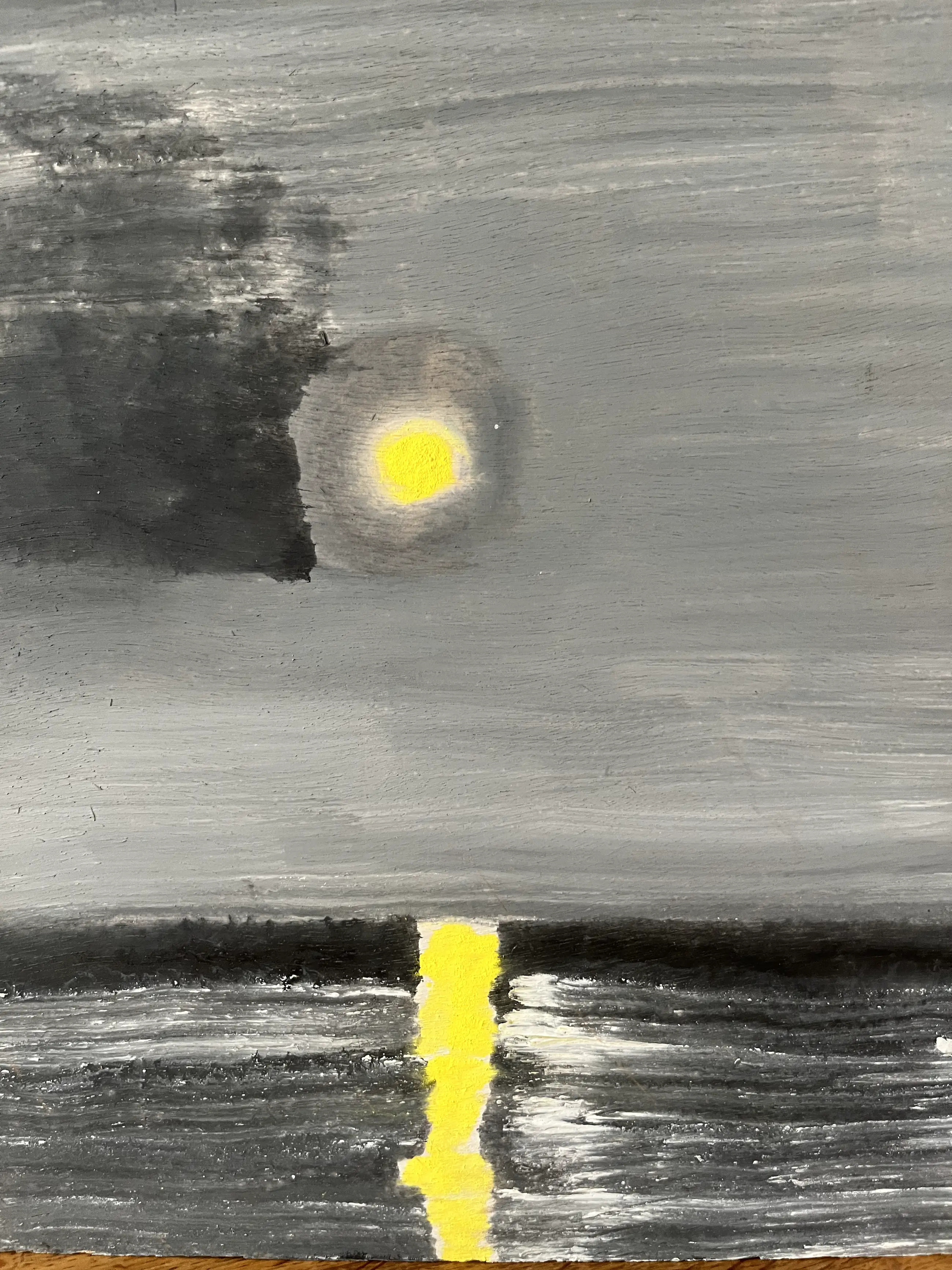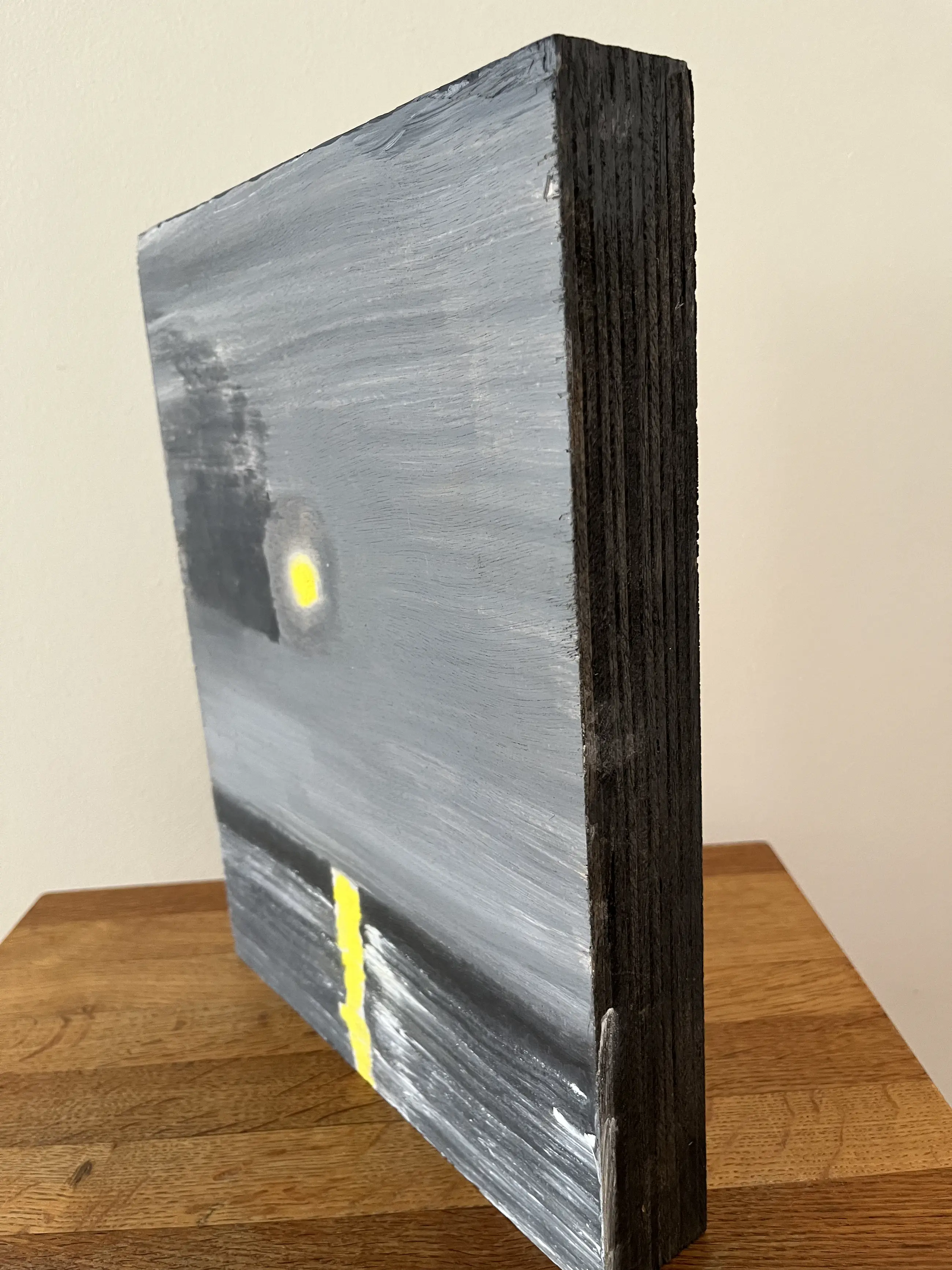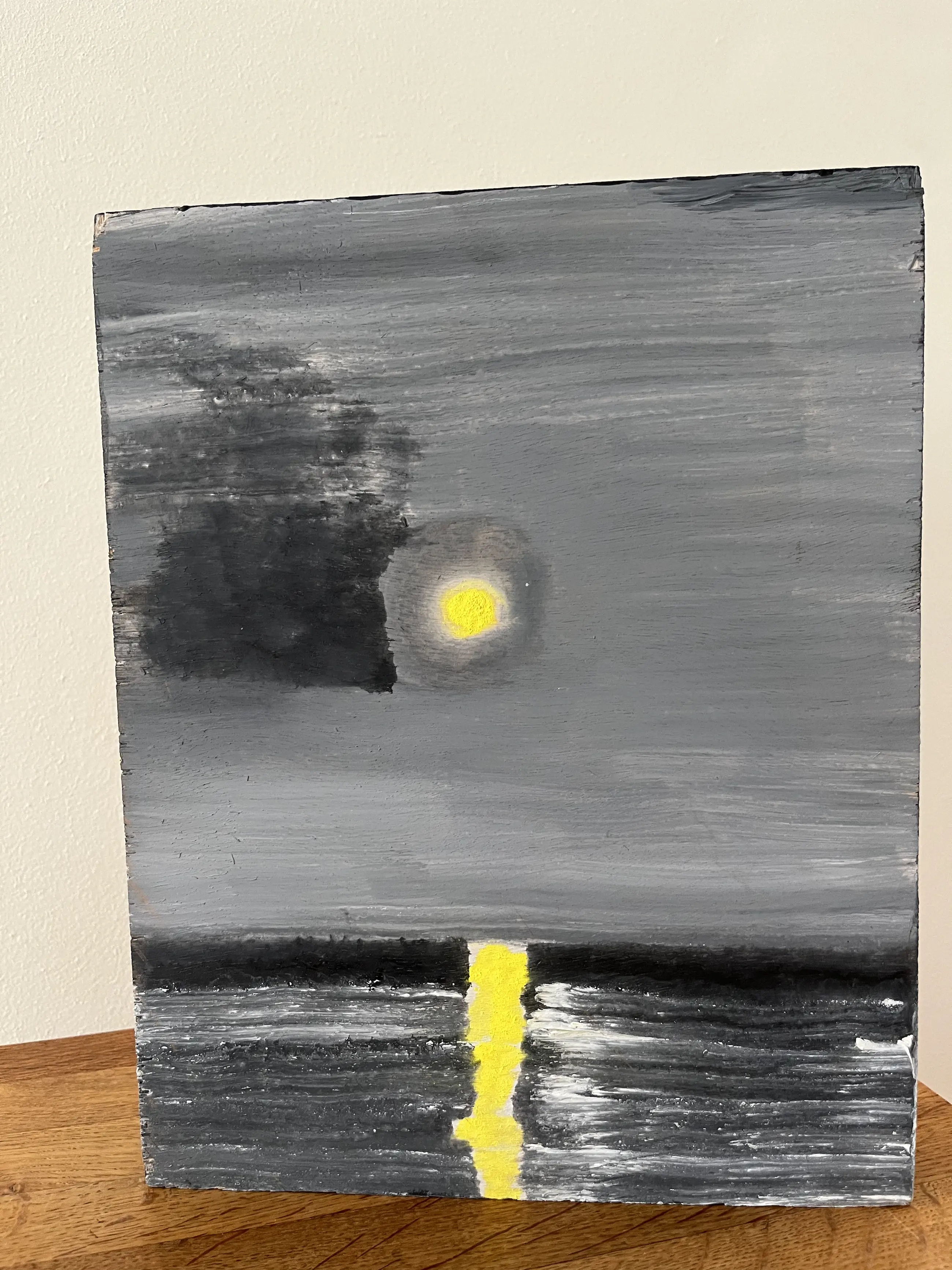 Sfeervol en treffend geschilderd maanlandschap uit 1988. Olieverf op hout. Afmeting 31,5 x 25 cm. Diep 4 cm. Werk is aan achterzijde gesigneerd.