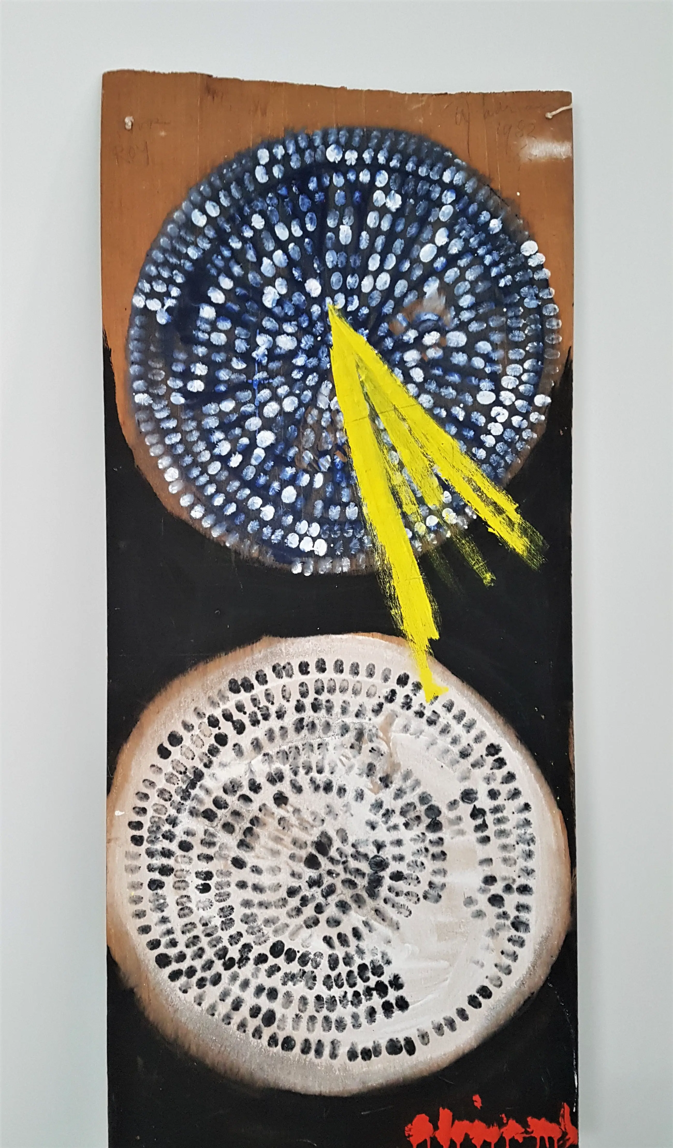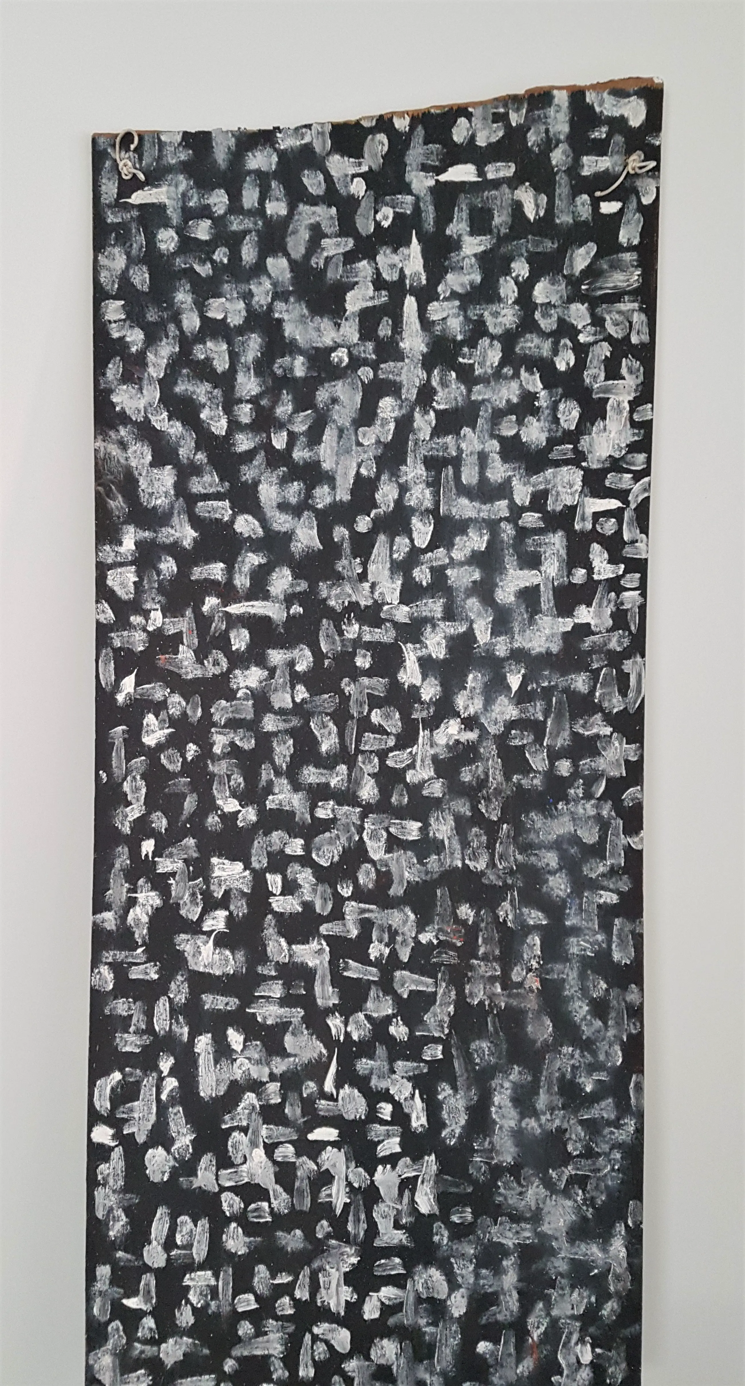 Prachtig voorbeeld van Leon Adriaans' interpretatie van de Arte Povera, waarbij Adriaans door het gebruik van de materialen om hem heen, zoals stukken afvalhout en papieren veevoederzakken in vaak heldere, vrolijke kleuren de gebeurtenissen om hem heen schilderde.