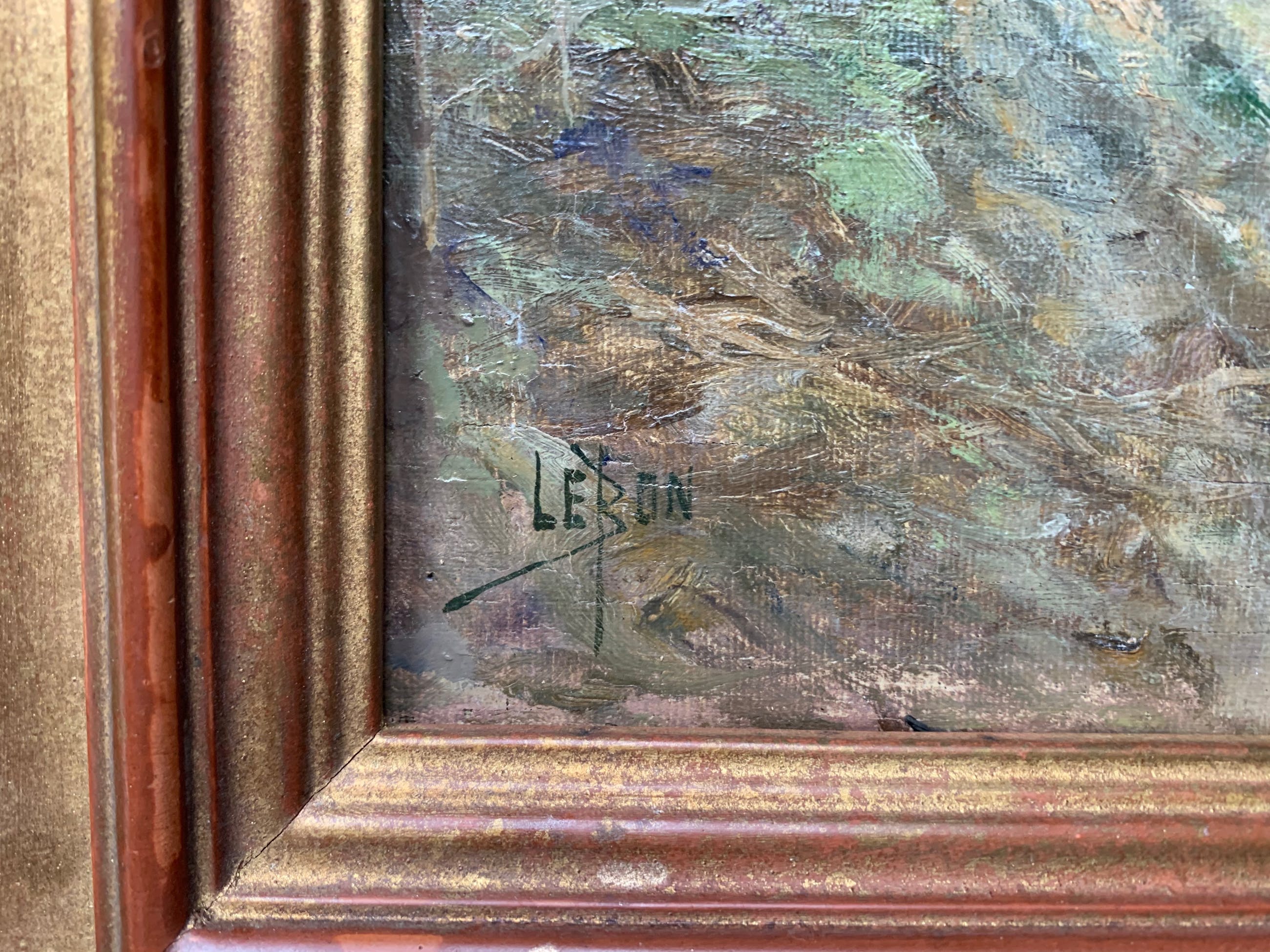Een prachtig schilderij van de Vlaamse kunstschilder Leon G. Lebon (geboren in 1846). Een museaal werk dat bijna anderhalve eeuw geleden is gemaakt. Leon G. Lebon schilderde bij voorkeur landschappen en boompartijen, waarvoor hij zijn inspiratie op het Vlaamse platteland vond. Hij was lid van de Kring l'Essor, stelde tentoon op de Exposition d'Anvers in 1898. Zijn werk hangt o.a. in het museum van Oostende.