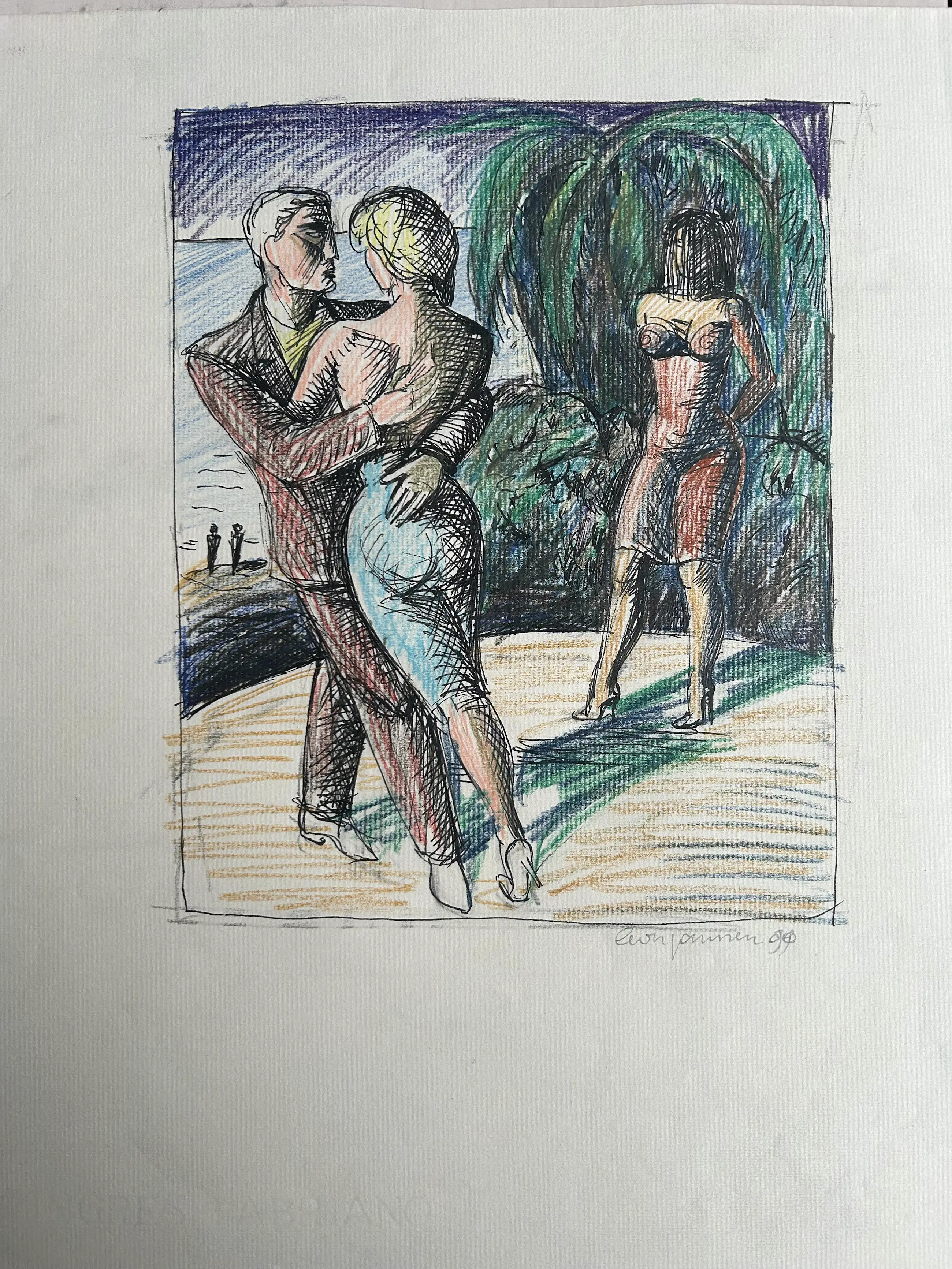 Leon Janssen, tekening potlood met kleur, Dansende echtpaar