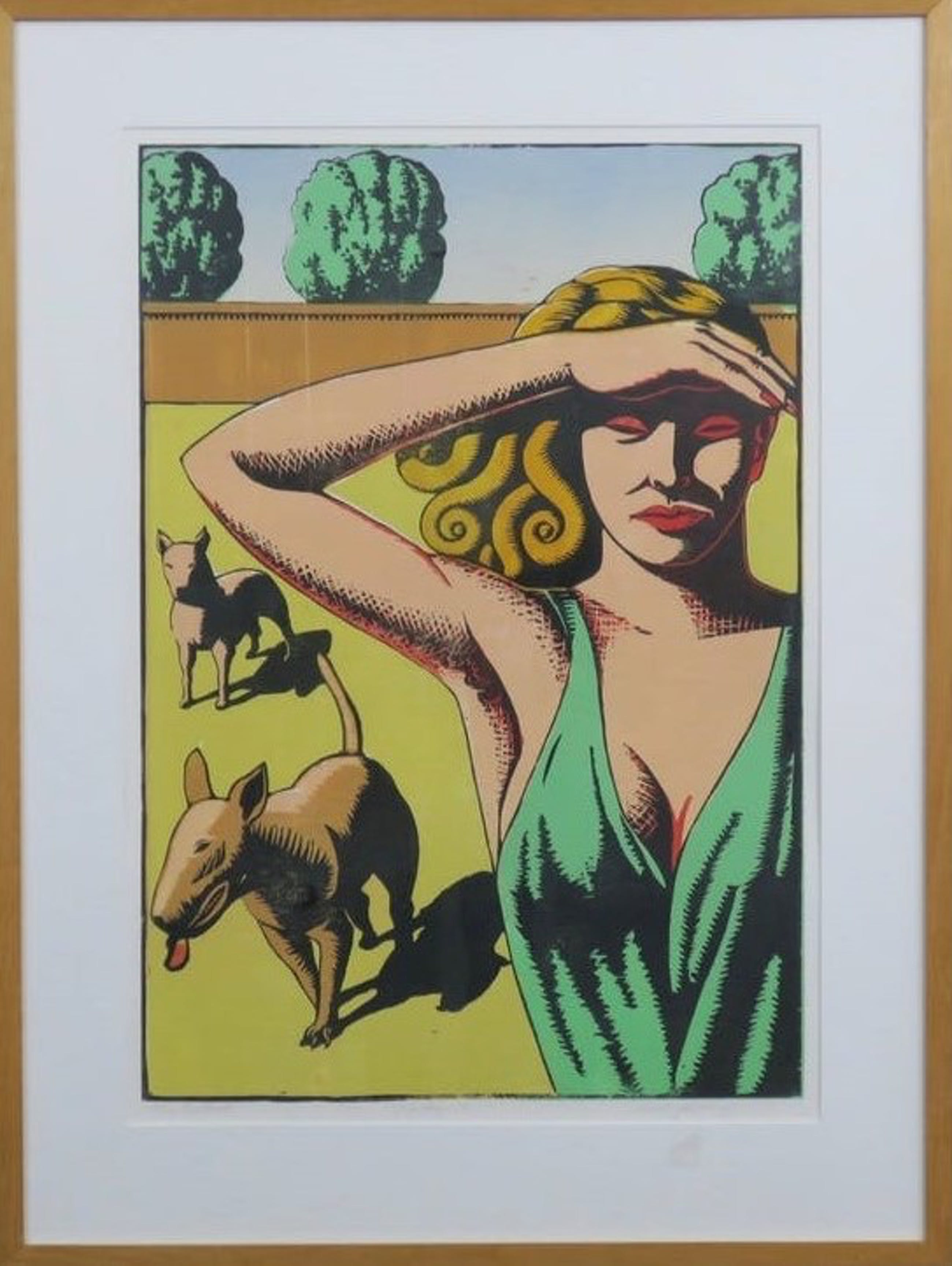 Titel: Dog days II Jaartal: 1994 Afmetingen lijst: 90 cm x 67 cm Gesigneerd: Ja, handgeschreven met potlood (rechtsonder) Materiaal: Houtsnede op papier Ingelijst: Ja, in houten goudkleurige lijst Conditie: In zeer goede staat