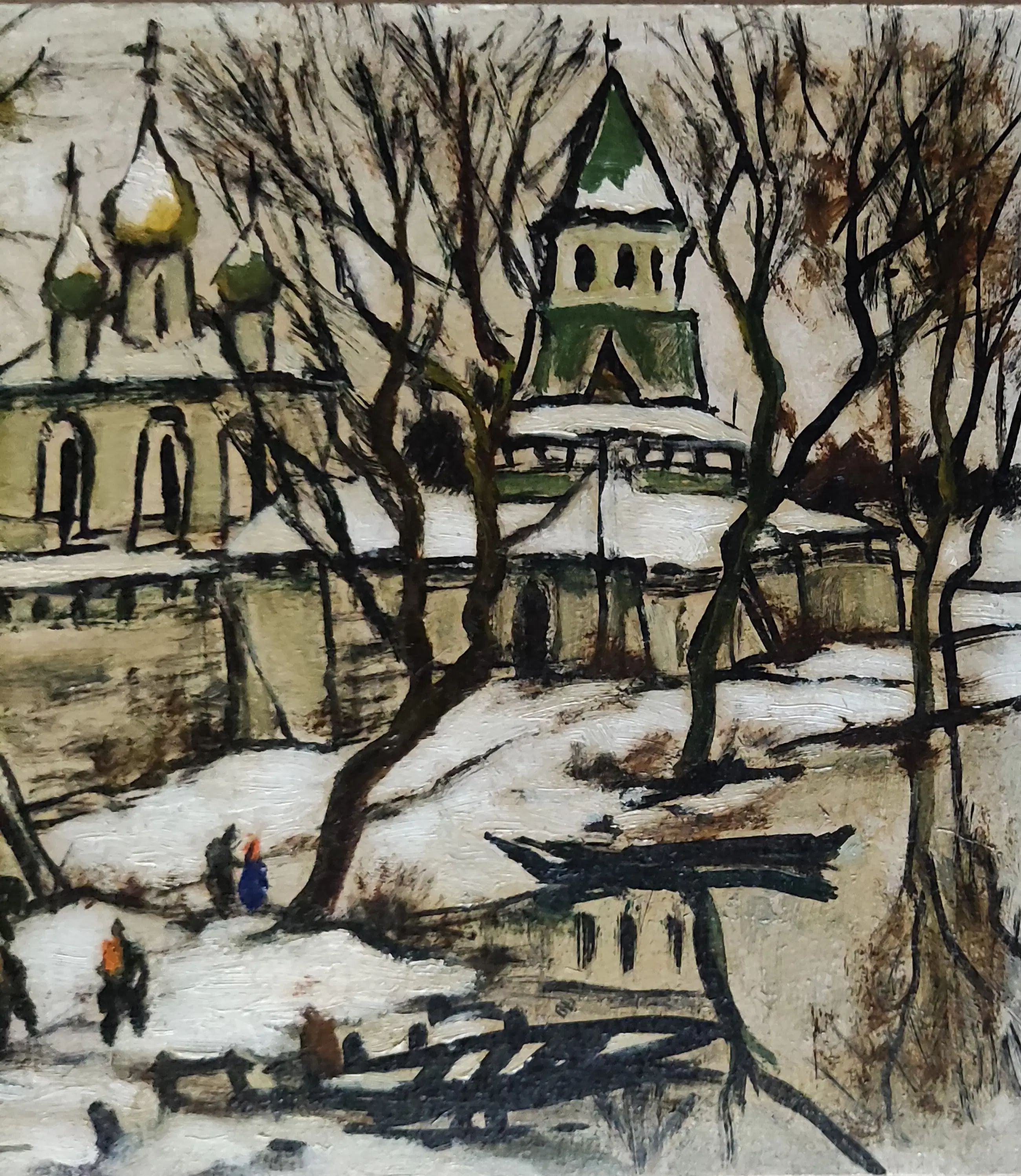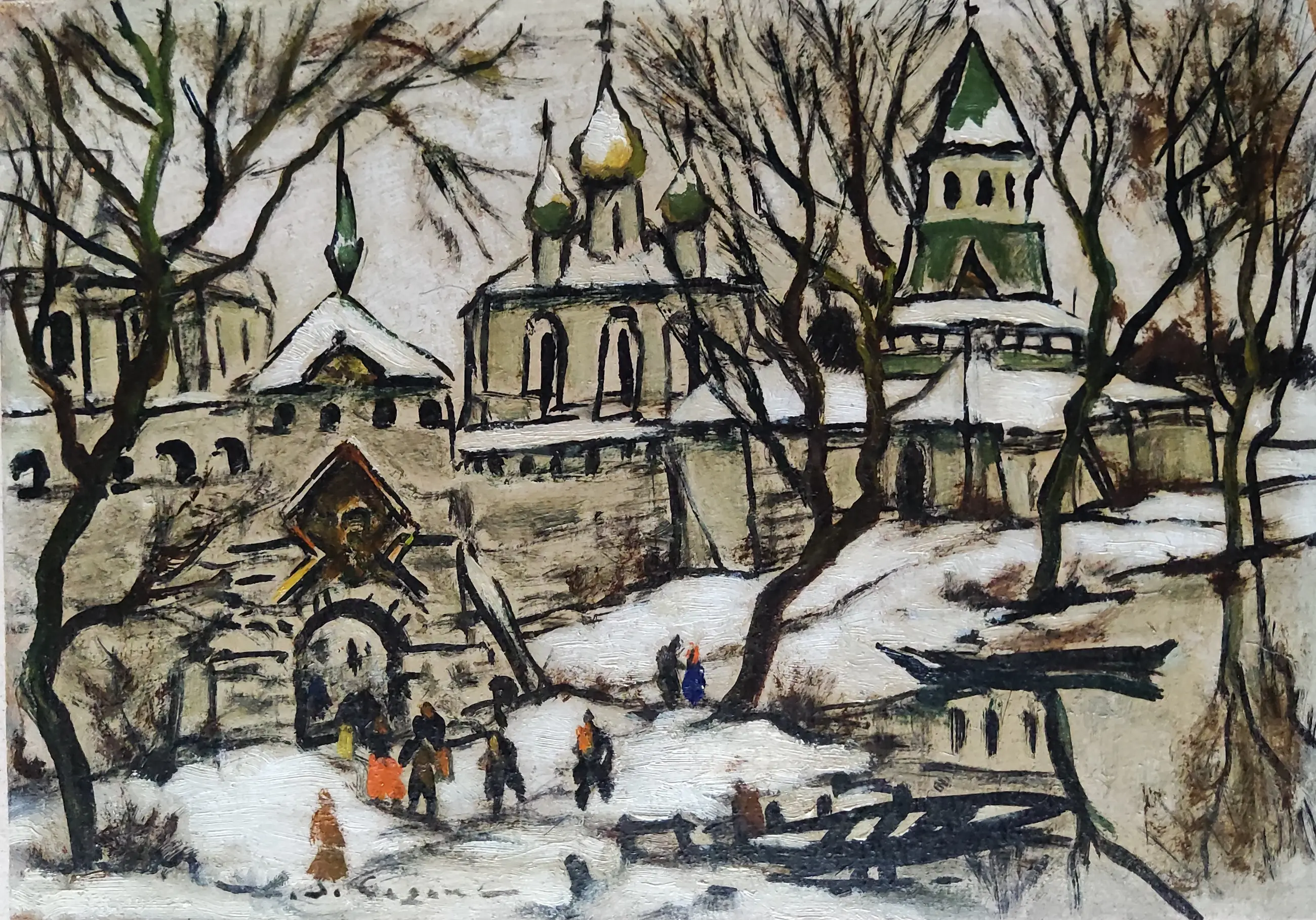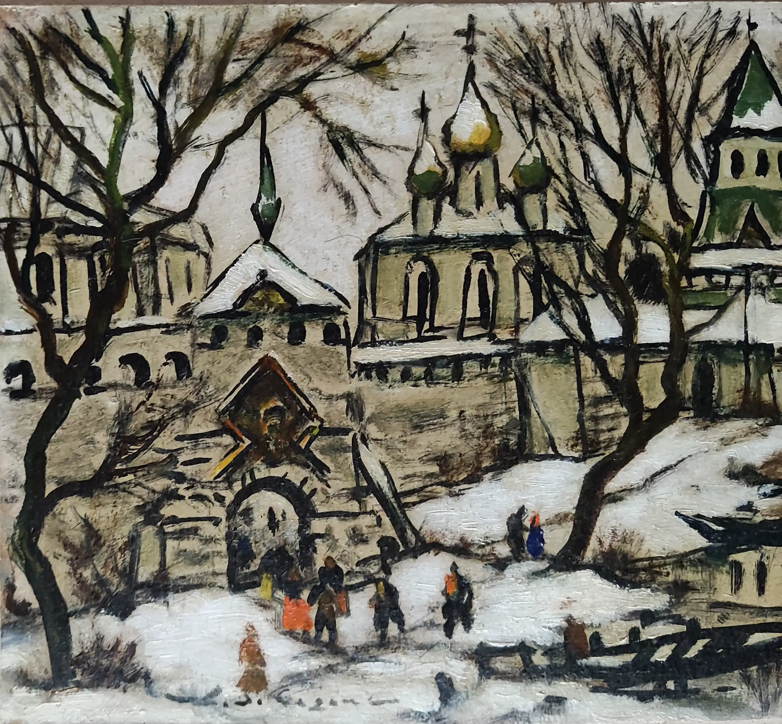Sfeervol werk voorstellende figuren bij een orthodox klooster in de winterse sneeuw. Gesigneerd linksonder. Leonid Sologoub werd geboren te Yeysk (Rusland) op 16 april 1884 en overleed te Den Haag op 17 juli 1956. Opgeleid aan de Academie voor Beeldende Kunst te Sint-Petersburg. Leraar van W.C. Zandvoort. Tijdens wereldoorlog I was hij soldaat. Na de oorlog ging hij naar Rome tot 1927. Daarna tot zijn dood in 1956 gewoond en gewerkt te Den Haag. Schilder en tekenaar van landschappen en stadsgezichten. Was lid van Pulchri Studio en de Haagse Kunstkring.