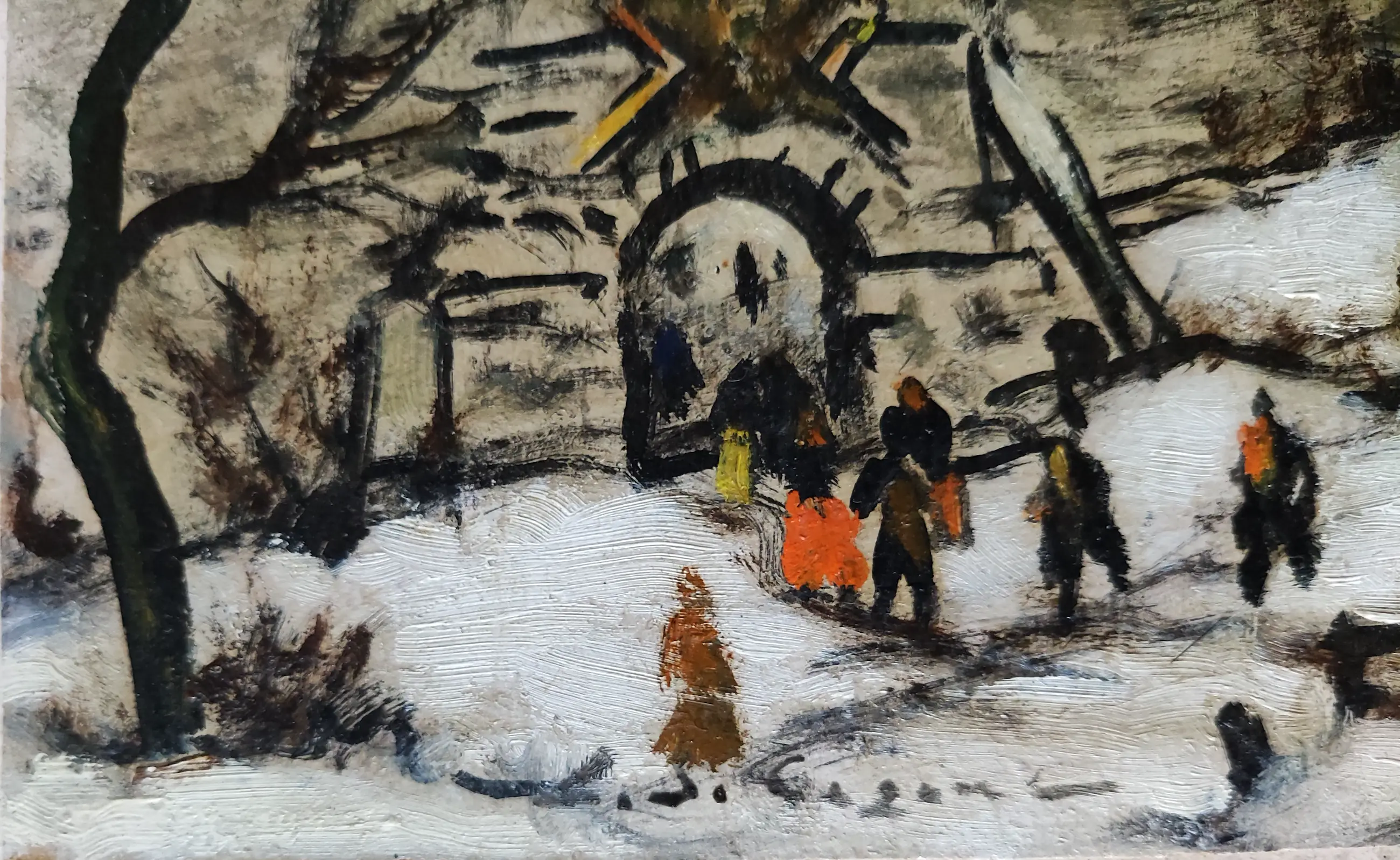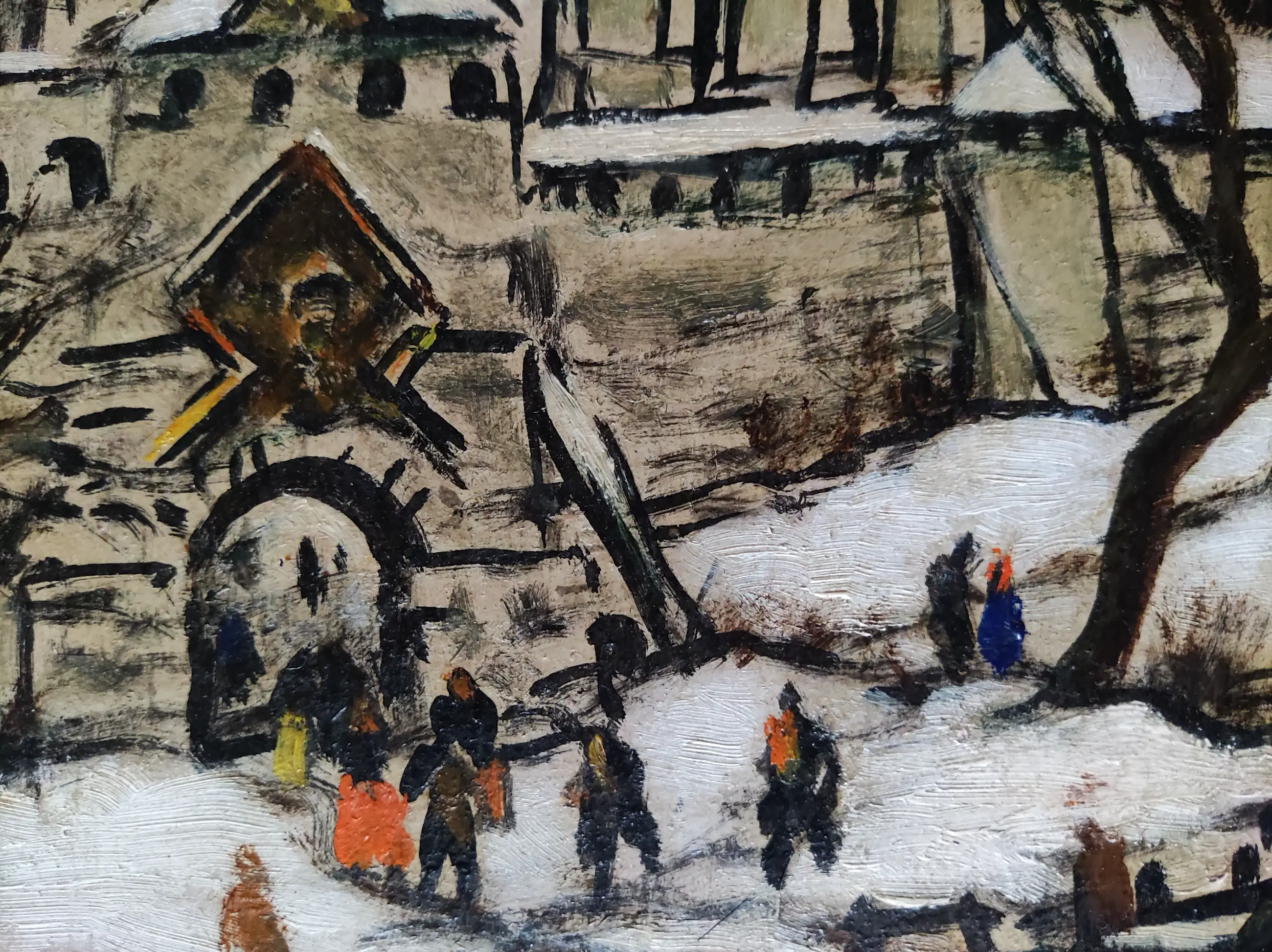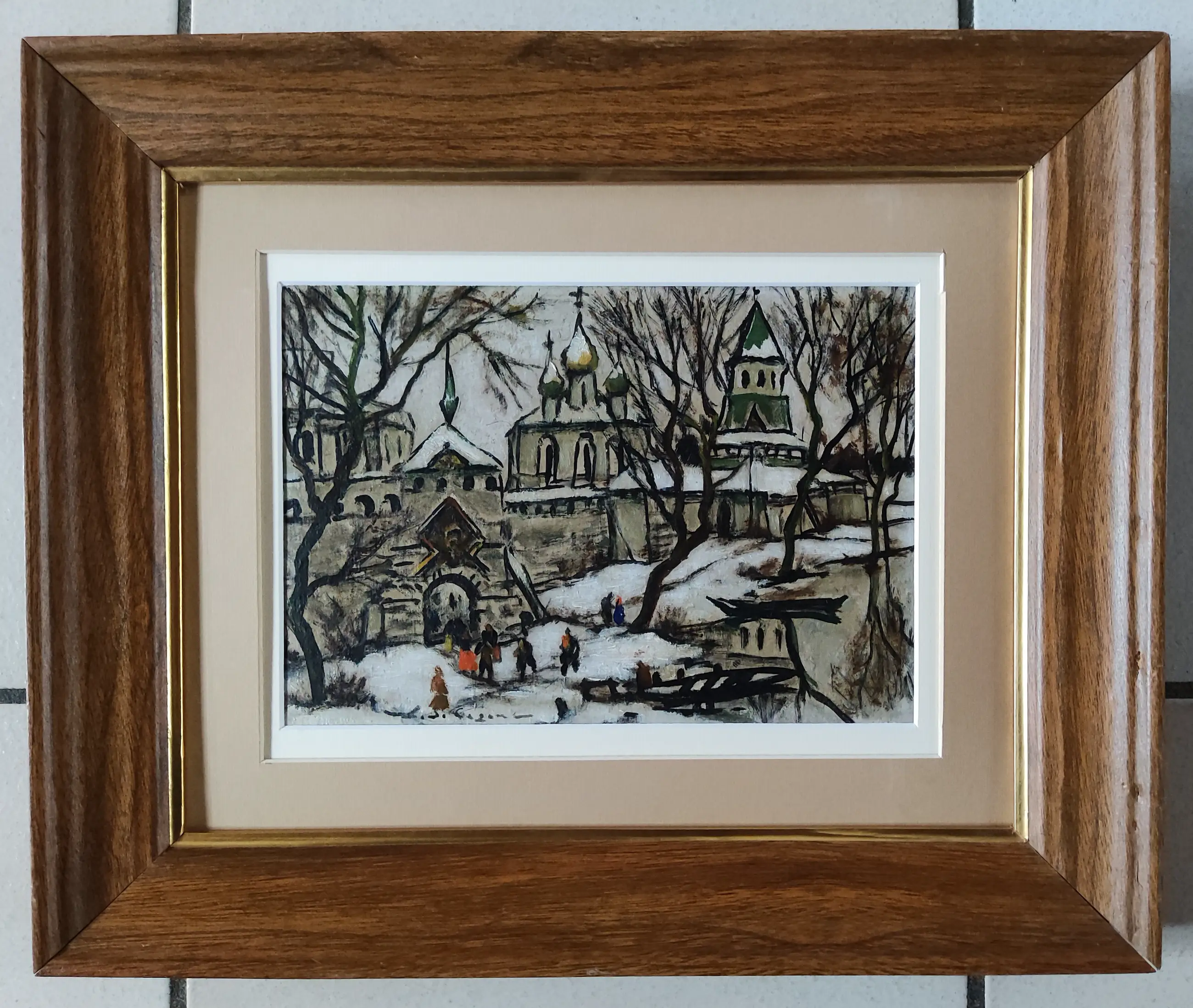 Sfeervol werk voorstellende figuren bij een orthodox klooster in de winterse sneeuw. Gesigneerd linksonder. Leonid Sologoub werd geboren te Yeysk (Rusland) op 16 april 1884 en overleed te Den Haag op 17 juli 1956. Opgeleid aan de Academie voor Beeldende Kunst te Sint-Petersburg. Leraar van W.C. Zandvoort. Tijdens wereldoorlog I was hij soldaat. Na de oorlog ging hij naar Rome tot 1927. Daarna tot zijn dood in 1956 gewoond en gewerkt te Den Haag. Schilder en tekenaar van landschappen en stadsgezichten. Was lid van Pulchri Studio en de Haagse Kunstkring.