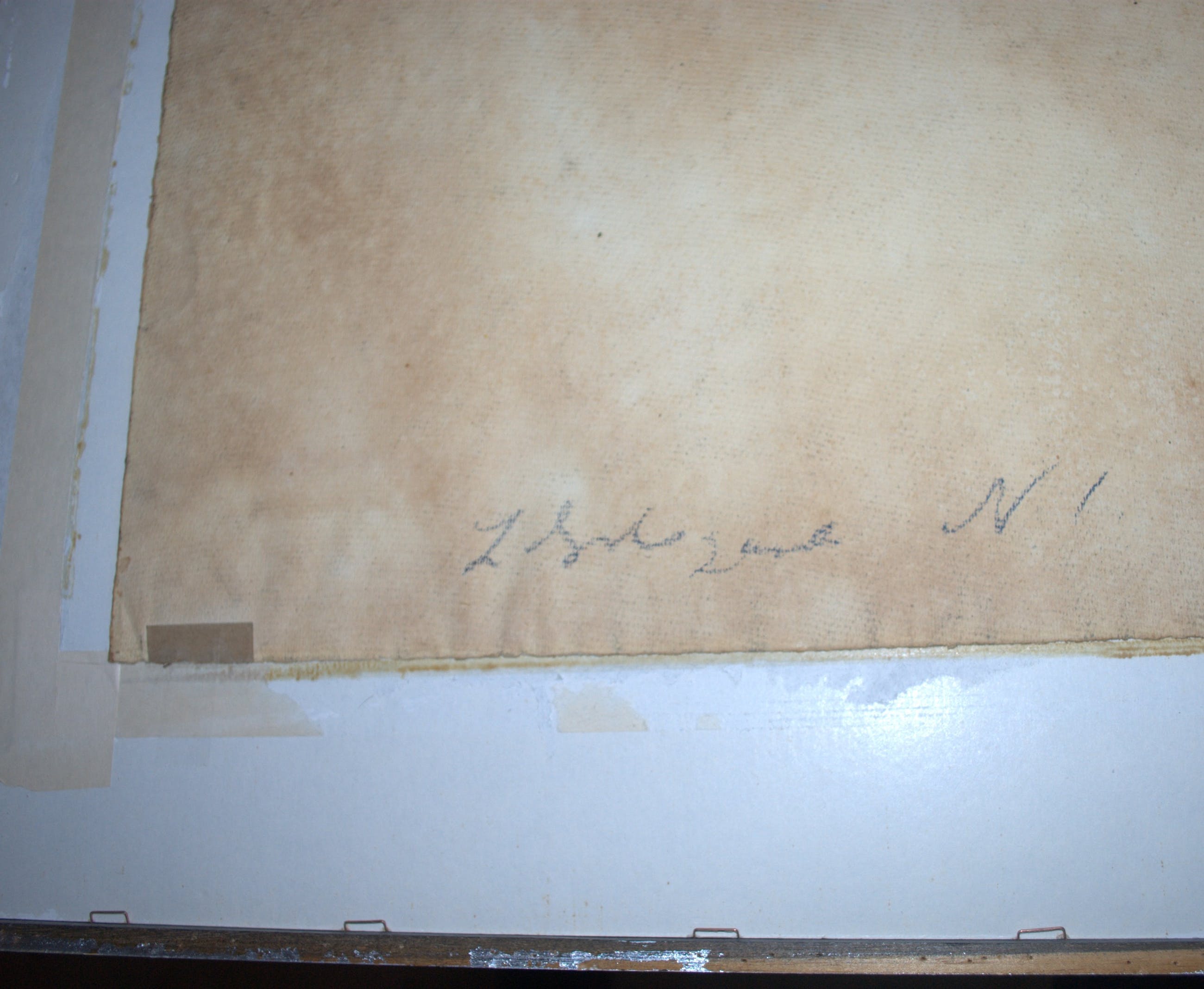 Achter passepartout en glas, in een houten lijst met lichte schade.