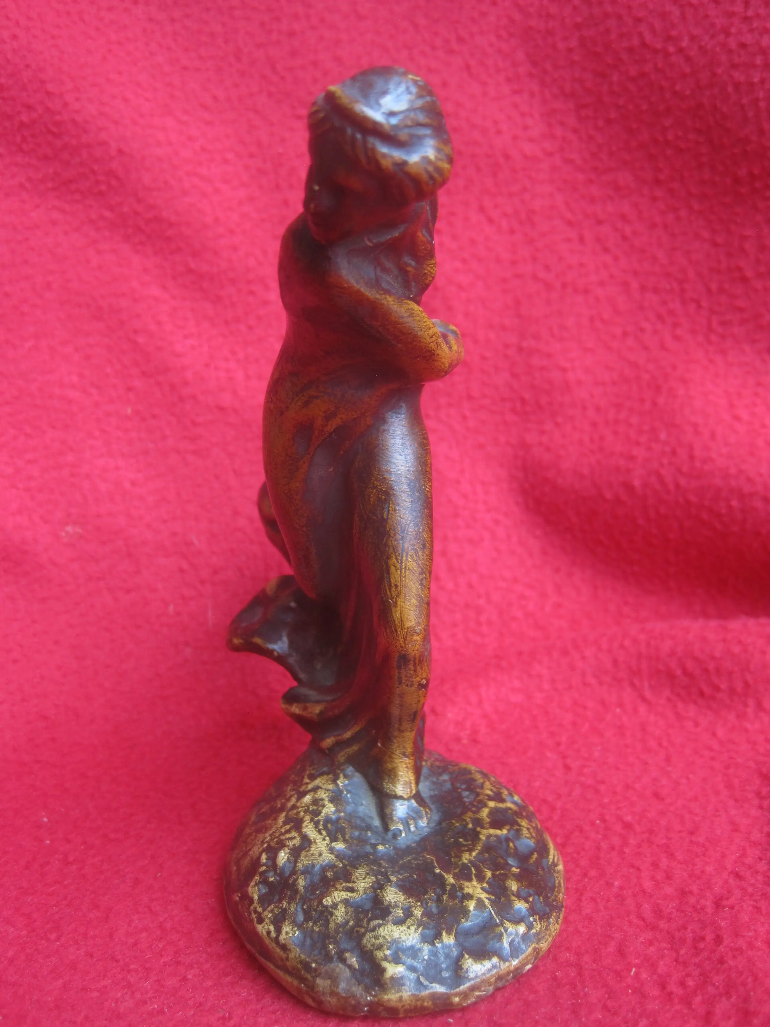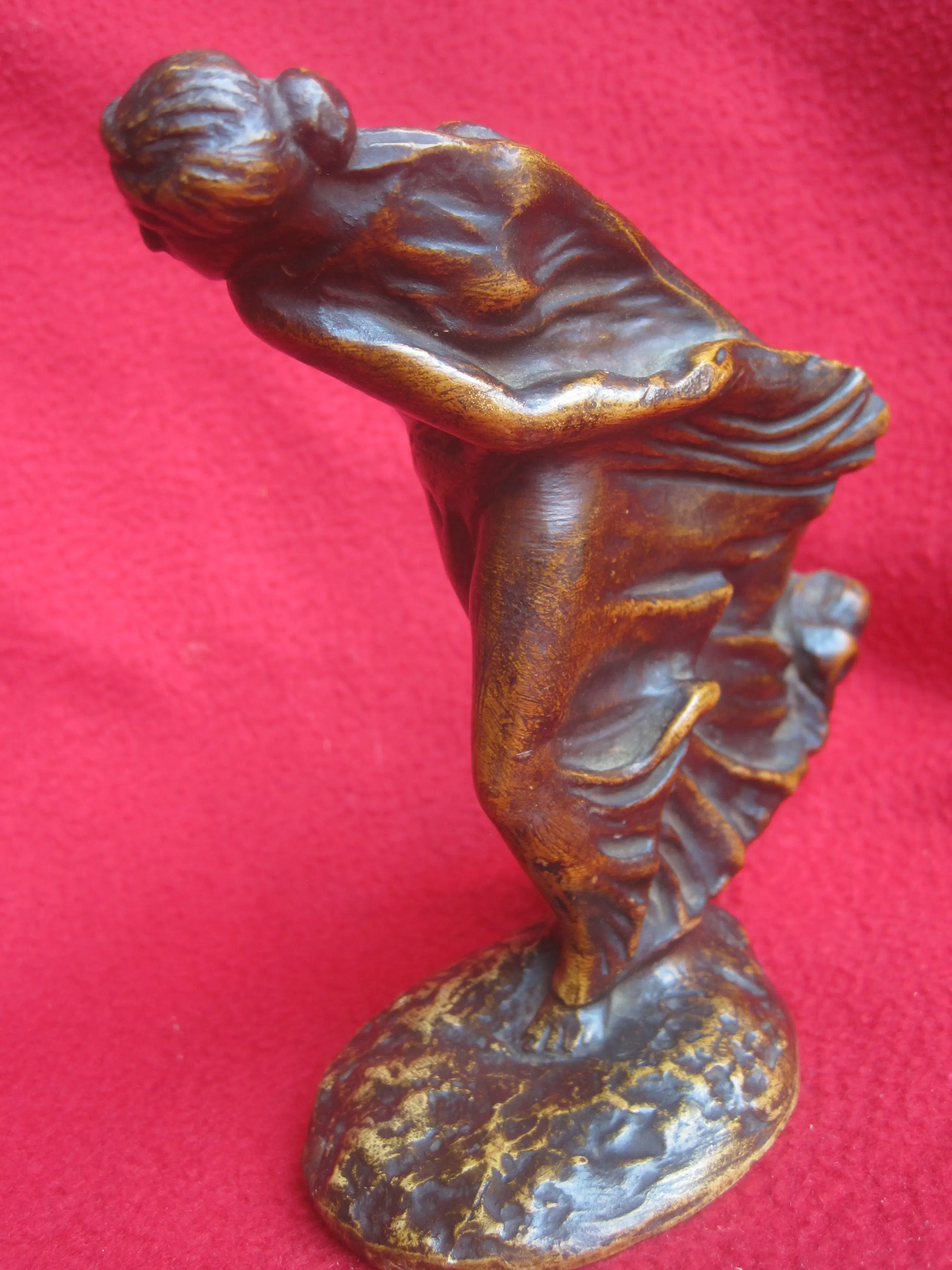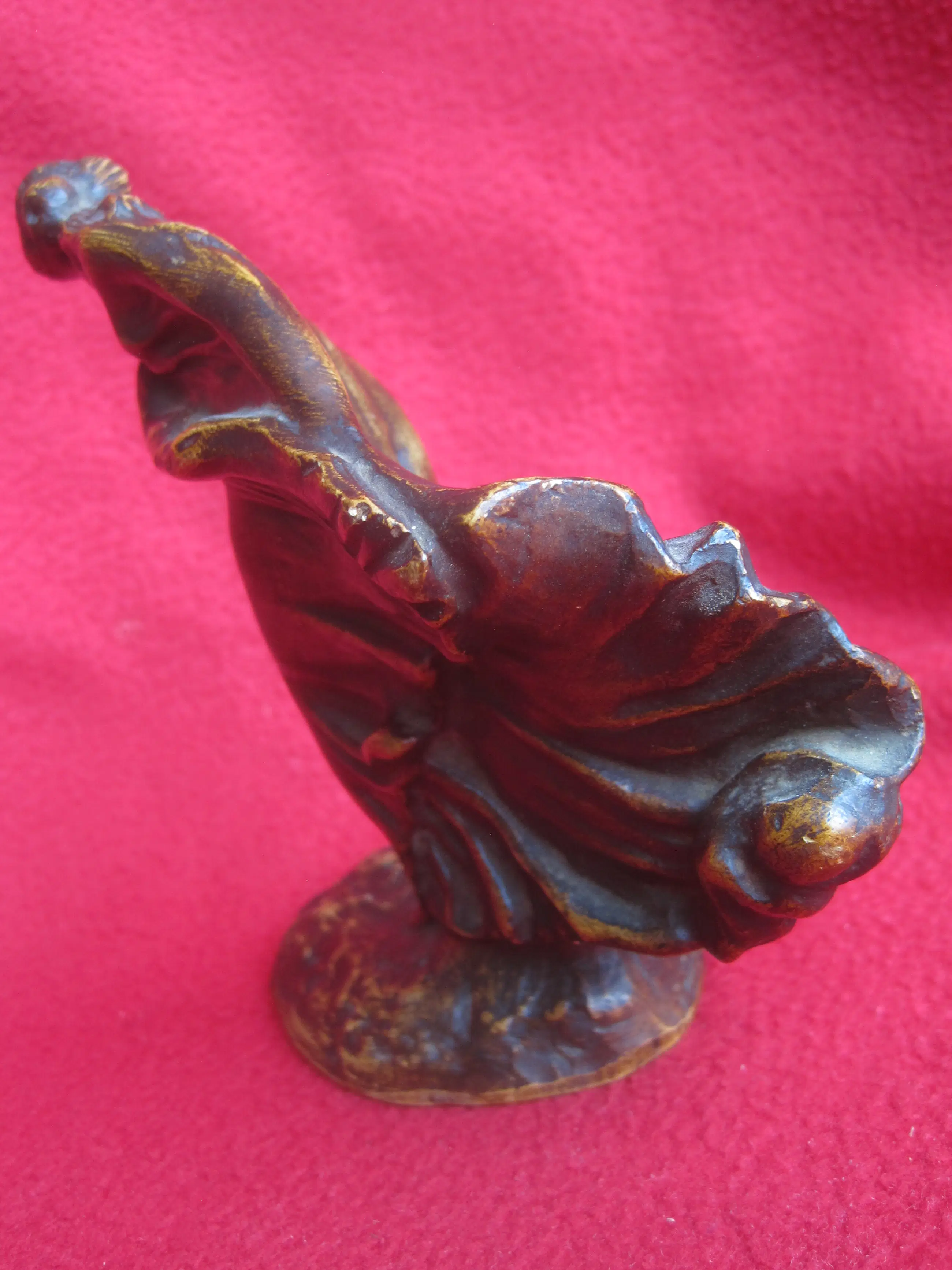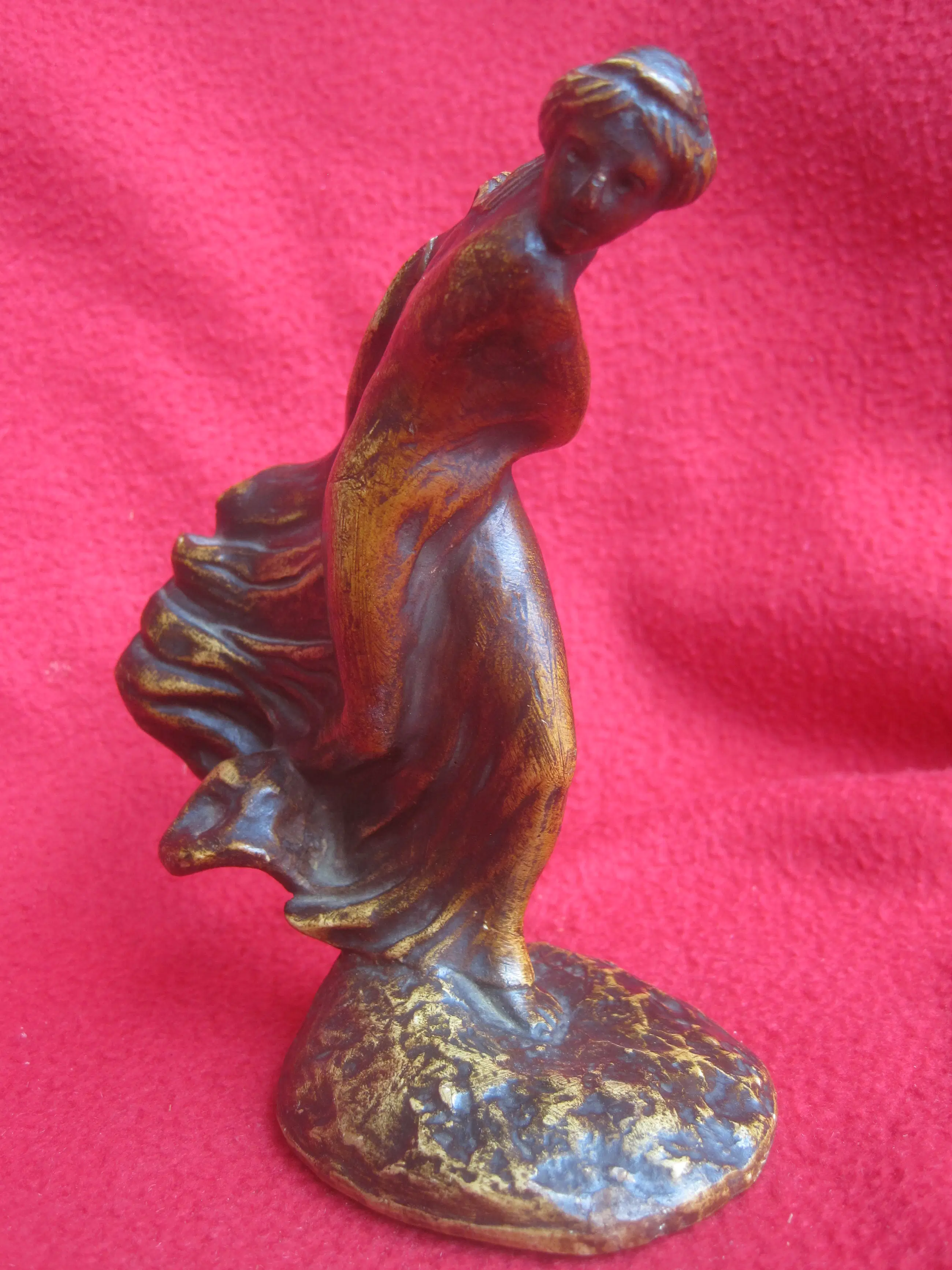 Een sierlijk beeldje van plâtre ( gips ) naar een ontwerp van Leonildo Ginannoni Chapelier ( 1880-1951 ). Léonildo Giannoni-Chapelier (1880-1951), van Italiaanse afkomst maar opgegroeid in België (met name in Luik), was een beeldhouwer actief tijdens de Art-Nouveau en Art-Decoperiode. Zijn werken – vaak vrouwenfiguren of mythologische figuren in brons, soms gepolychromeerd of gepatineerd – rustend op marmeren sokkels. Dit beeldje staat op Flickr.