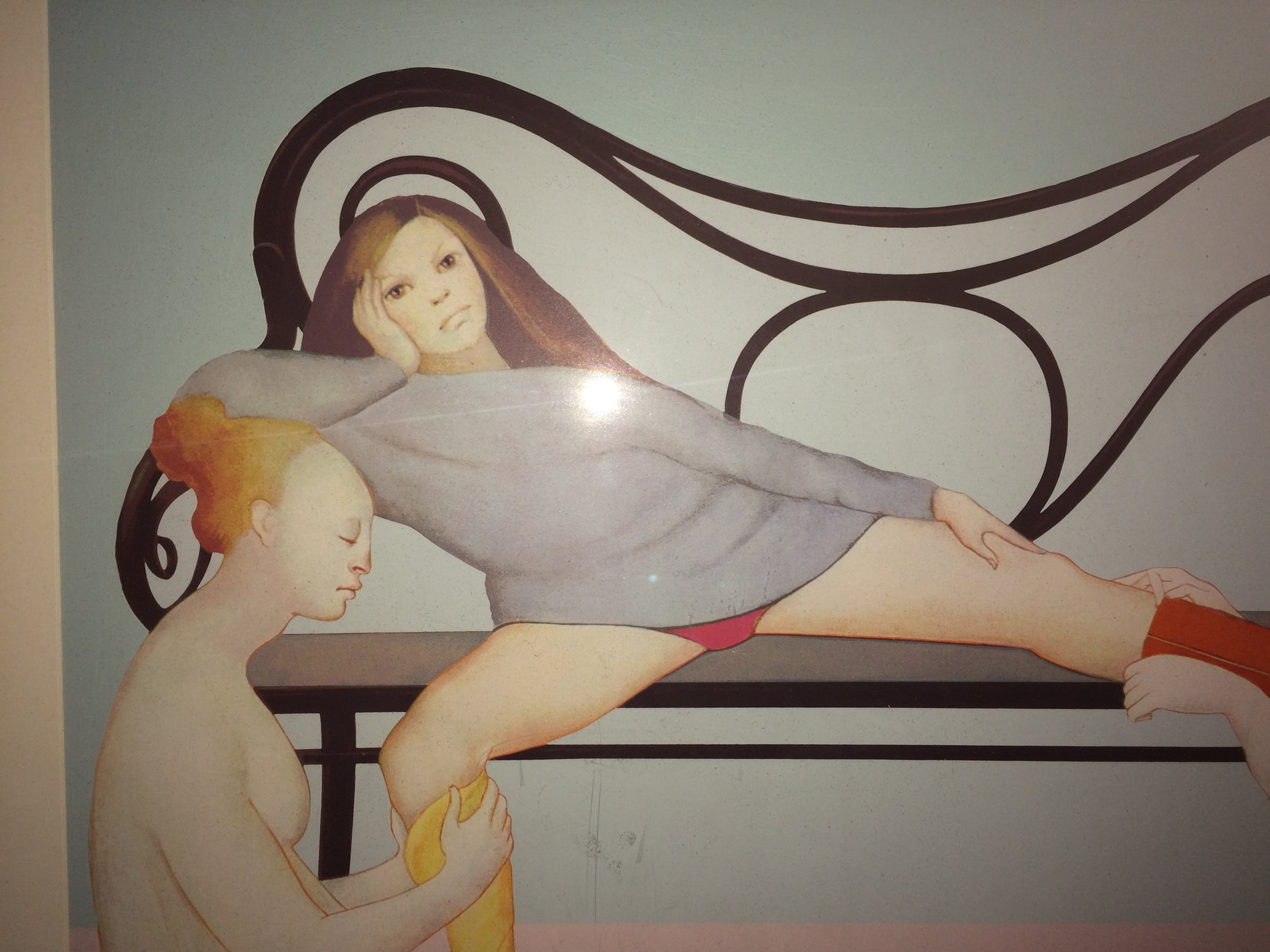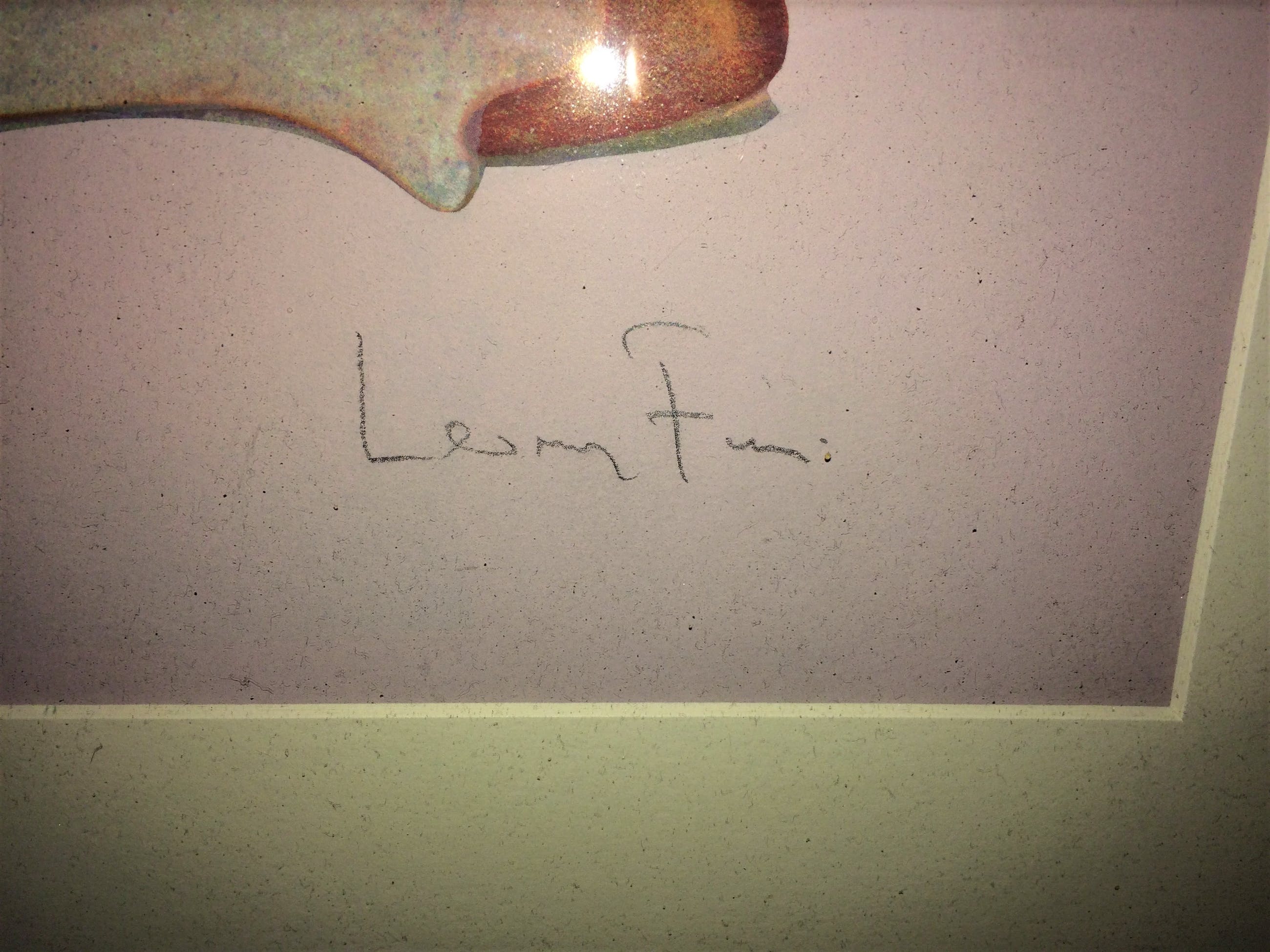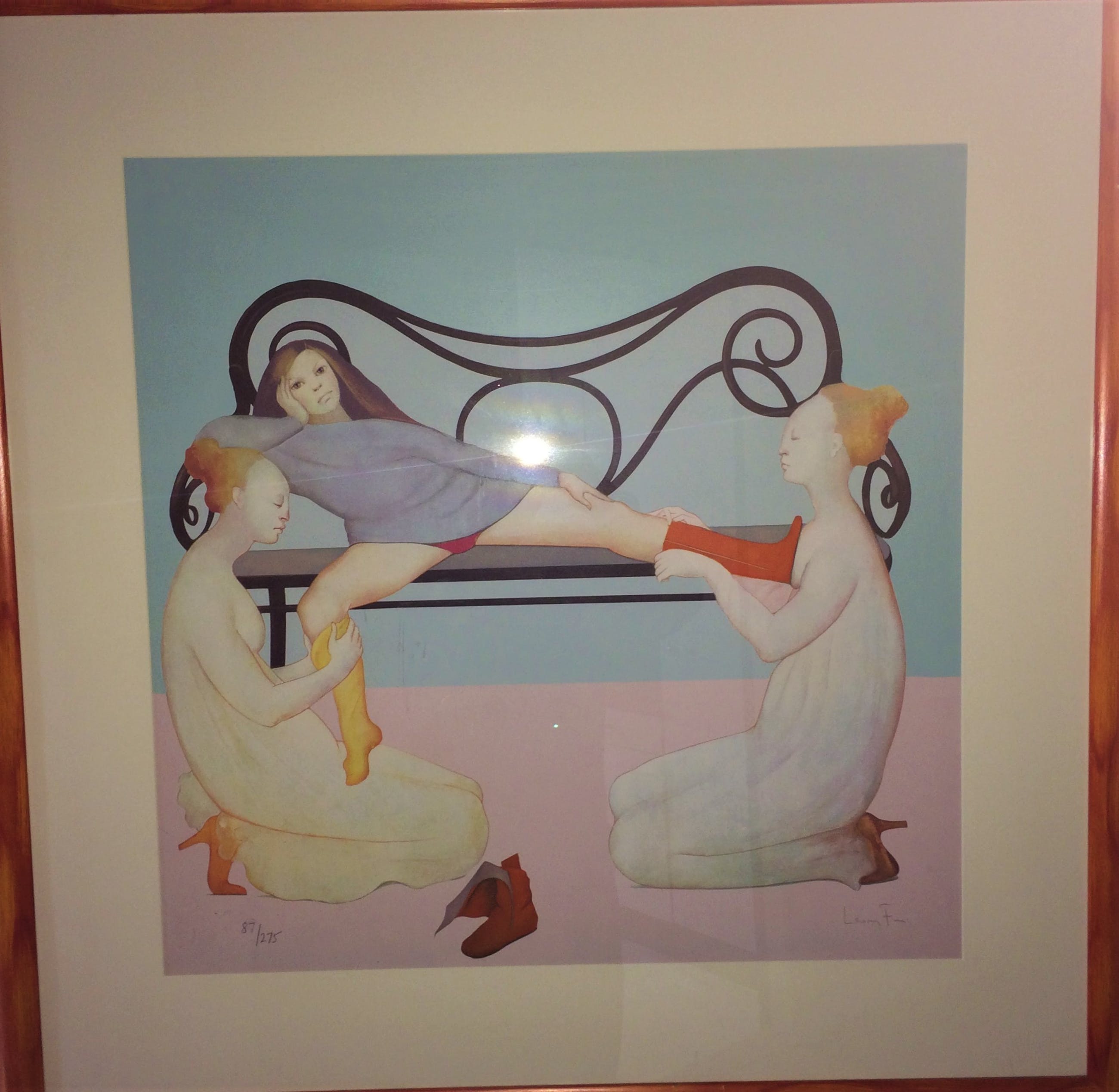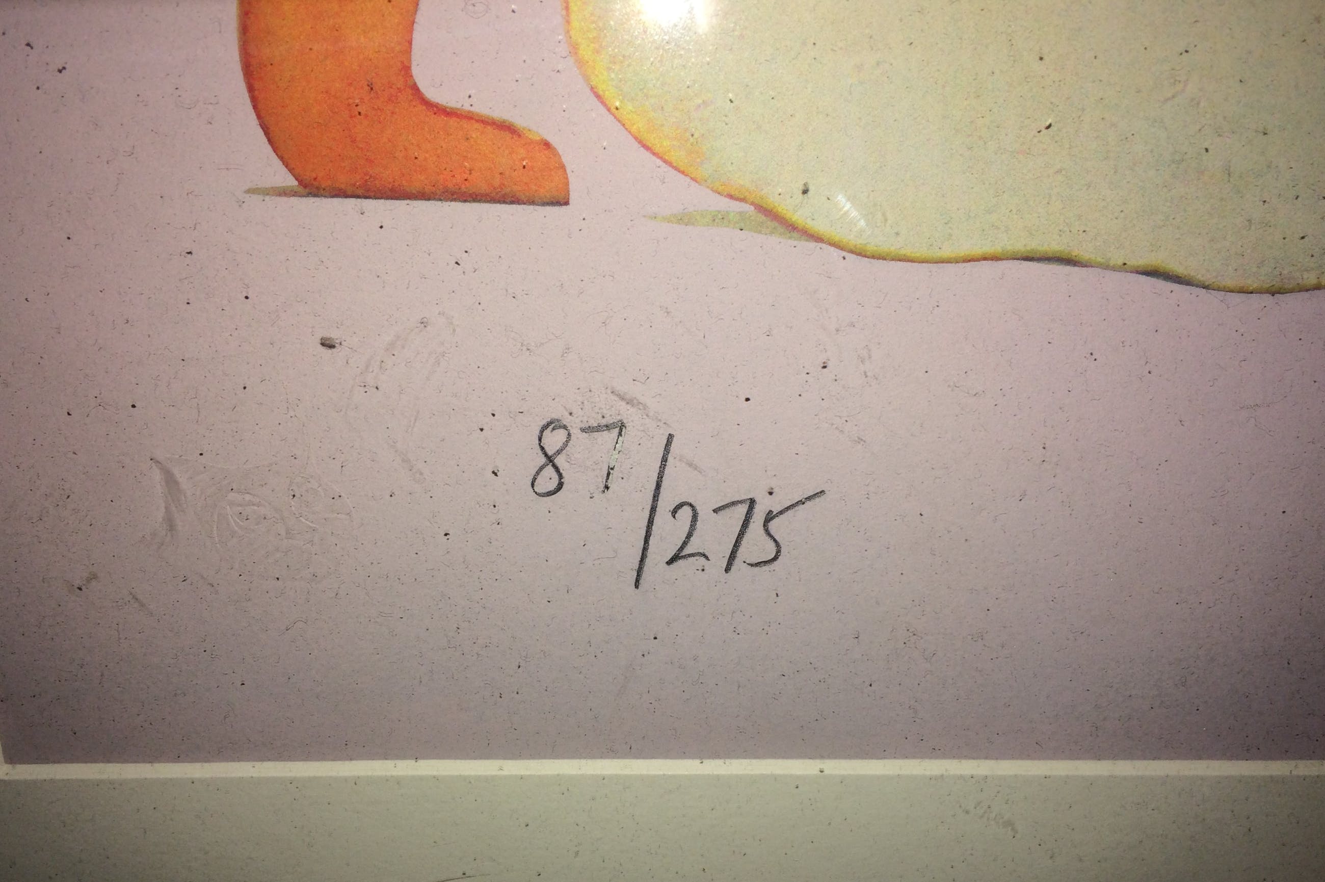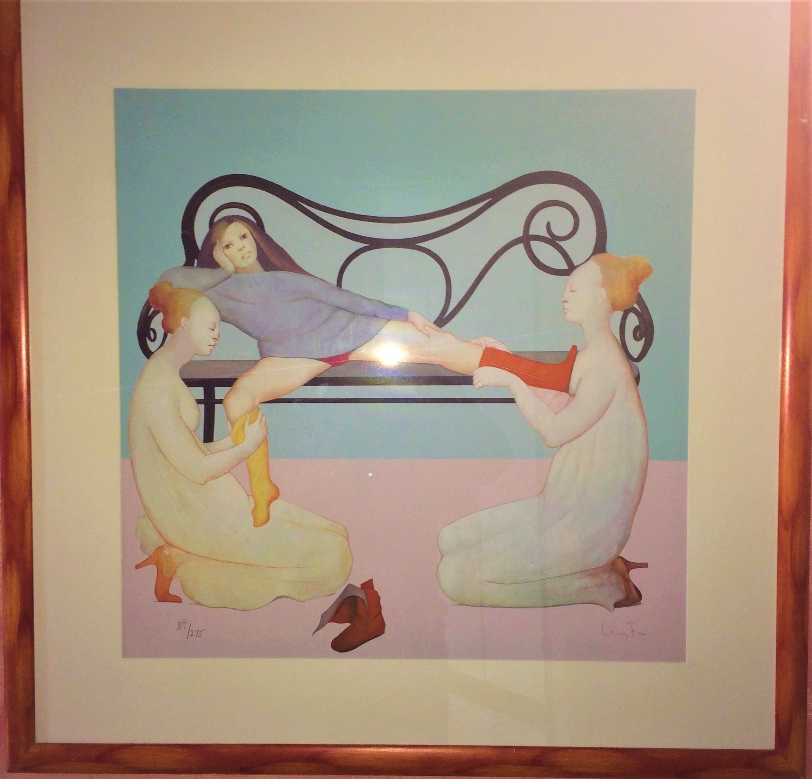 groot ingekaderd achter glas zeefdruk , genummerde oplage gesigneerd onderaan in potlood en genummerd en voorzien van kattestempel. ingelijst grote pass partou in rode moderne lijst. wegens de afmetingen enkel afhalen. 96 cm x 92 cm Leonor Fini bekend kunstenares